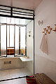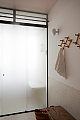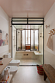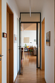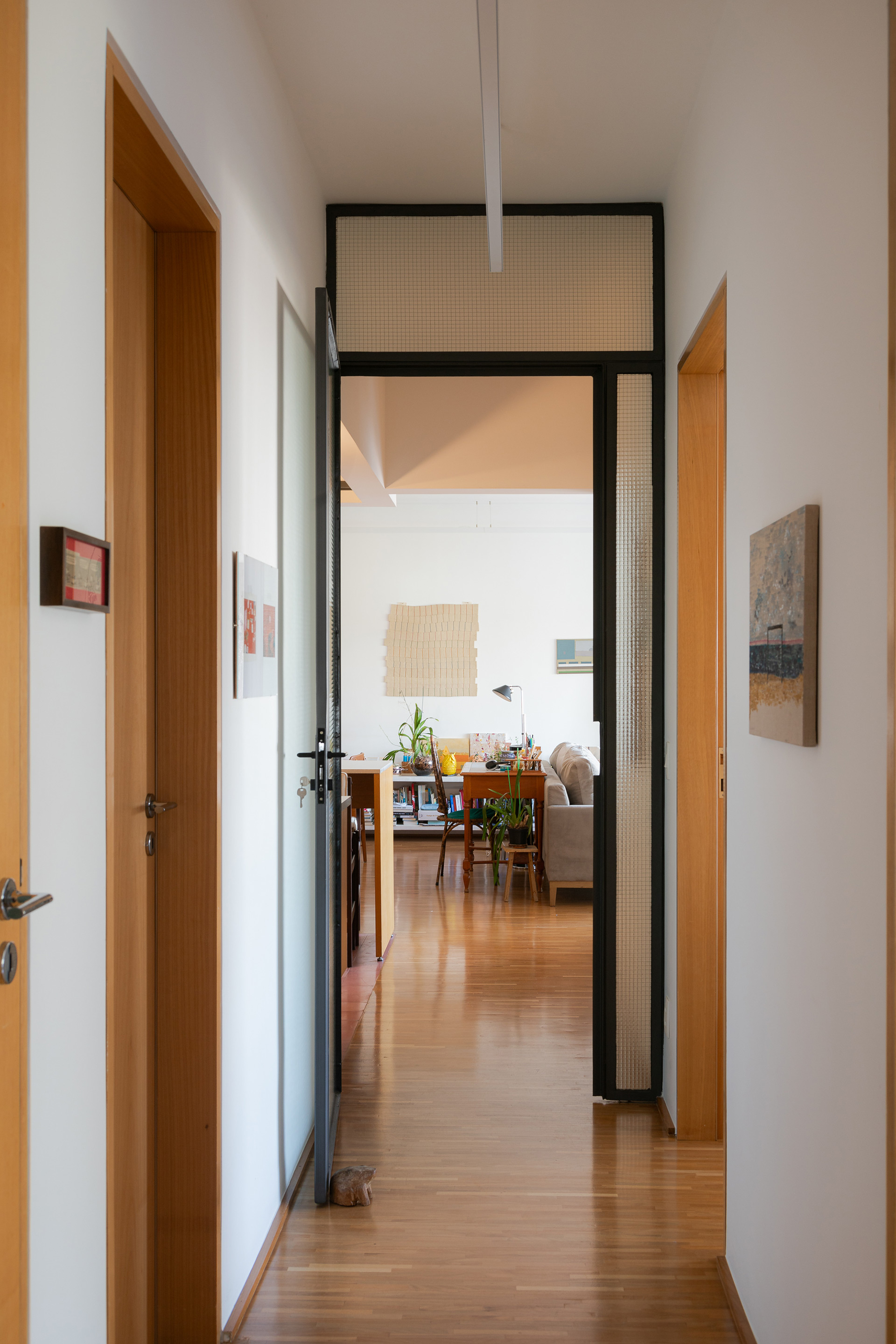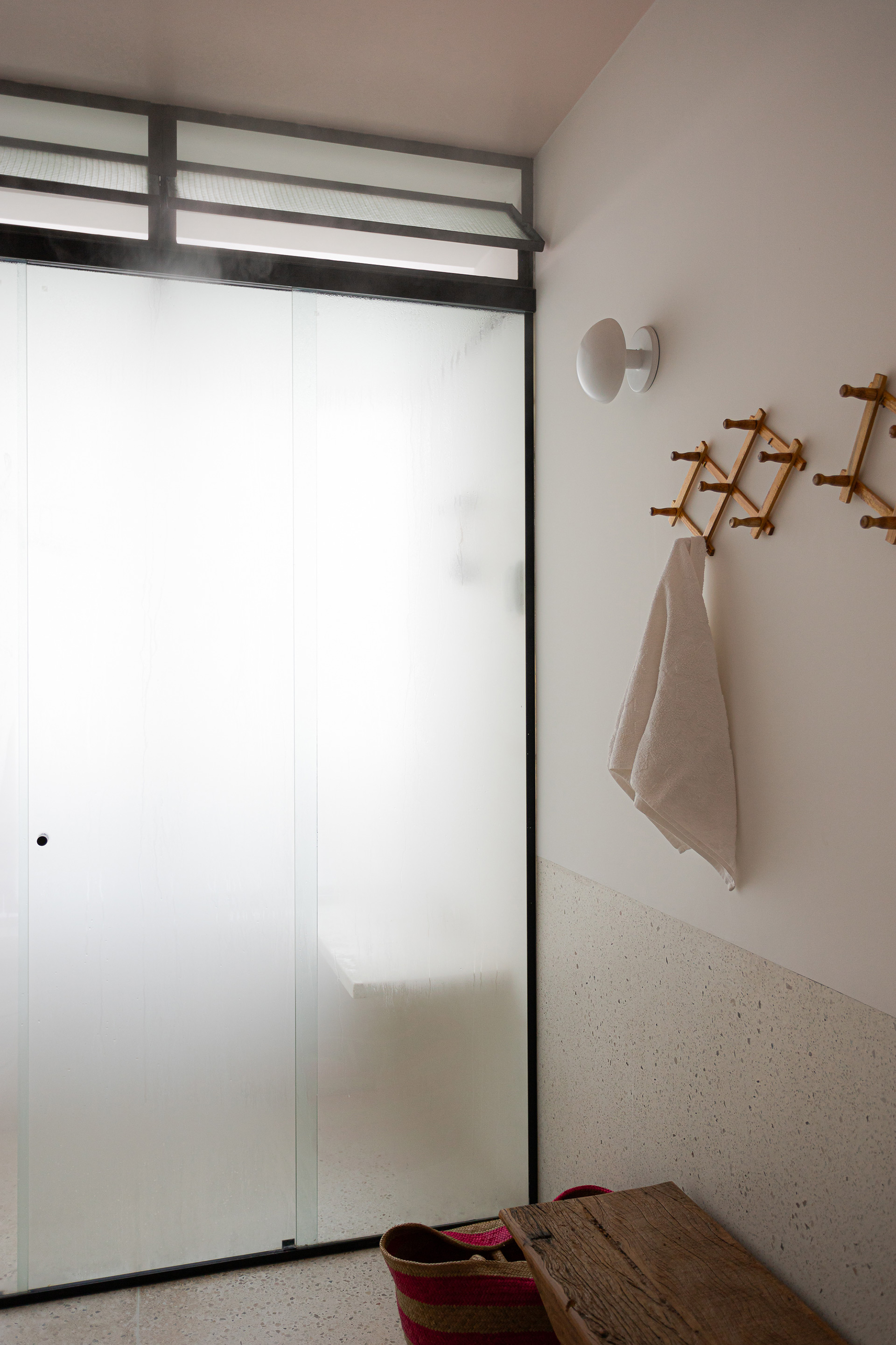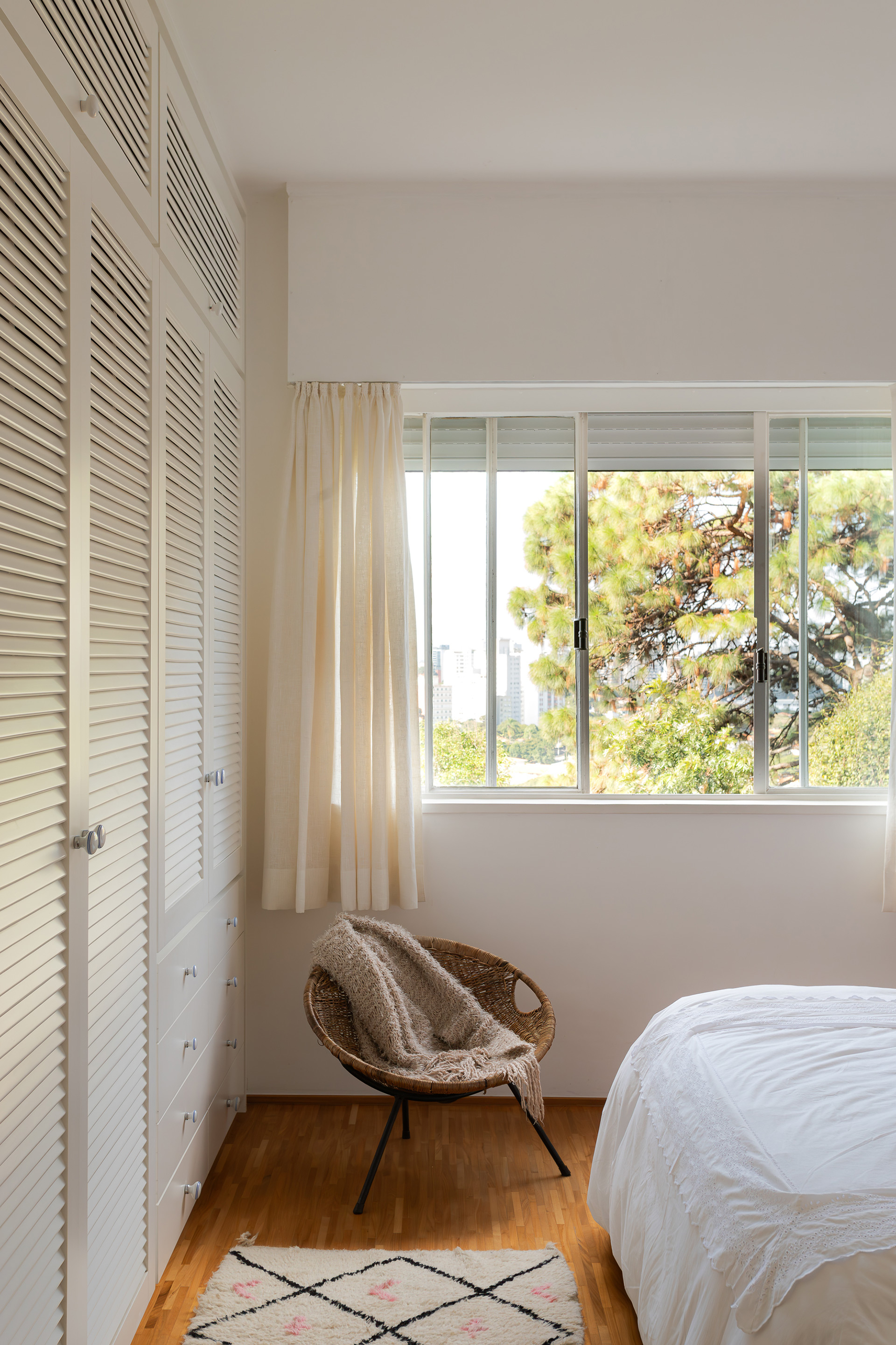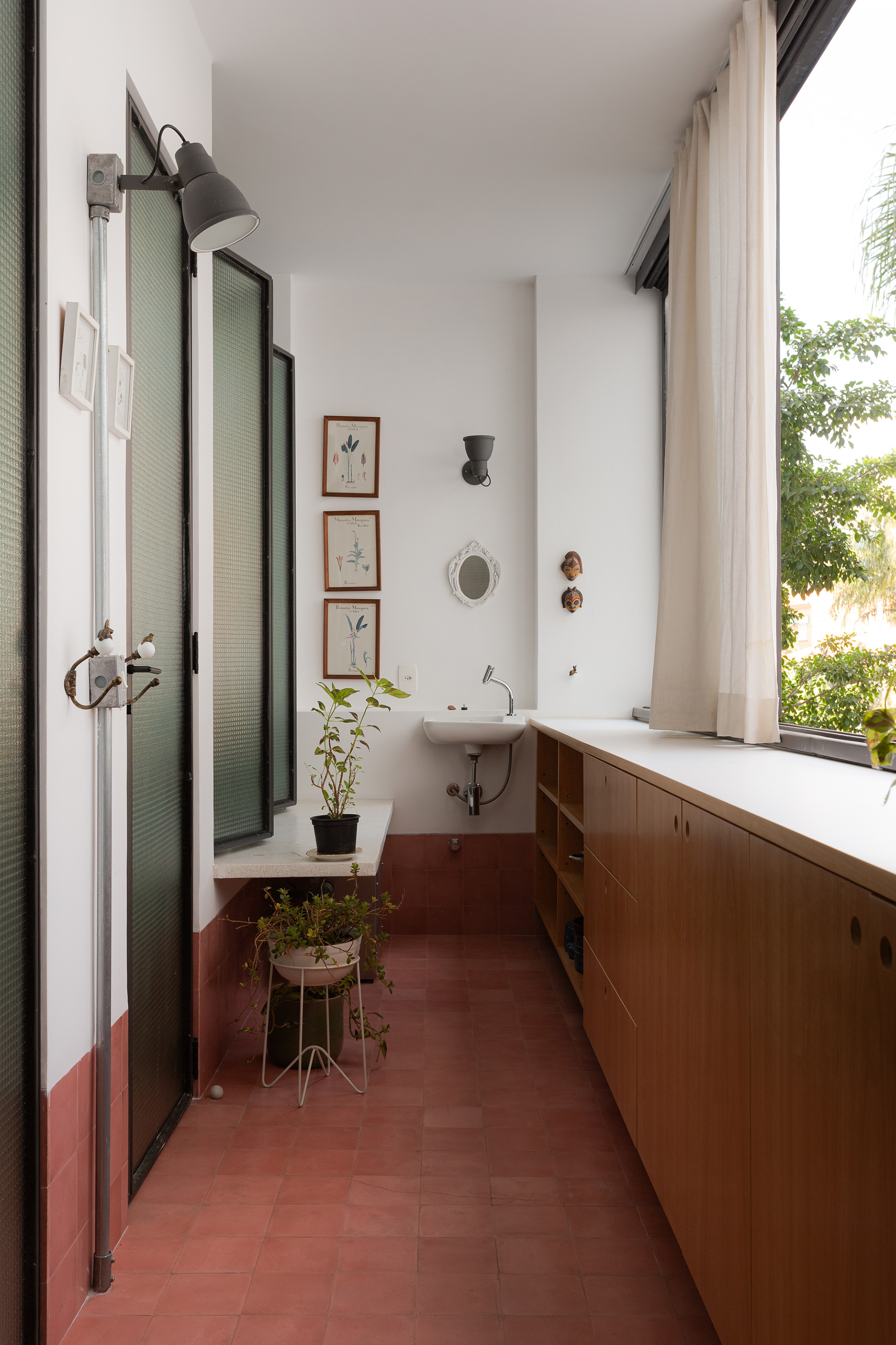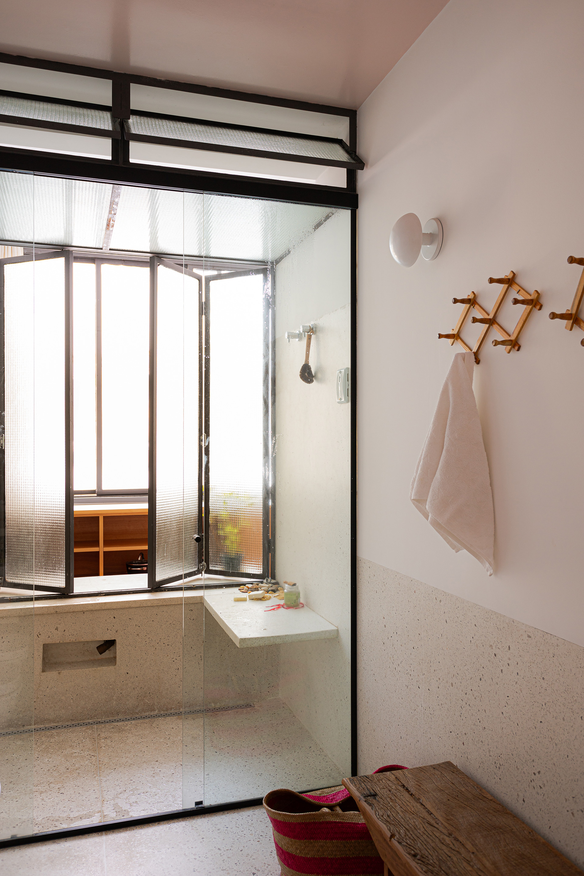 Novas esquadrias foram pensadas para iluminar o banheiro principal e o escritório localizados no centro da planta do apartamento, antes pouco iluminados, além de permitir a conexão franca destes espaços para o ambiente da antiga lavanderia. Duas tipologias foram pensadas, uma em aço e vidro que faz a interface entre os ambientes íntimos e os sociais e outra de madeira clara que fecha os quartos voltados para o corredor. No banheiro, aproveitando a área de chuveiro generosa, foi implantada uma sauna úmida, trazendo um ar de casa e descontração para o apartamento.