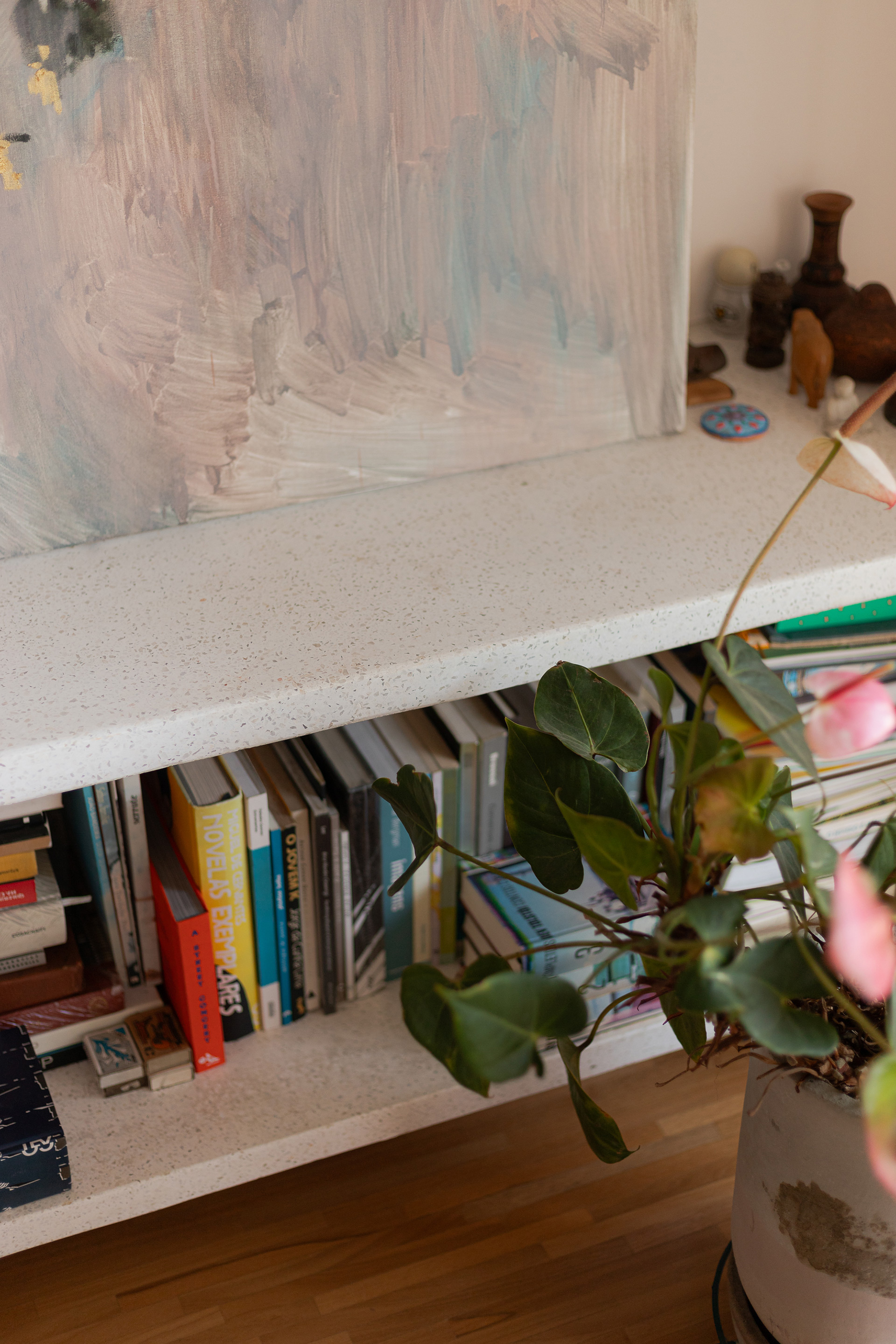 Poucos revestimentos fazem parte da intervenção: na cozinha e varanda secundária utilizamos um ladrilho hidráulico rosa que marca um rodapé alto nas paredes; no banheiro e varanda principal utilizamos o granilite no mesmo tom daquele encontrado nos corredores do próprio edifício. No restante do apartamento um piso claro de madeira Tauari faz jogo com as portas das áreas íntimas trazendo claridade e aconchego ao conjunto.