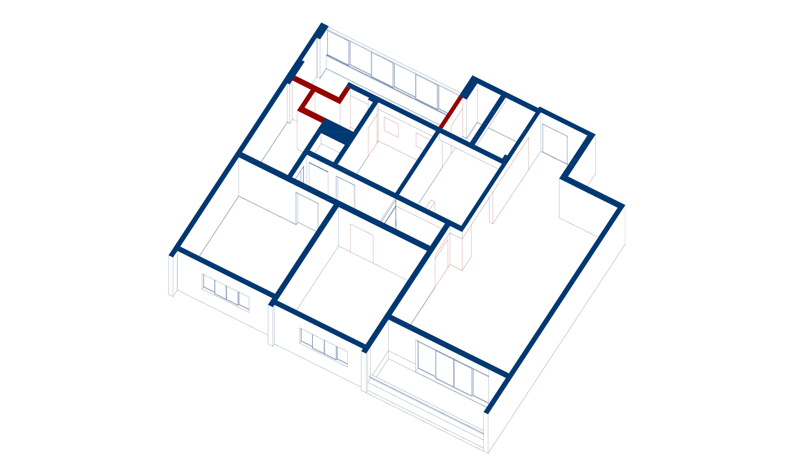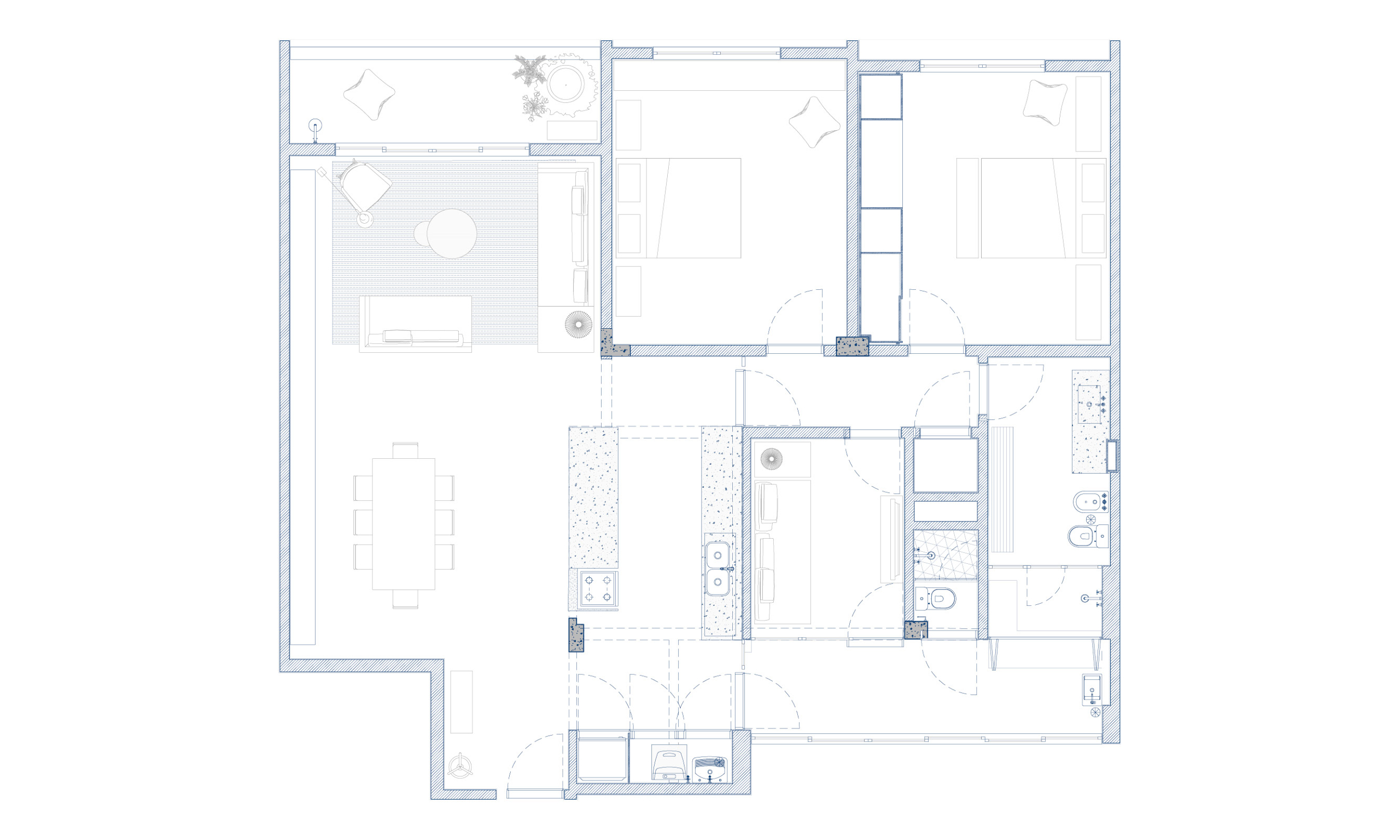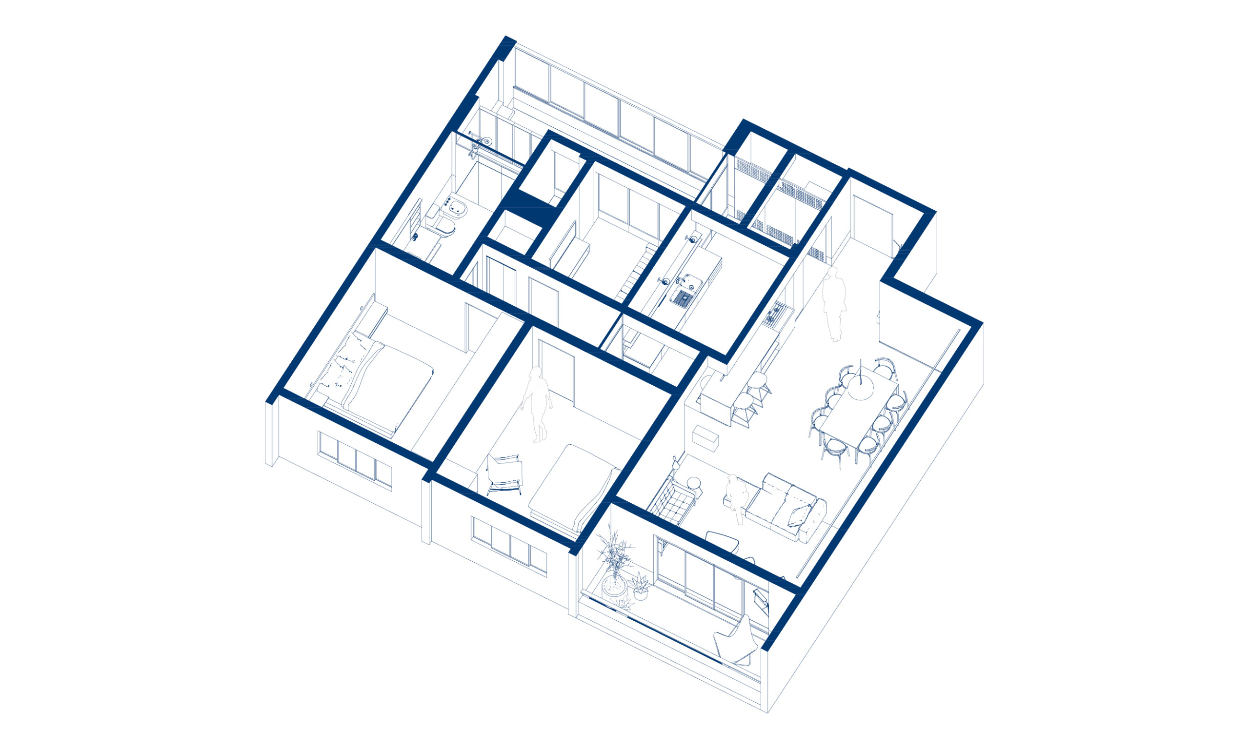 A intervenção proposta se voltou principalmente para a área da cozinha e da área de serviço: a cozinha escura foi conectada com a sala e a área de serviço compactada ao mínimo de forma que o antigo e generoso espaço agora pode ser utilizado como uma segunda varanda interna do apartamento. As generosas dimensões dos quartos principais foram mantidas, assim como o amplo banheiro, mantendo a generosidade da área íntima original do apartamento.