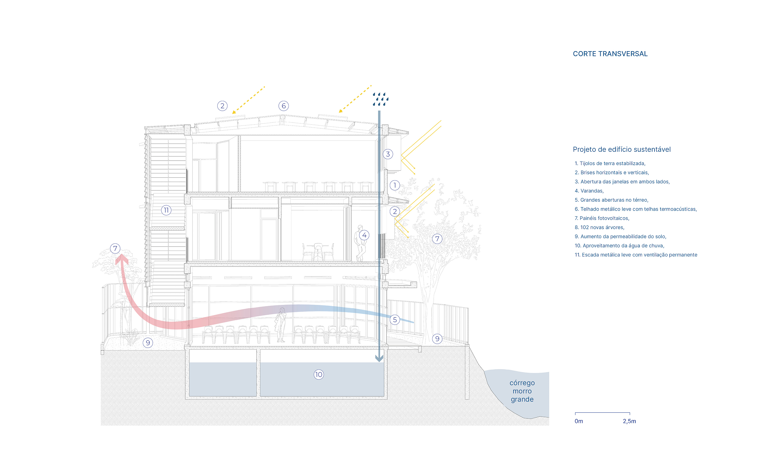 A ventilação cruzada, proporcionada por aberturas em fachadas opostas, renova constantemente o ar dos ambientes, contribuindo para a qualidade do ambiente interno e minimizando a necessidade de resfriamento artificial. No térreo, onde foram implantados os programas de uso coletivo, grandes aberturas conectam o edifício ao córrego Morro Grande, promovendo a circulação de ar resfriado e integrando o equipamento à paisagem local. A cobertura metálica com telhas termoacústicas ajuda a reduzir a massa térmica do edifício, permitindo que ele se resfrie naturalmente durante a noite ou em períodos de chuva.