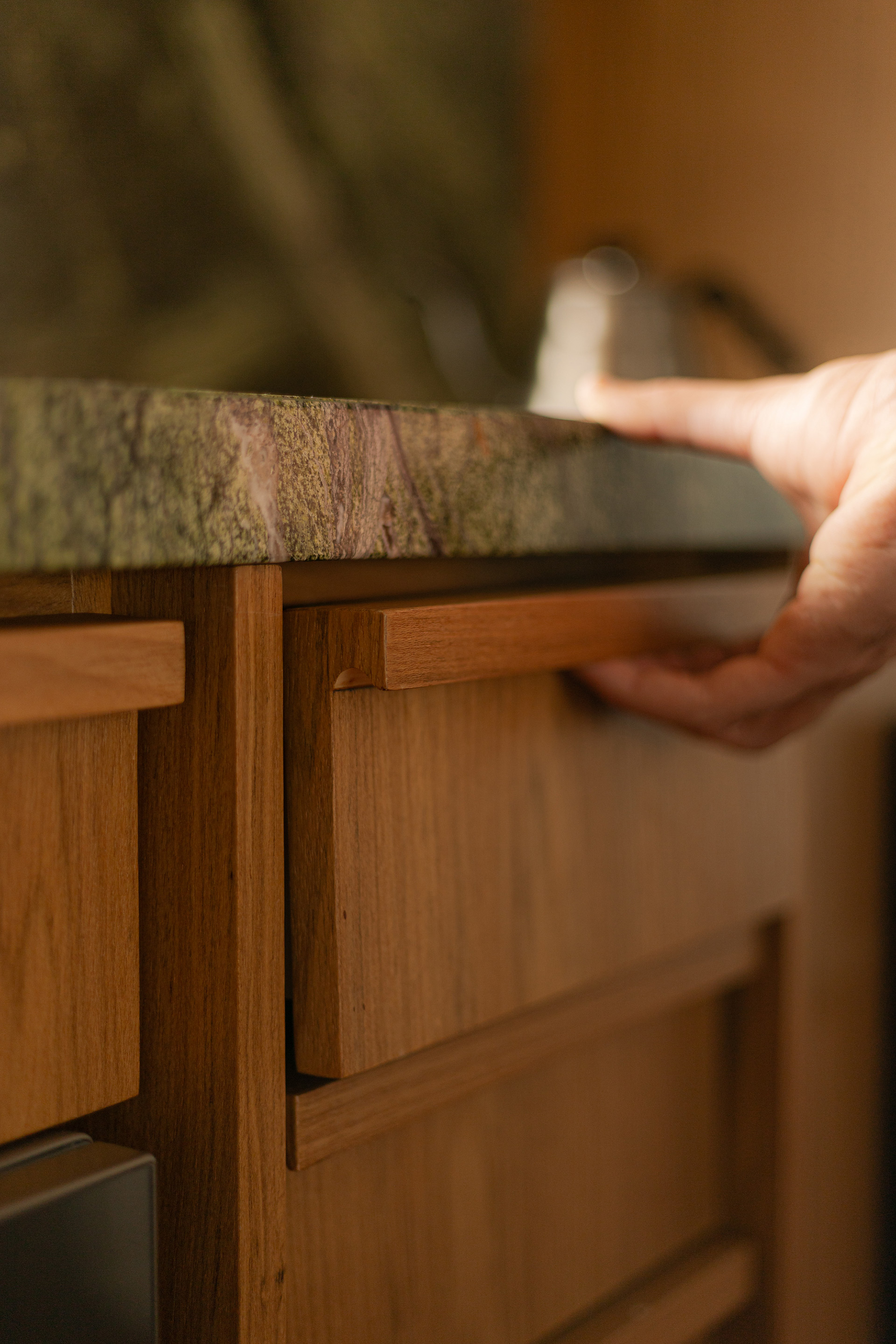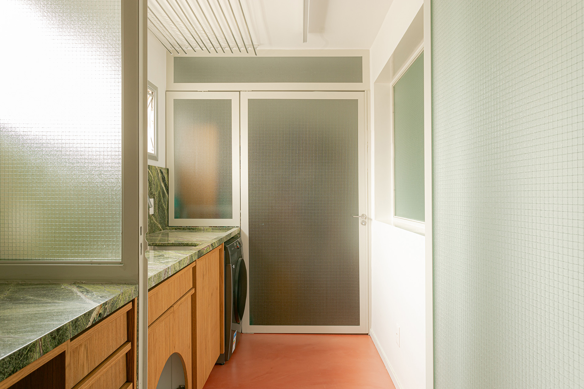 A reorganização dos espaços também permitiu adaptar o antigo banheiro de serviço, pequeno e mal posicionado, em um lavabo social mais funcional e acessível.