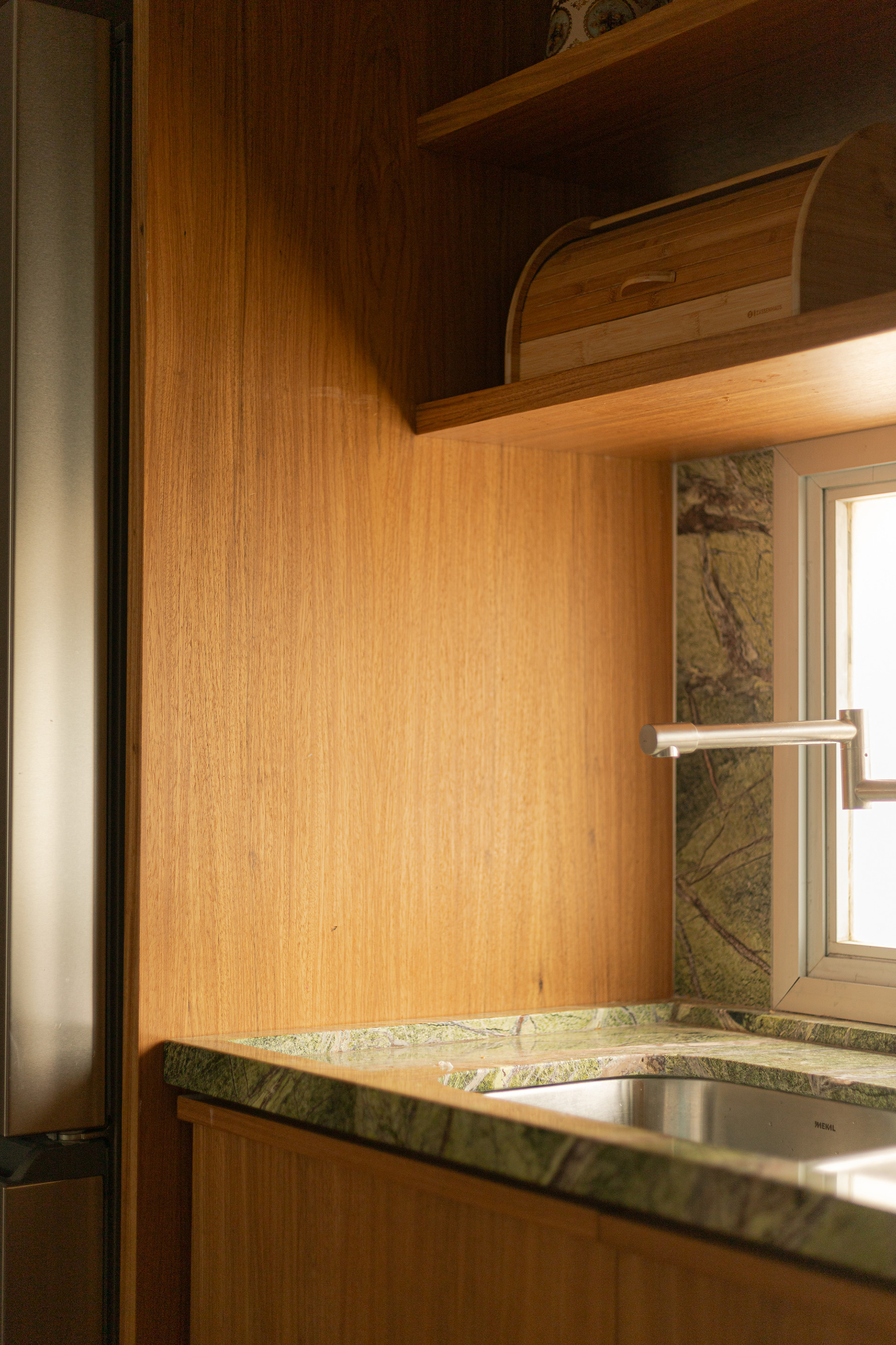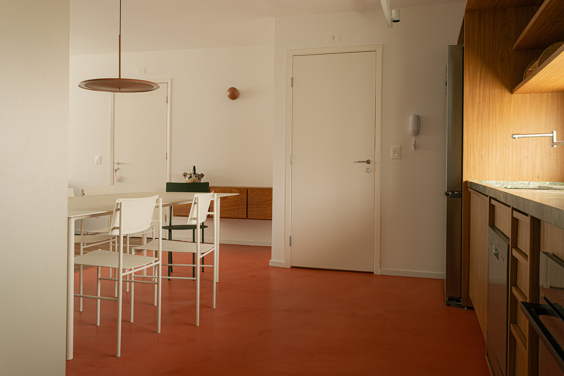 A principal transformação consistiu na integração entre sala e cozinha, substituindo os ambientes fechados da planta original por um espaço amplo, contínuo e iluminado. A nova configuração permite que a luz da manhã, vinda dos dormitórios, e a luz da tarde, pelas áreas de serviço, atravessem os ambientes ao longo do dia.
