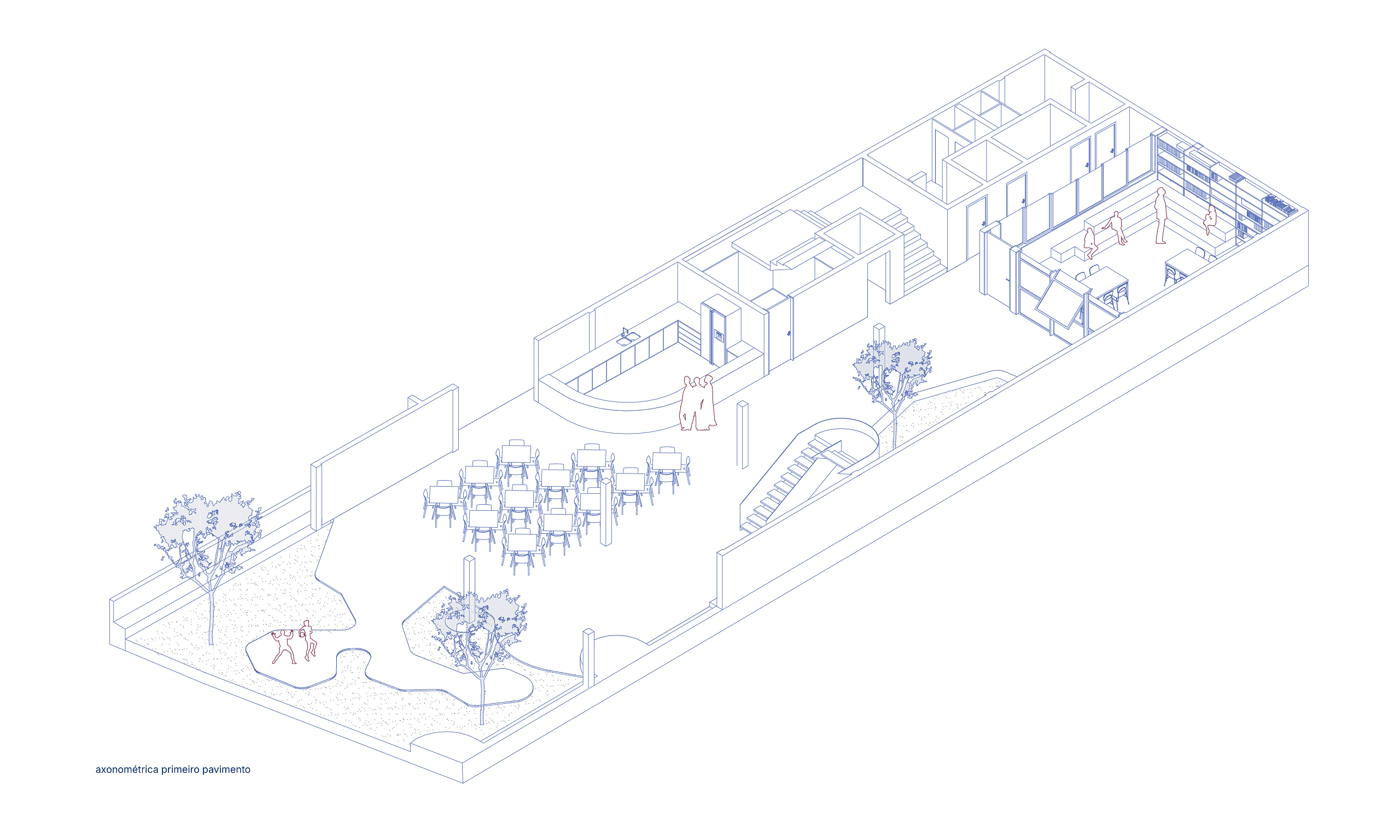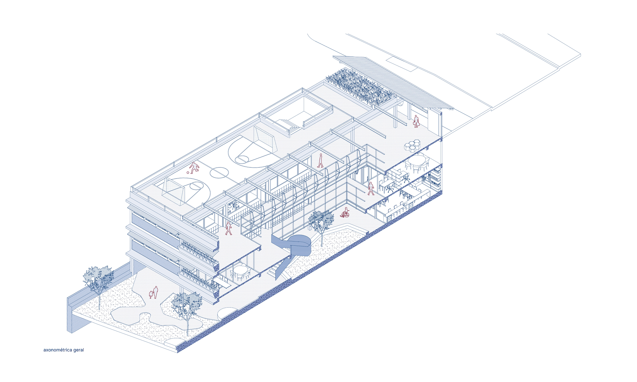 Junto a esse átrio, no nível inferior, foi implantado um jardim que permite a aproximação da vegetação aos ambientes internos da escola. Para sua cobertura, foi desenhado um sistema que possibilita a entrada controlada de luz natural, sem causar desconforto aos usuários, ao mesmo tempo em que garante a ventilação permanente desse espaço, entendido como o coração do edifício.