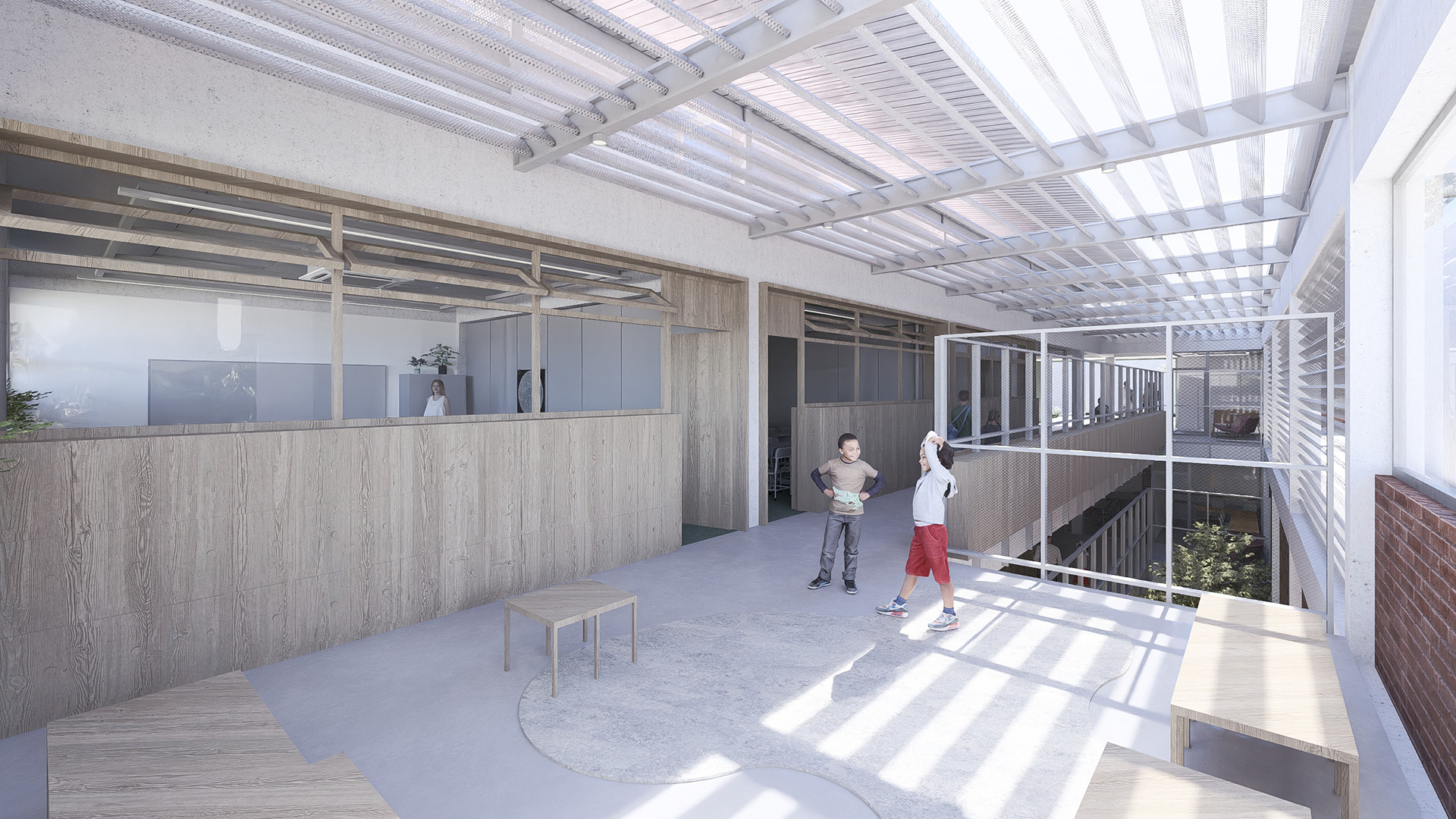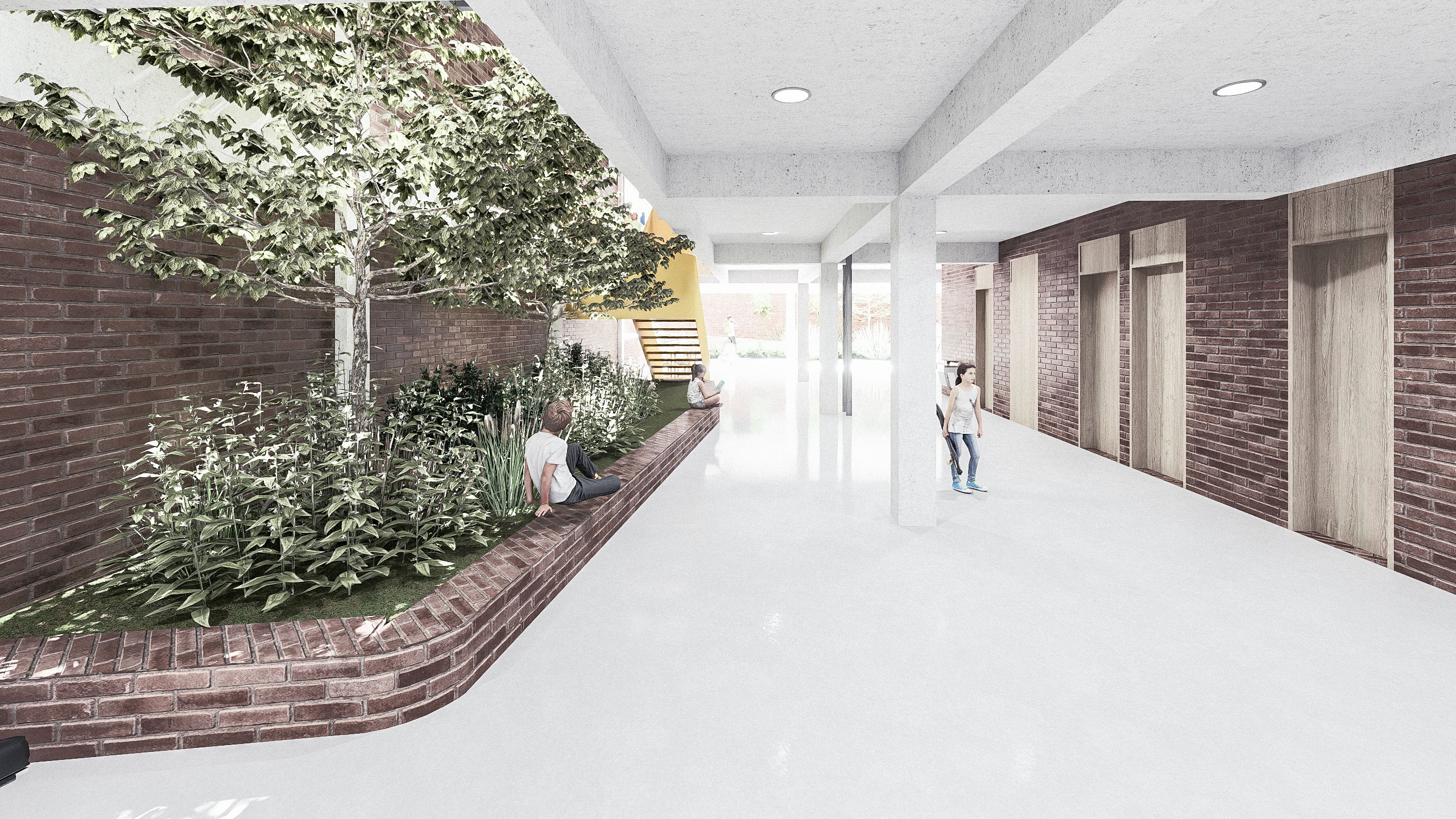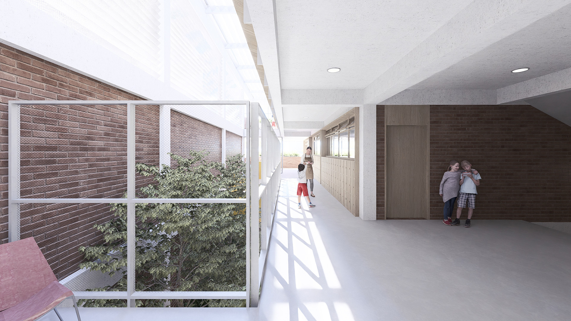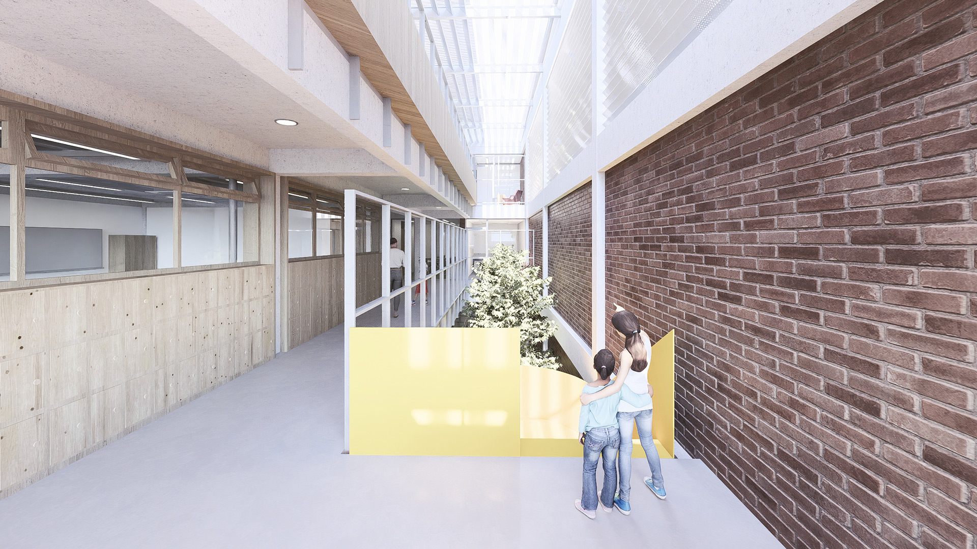 Dadas as restrições de gabarito e as dimensões reduzidas do lote, o projeto buscou resolver a iluminação e a ventilação naturais dos ambientes à medida que escavações no terreno se mostraram necessárias. Nesse sentido, foi criado um grande átrio lateral, para o qual se voltam as circulações dos diferentes pavimentos e a partir do qual é possível perceber e compreender a escola como um todo, superando a fragmentação frequentemente associada a edifícios verticais. Ao longo desse átrio foram implantadas varandas cobertas, concebidas como espaços intermediários destinados ao encontro e ao trabalho em pequenos grupos fora da sala de aula.