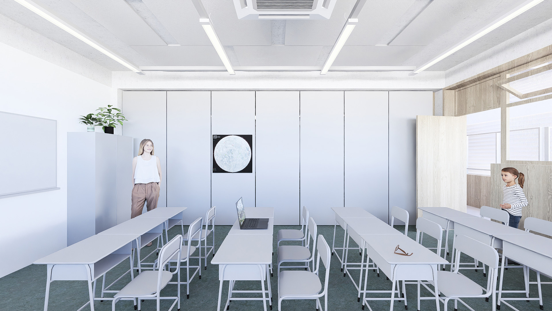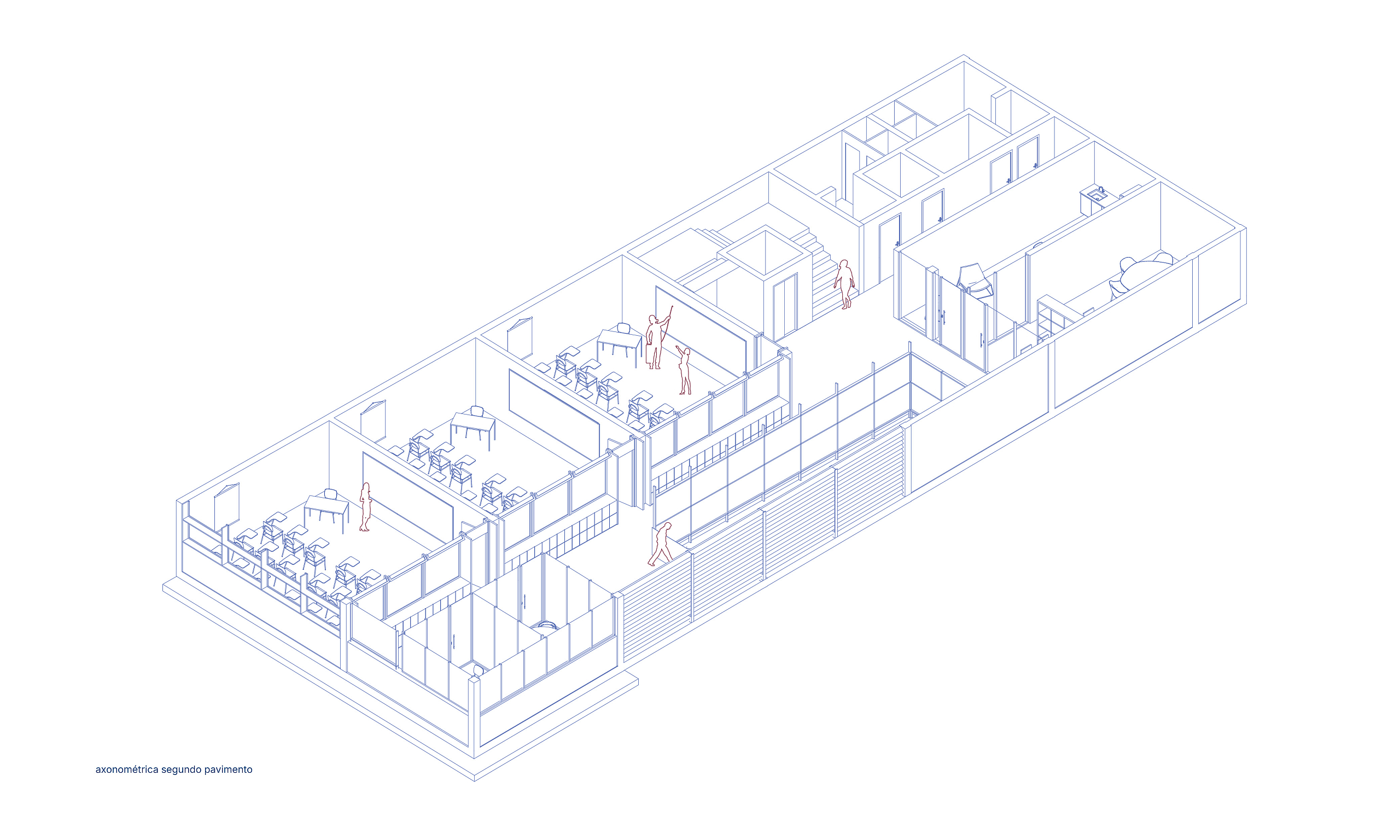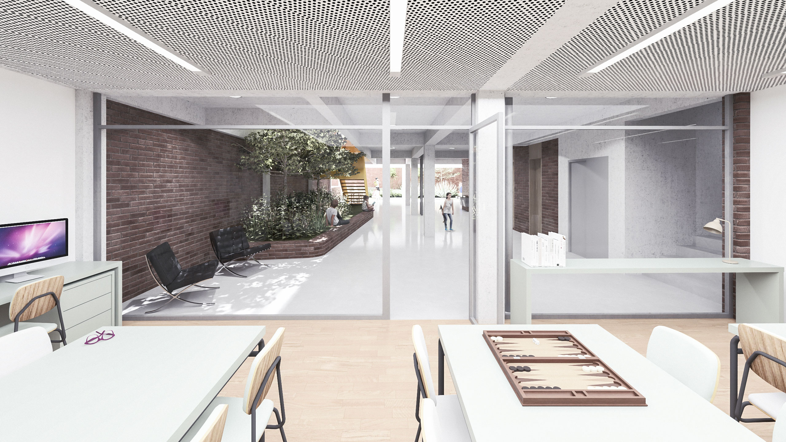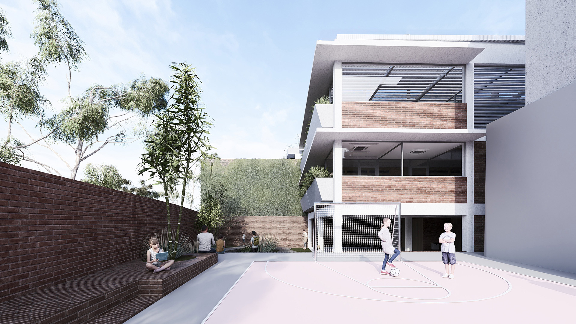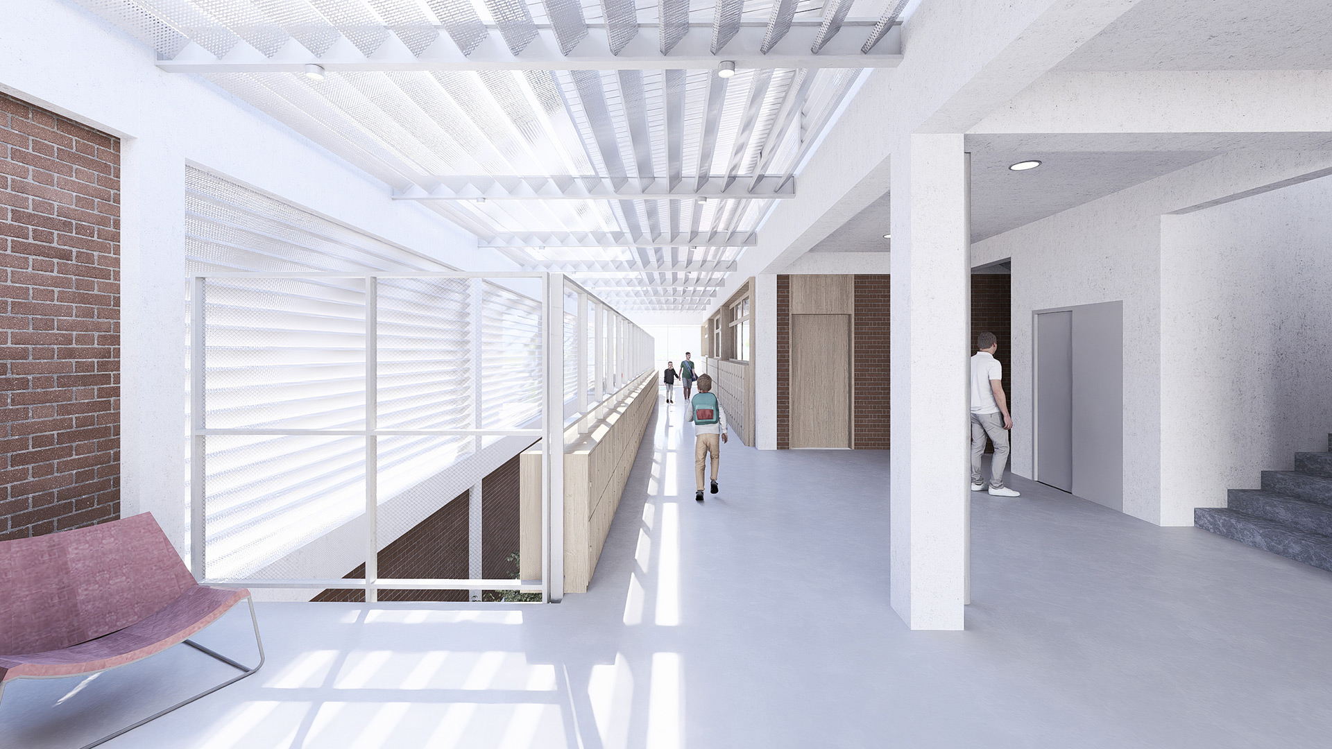 Dadas as restrições de gabarito e as dimensões reduzidas do lote, o projeto buscou resolver a iluminação e a ventilação naturais dos ambientes à medida que escavações no terreno se mostraram necessárias. Nesse sentido, foi criado um grande átrio lateral, para o qual se voltam as circulações dos diferentes pavimentos e a partir do qual é possível perceber e compreender a escola como um todo, superando a fragmentação frequentemente associada a edifícios verticais. Ao longo desse átrio foram implantadas varandas cobertas, concebidas como espaços intermediários destinados ao encontro e ao trabalho em pequenos grupos fora da sala de aula.