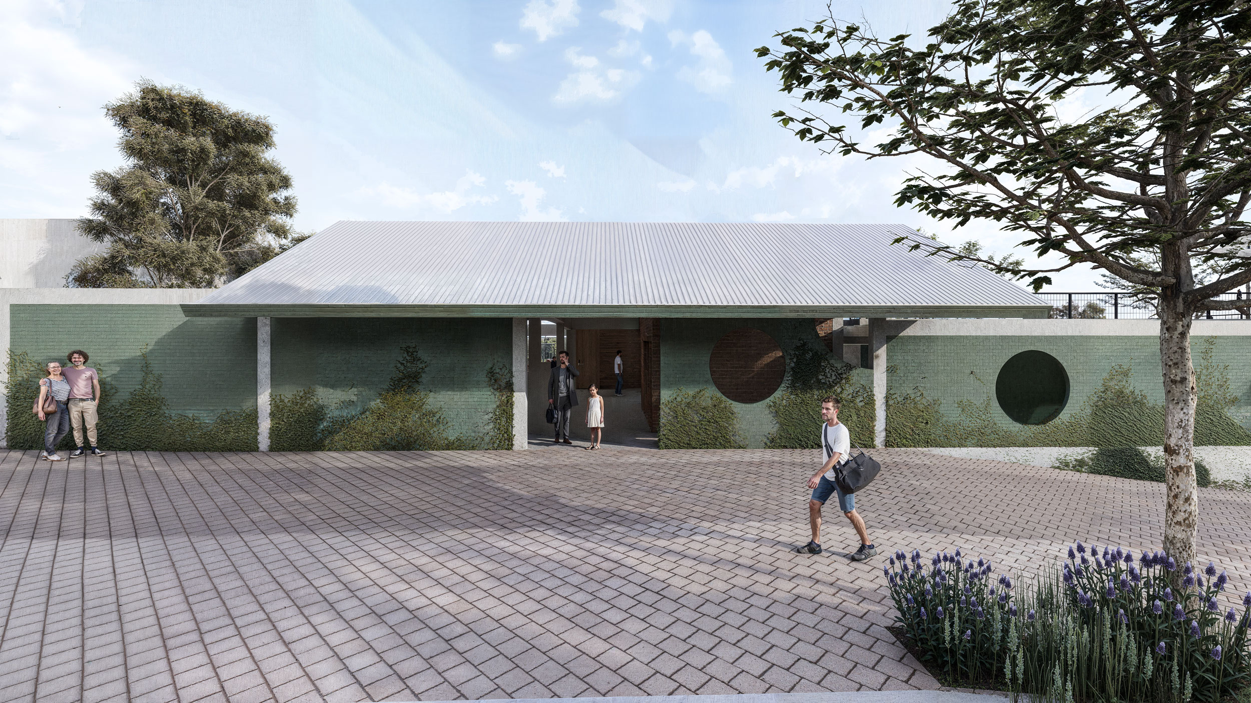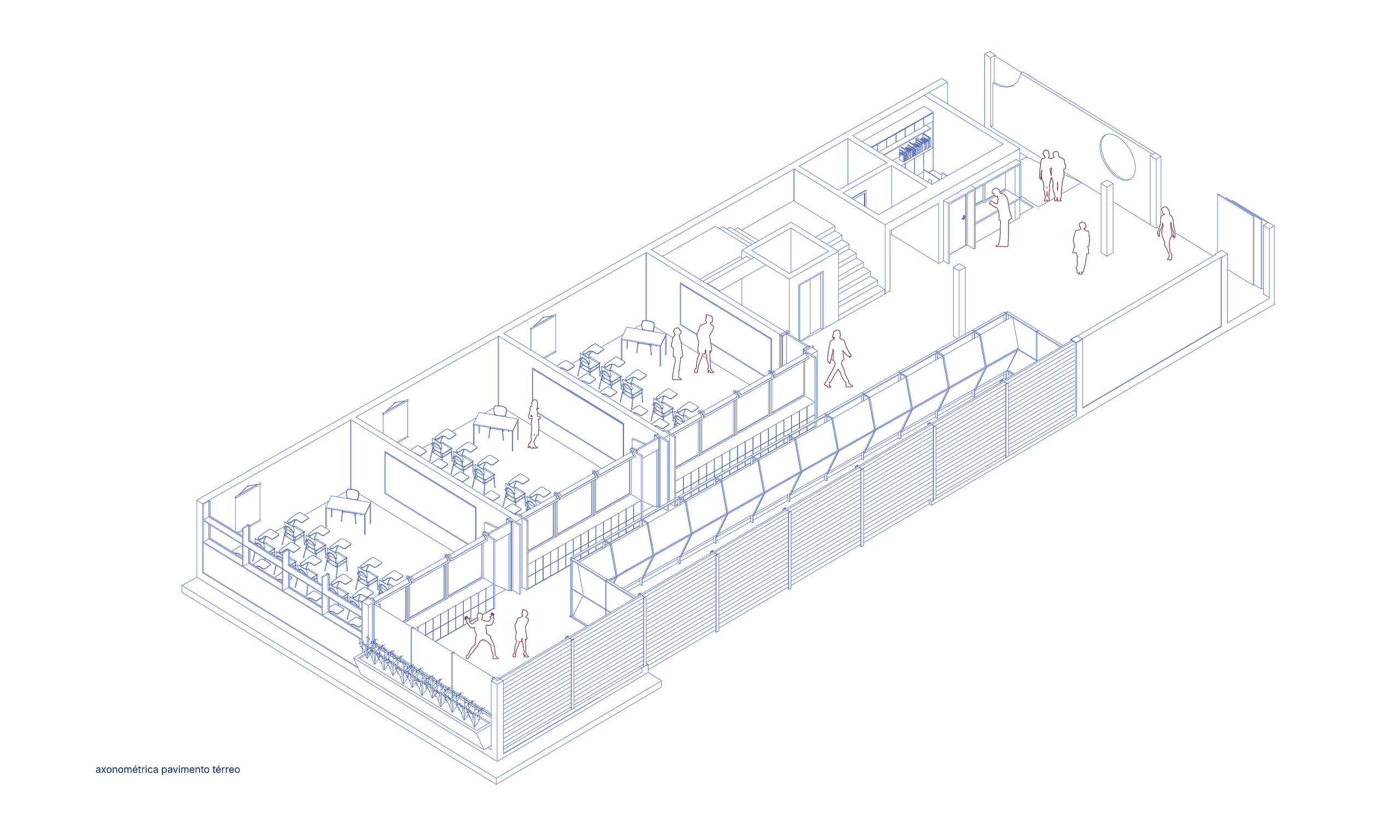A escolha enxuta dos materiais incorpora aqueles que já faziam parte do repertório construtivo da escola, como a estrutura de concreto aparente, o tijolo maciço de barra comum e os pisos vinílicos nos ambientes internos, assegurando continuidade material, durabilidade e facilidade de manutenção.