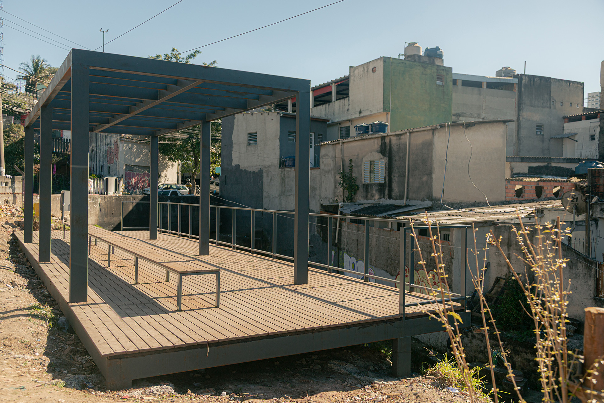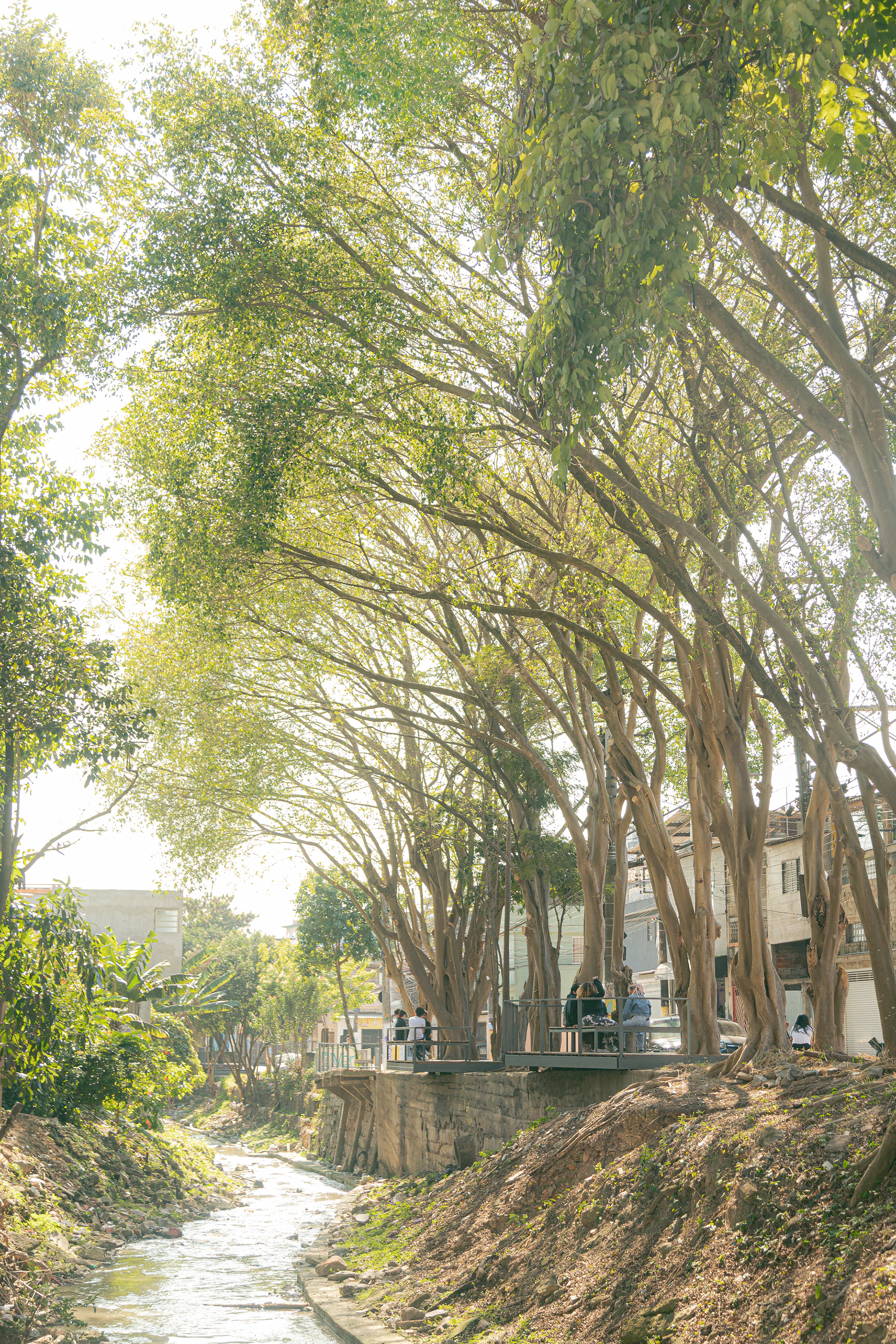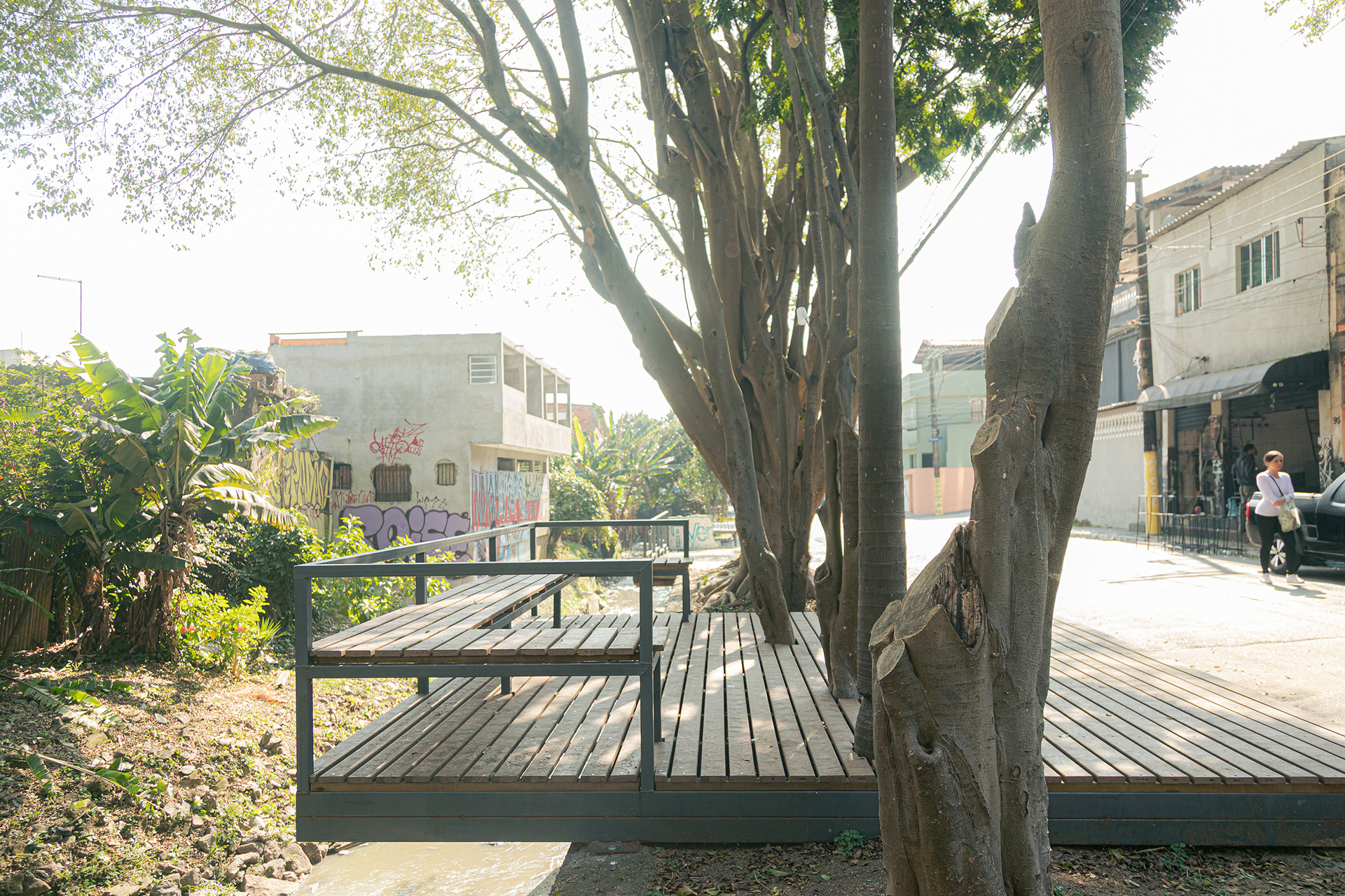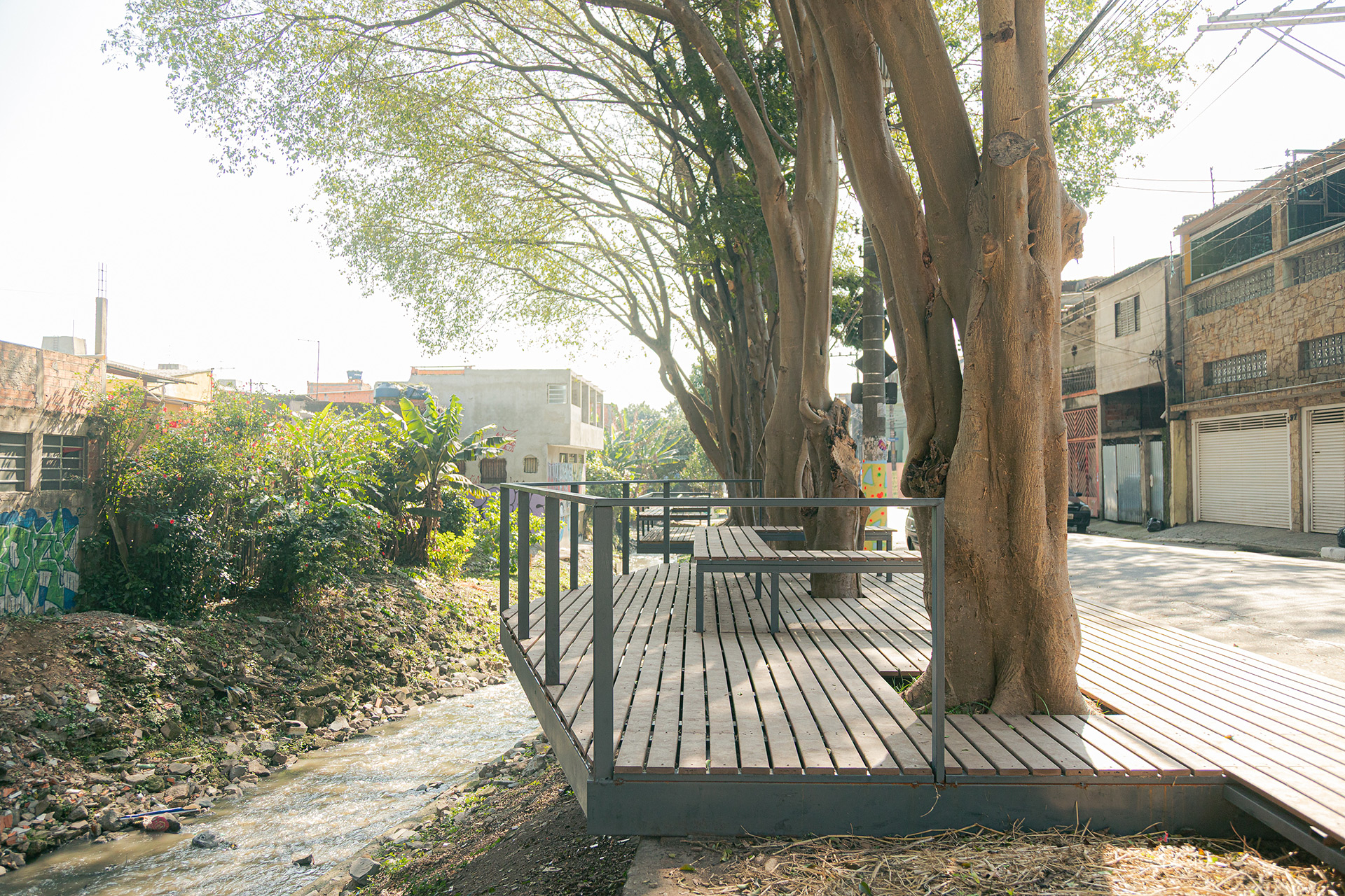 Apesar da presença de belas árvores de porte, os espaços à margem do córrego antes da intervenção eram íngremes, estreitos e muito mal cuidados, tornando a relação da comunidade com o curso d 'água praticamente inexistente. A proposta trata da construção de uma série de plataformas, pensadas para cada situação, no intuito de que a comunidade possa se aproximar do curso d 'água e o transforme em local de encontro e descanso. Os materiais utilizados se resumem a estruturas metálicas, com apenas 4 seções de tubos diferentes, de fácil manuseio e adaptação, permitindo que três equipes de serralheiros do bairro pudessem montar toda a proposta. Para o piso foram utilizados decks de plástico reciclado instalados pelos próprios serralheiros.
