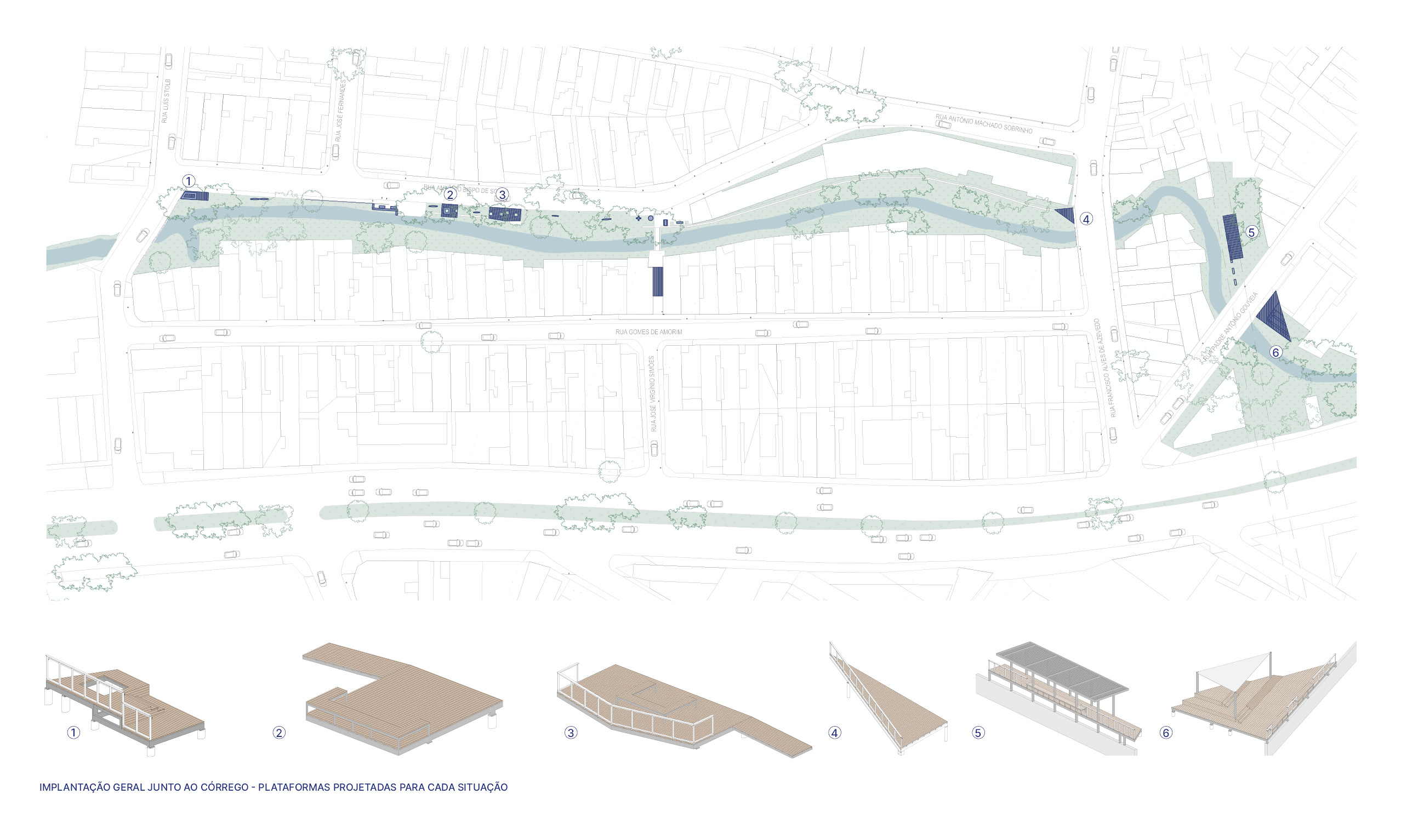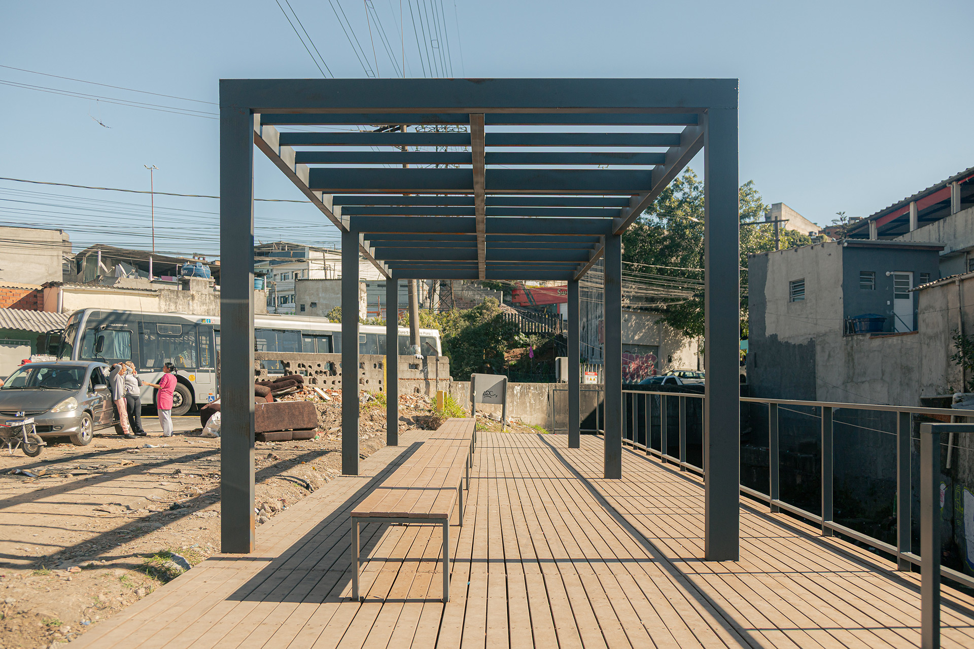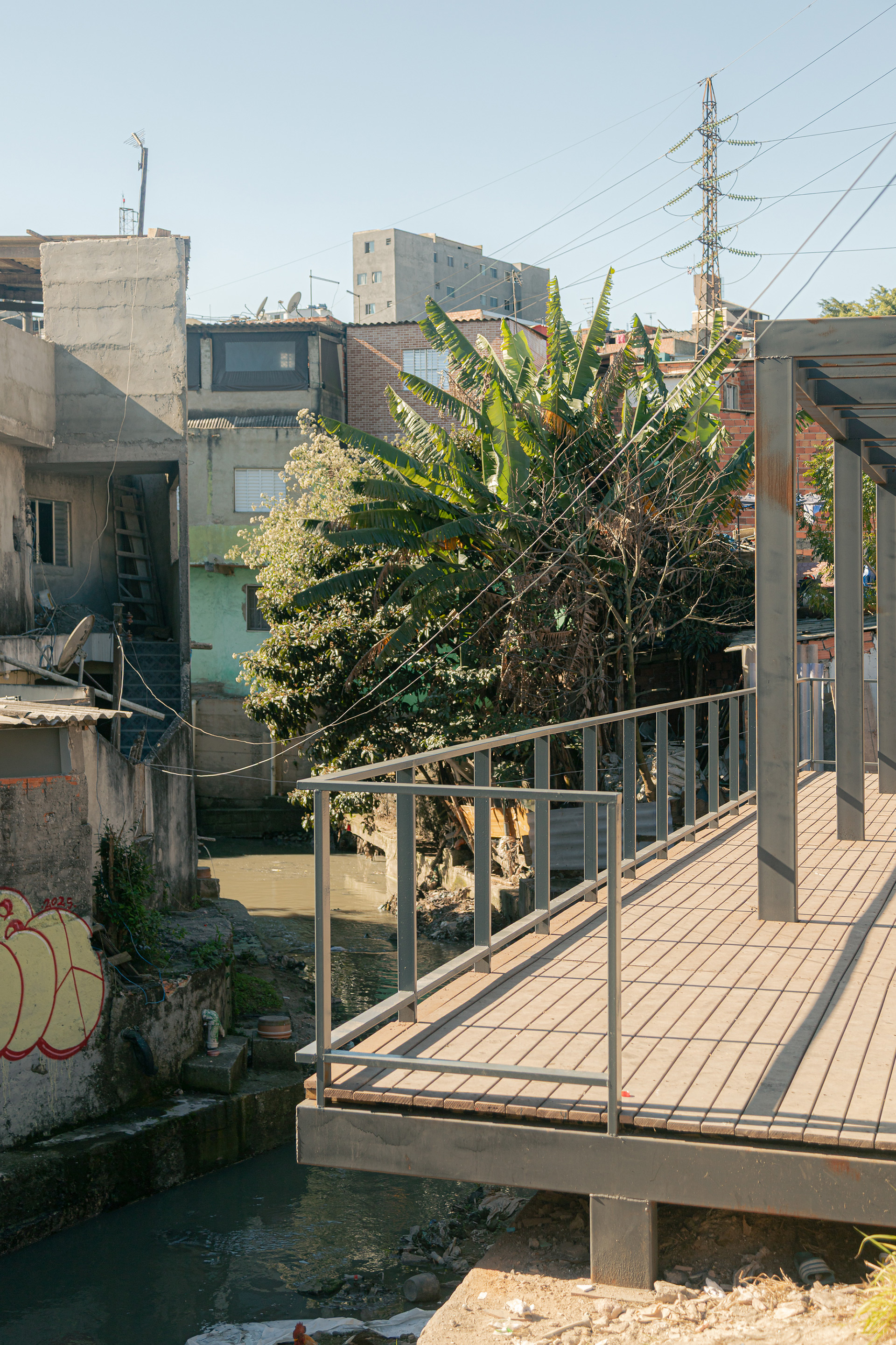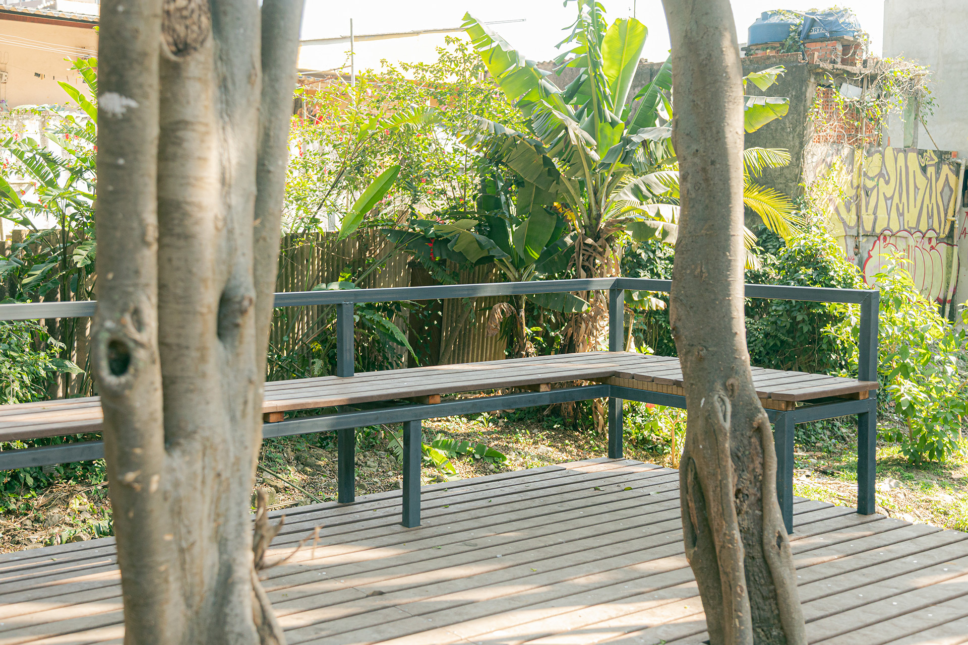 Apesar da presença de belas árvores de porte, os espaços à margem do córrego antes da intervenção eram íngremes, estreitos e muito mal cuidados, tornando a relação da comunidade com o curso d 'água praticamente inexistente. A proposta trata da construção de uma série de plataformas, pensadas para cada situação, no intuito de que a comunidade possa se aproximar do curso d 'água e o transforme em local de encontro e descanso. Os materiais utilizados se resumem a estruturas metálicas, com apenas 4 seções de tubos diferentes, de fácil manuseio e adaptação, permitindo que três equipes de serralheiros do bairro pudessem montar toda a proposta. Para o piso foram utilizados decks de plástico reciclado instalados pelos próprios serralheiros.