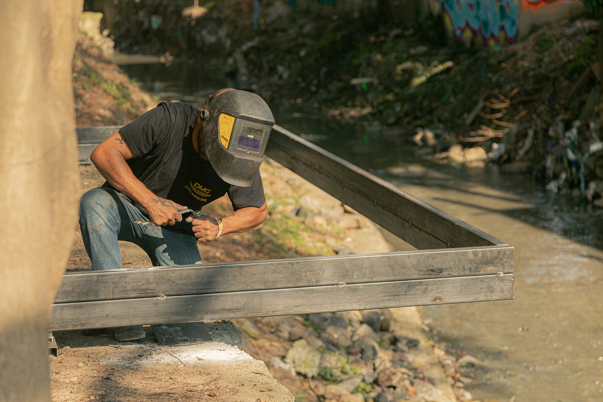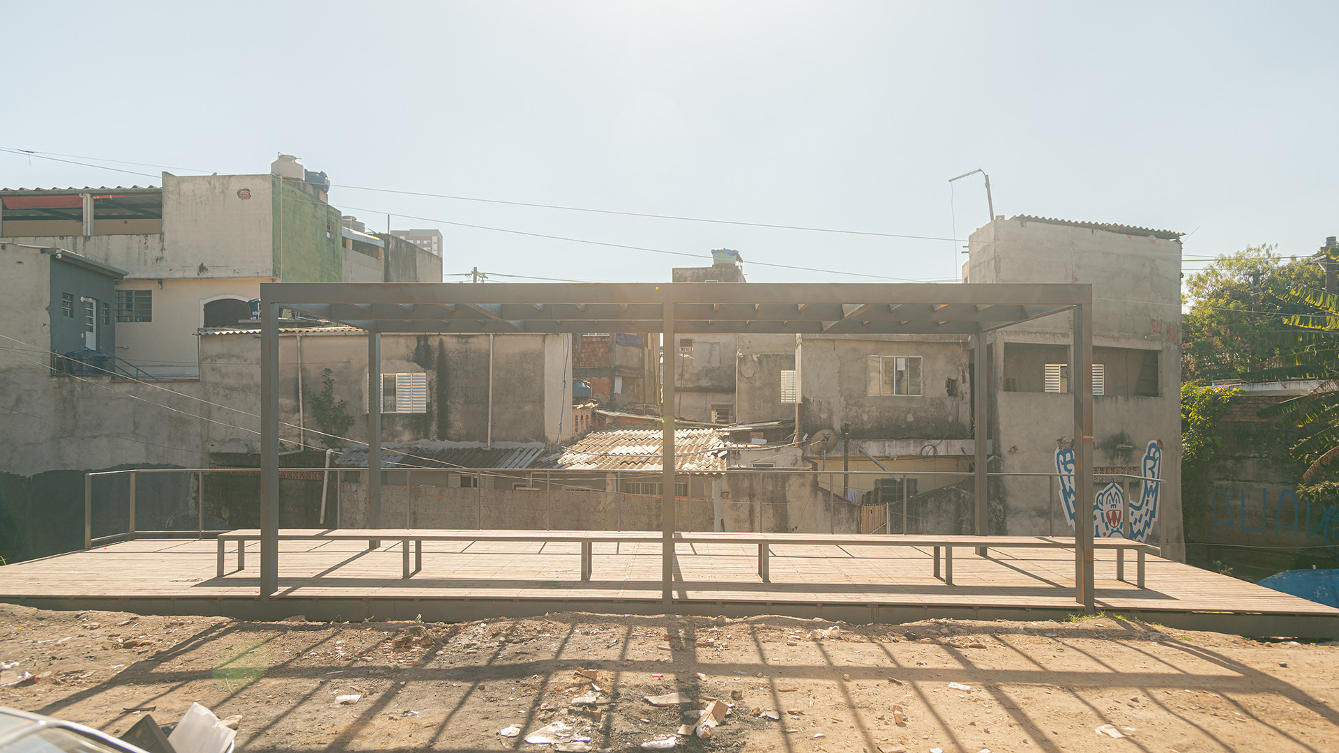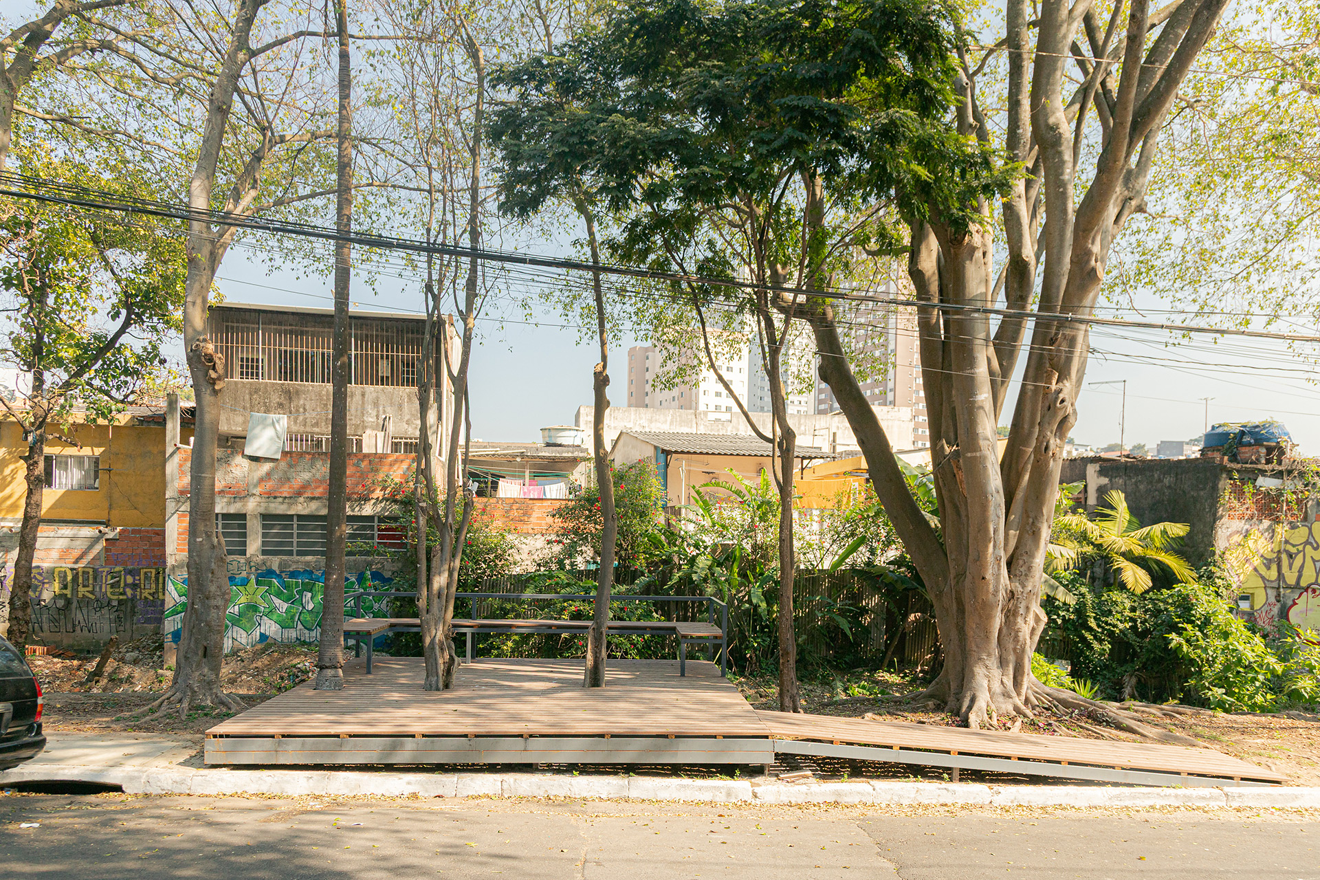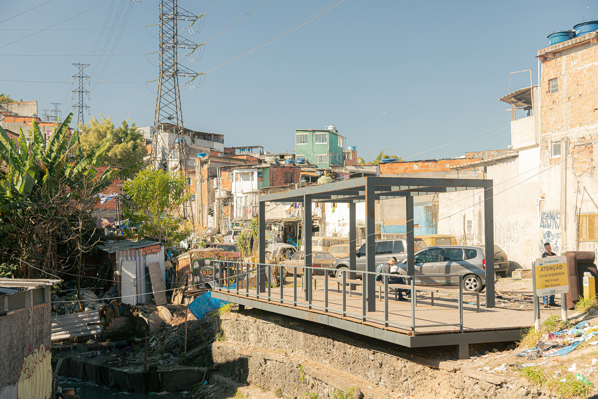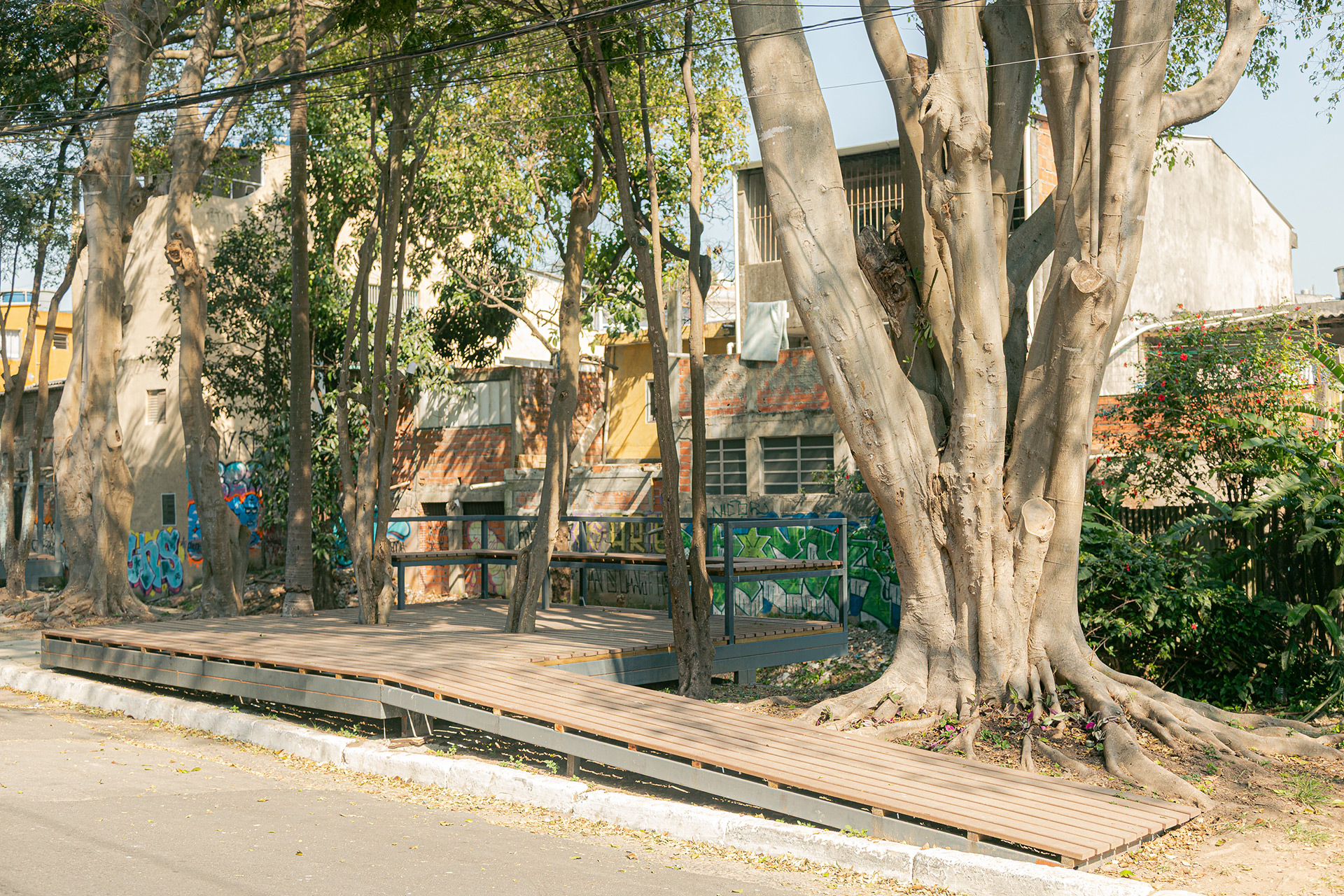 Apesar da presença de belas árvores de porte, os espaços à margem do córrego antes da intervenção eram íngremes, estreitos e muito mal cuidados, tornando a relação da comunidade com o curso d 'água praticamente inexistente. A proposta trata da construção de uma série de plataformas, pensadas para cada situação, no intuito de que a comunidade possa se aproximar do curso d 'água e o transforme em local de encontro e descanso. Os materiais utilizados se resumem a estruturas metálicas, com apenas 4 seções de tubos diferentes, de fácil manuseio e adaptação, permitindo que três equipes de serralheiros do bairro pudessem montar toda a proposta. Para o piso foram utilizados decks de plástico reciclado instalados pelos próprios serralheiros.