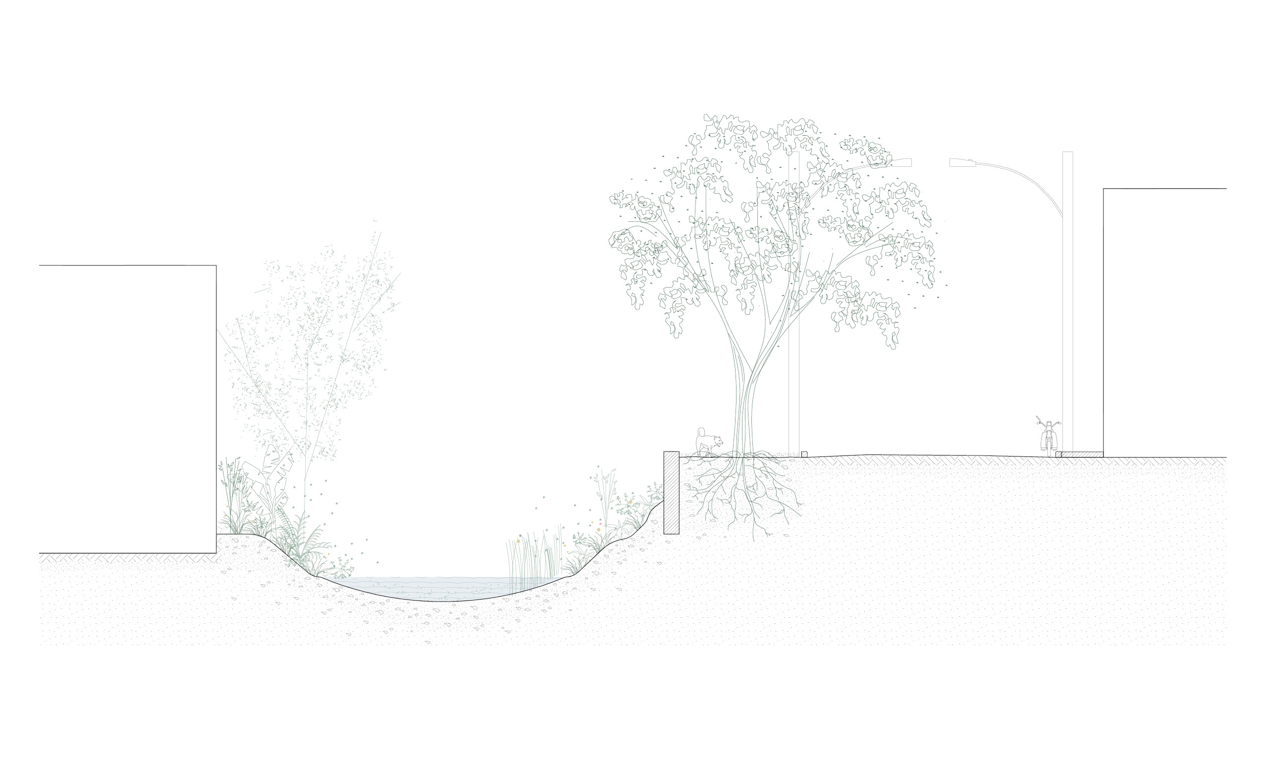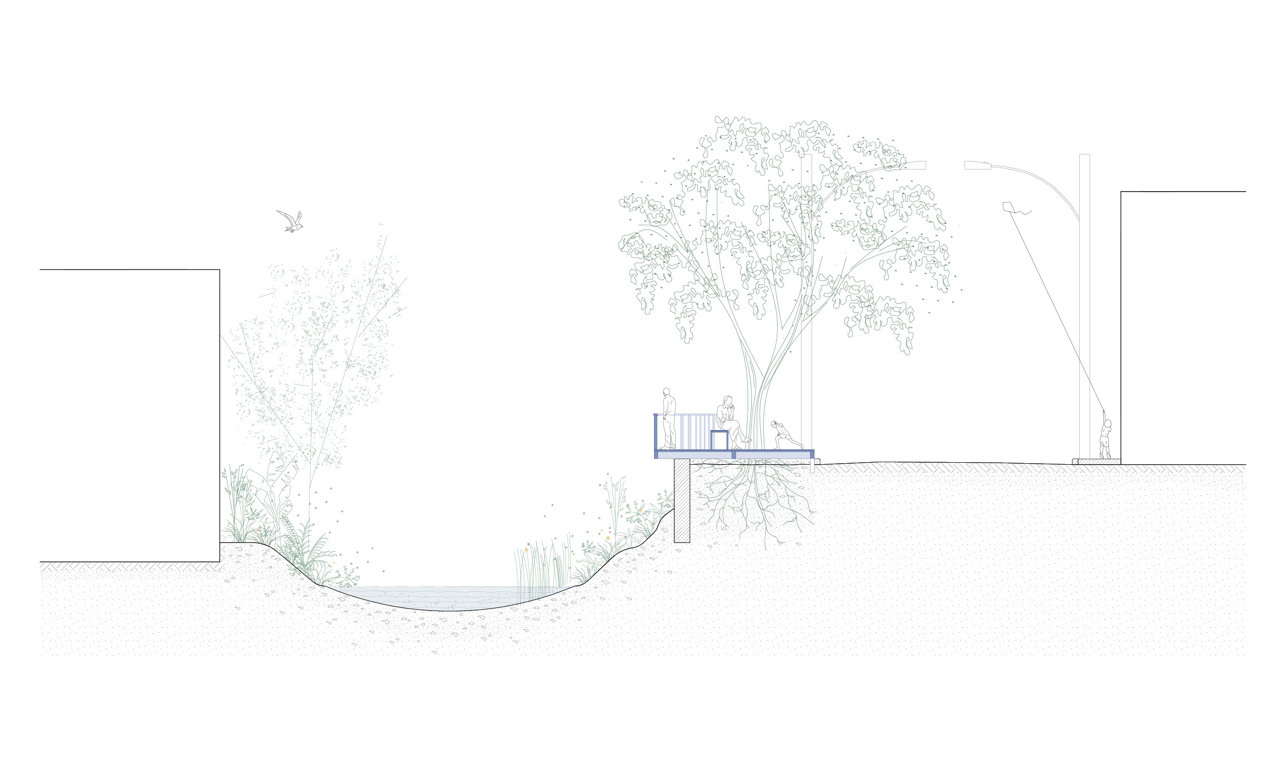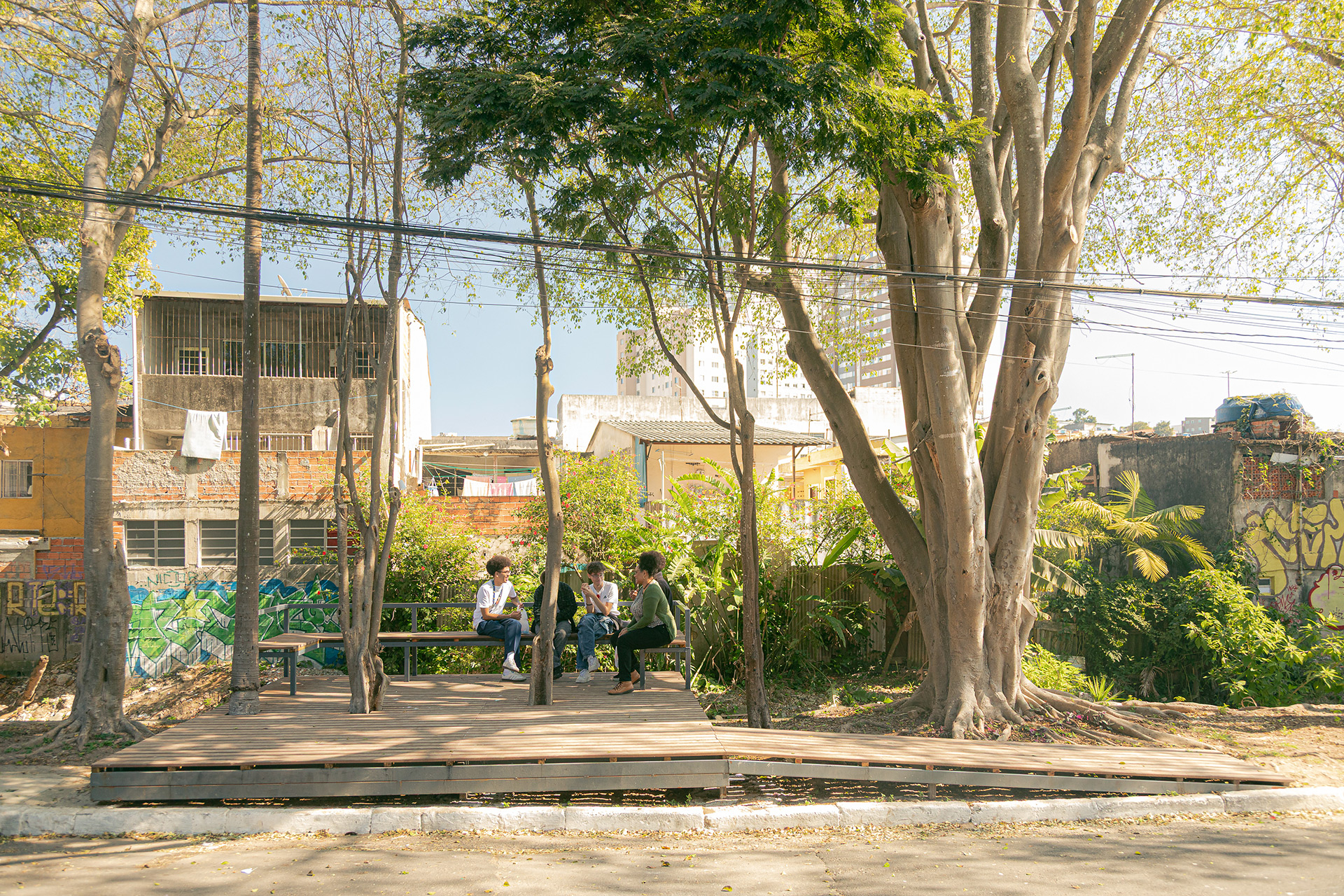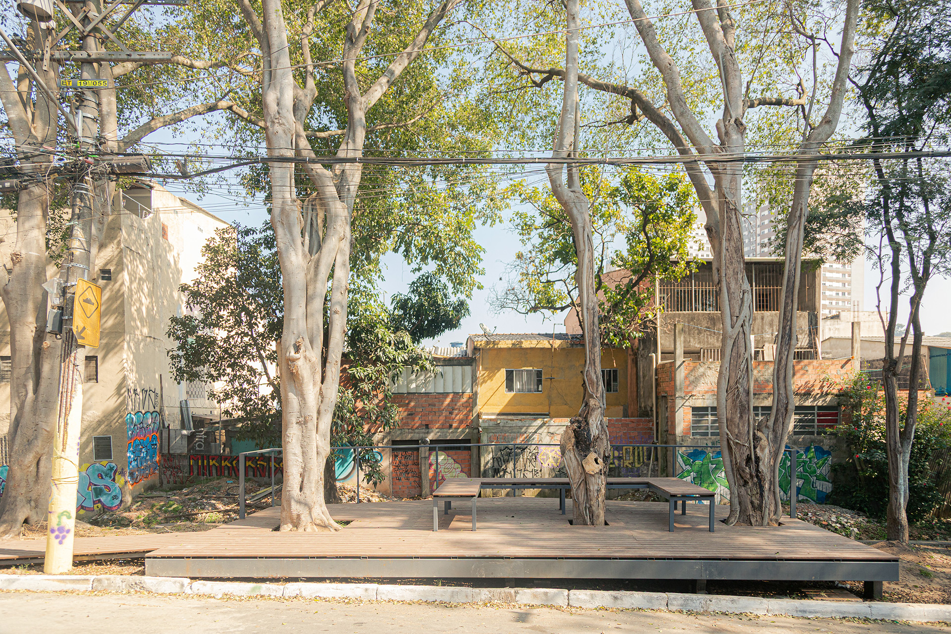 Apesar da presença de belas árvores de porte, os espaços à margem do córrego antes da intervenção eram íngremes, estreitos e muito mal cuidados, tornando a relação da comunidade com o curso d 'água praticamente inexistente. A proposta trata da construção de uma série de plataformas, pensadas para cada situação, no intuito de que a comunidade possa se aproximar do curso d 'água e o transforme em local de encontro e descanso. Os materiais utilizados se resumem a estruturas metálicas, com apenas 4 seções de tubos diferentes, de fácil manuseio e adaptação, permitindo que três equipes de serralheiros do bairro pudessem montar toda a proposta. Para o piso foram utilizados decks de plástico reciclado instalados pelos próprios serralheiros.