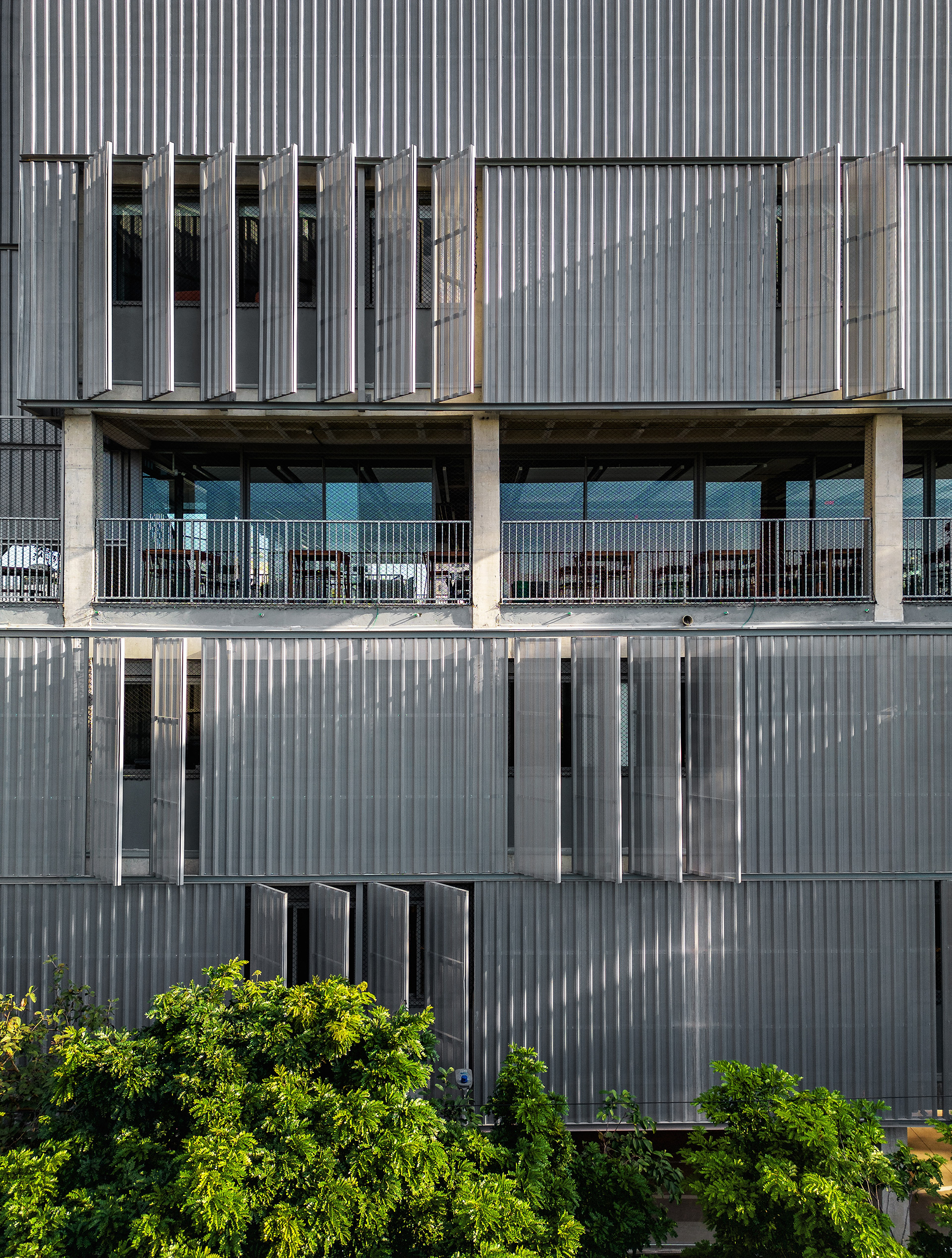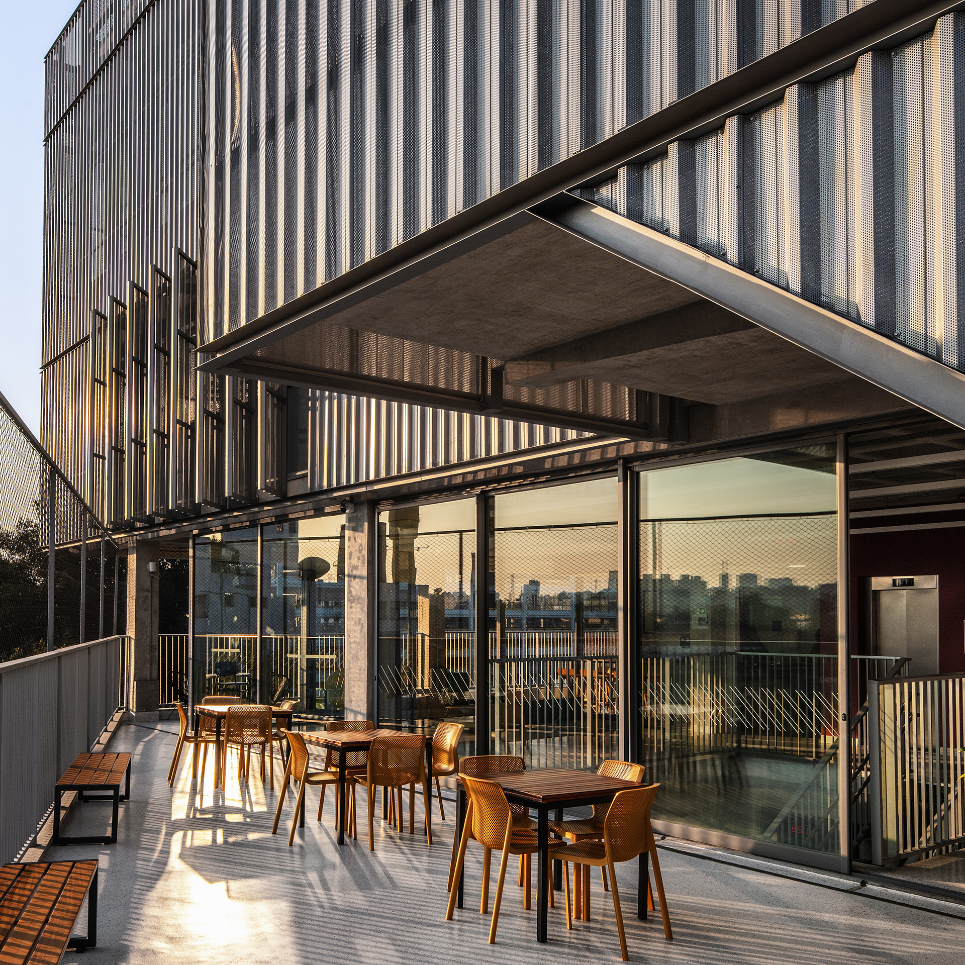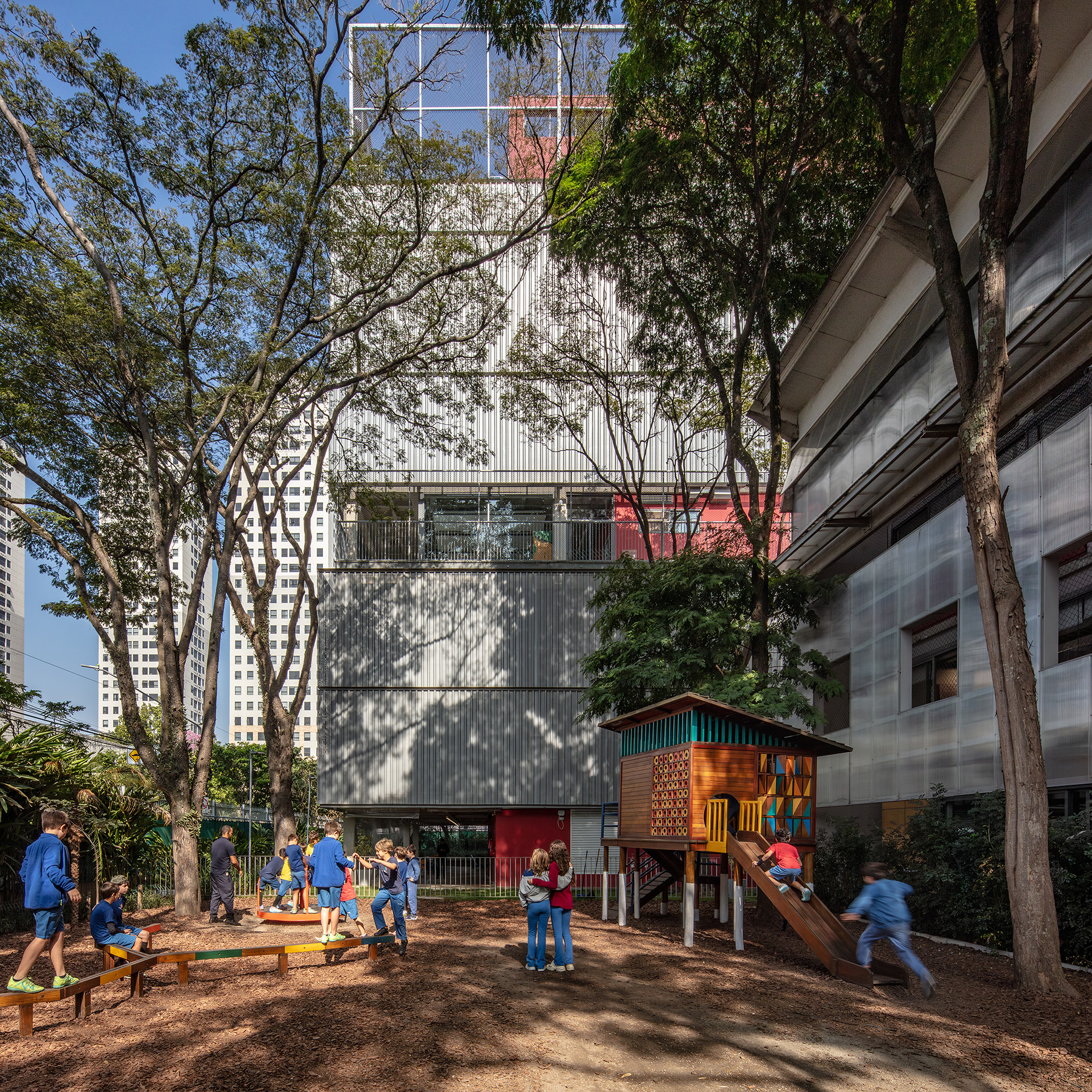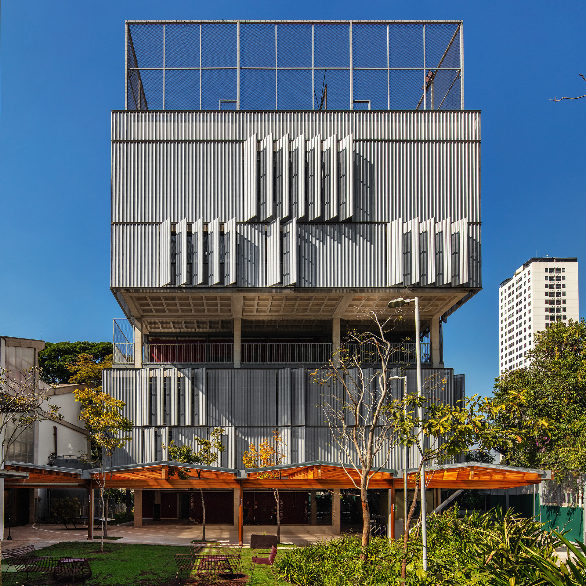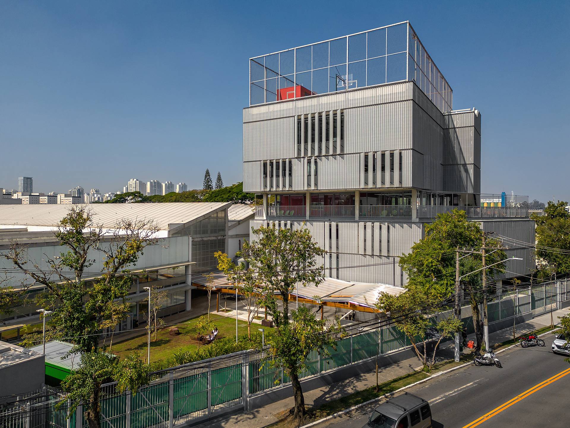 Volumetricamente, o edifício está organizado em dois blocos sobrepostos, separados por uma praça elevada localizada no 3º pavimento. No primeiro bloco, correspondente ao 1º e 2º pavimentos, estão distribuídas as salas de aula. A praça elevada, caracterizada como um segundo pilotis, acomoda o refeitório e a lanchonete. Rodeado por terraços cobertos e descobertos, este nível, juntamente com os terraços do primeiro bloco, oferece apoio para momentos alternativos de socialização e estudos em pequenos grupos.