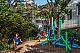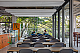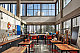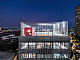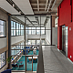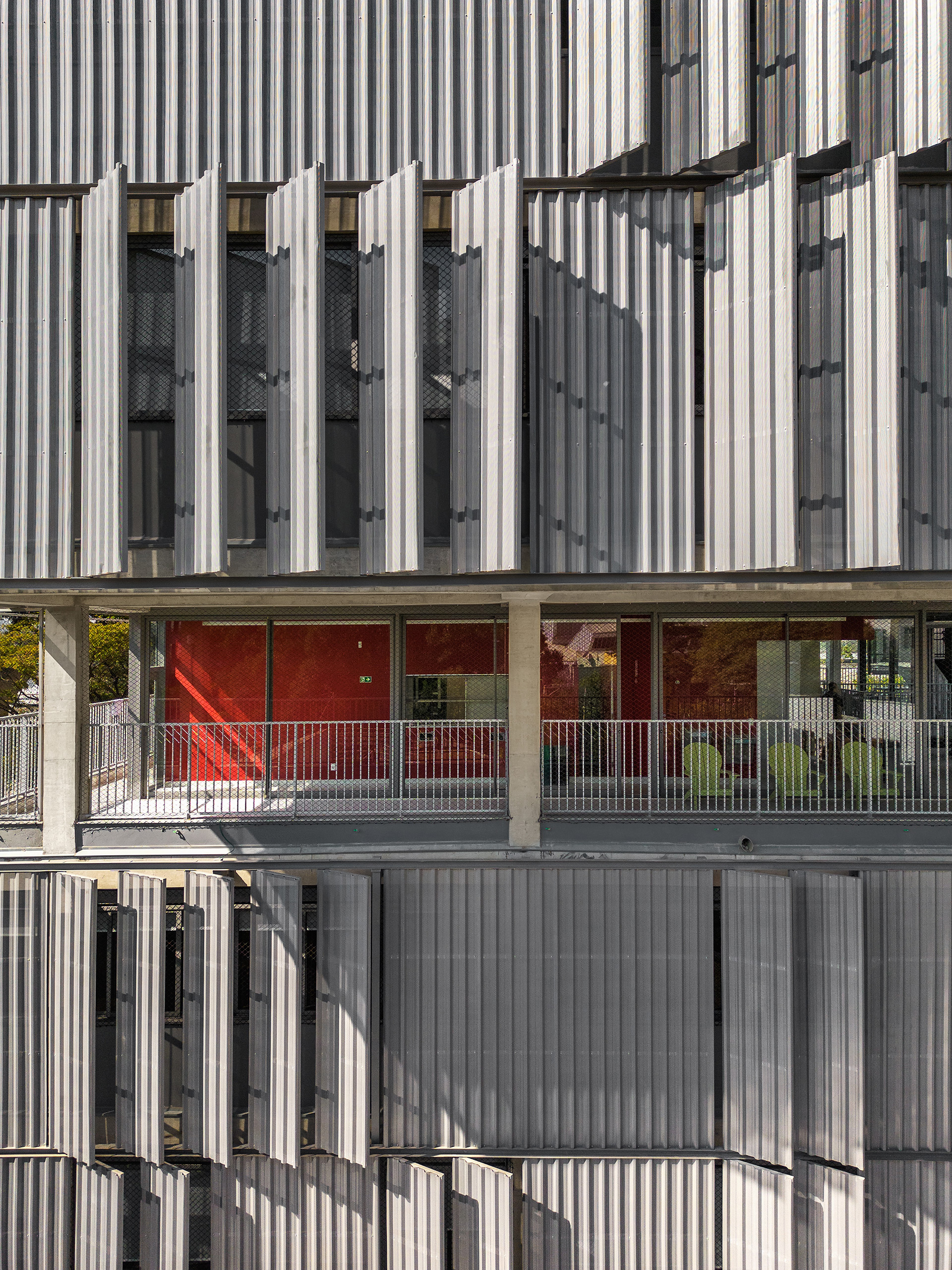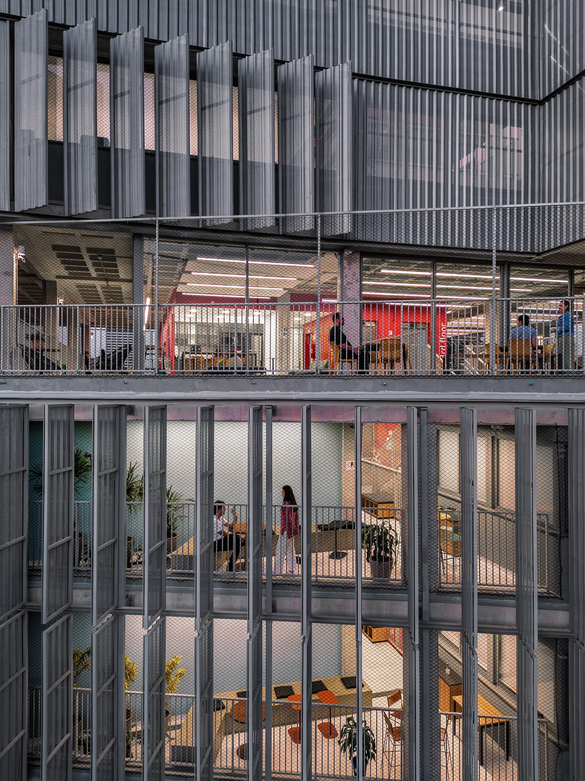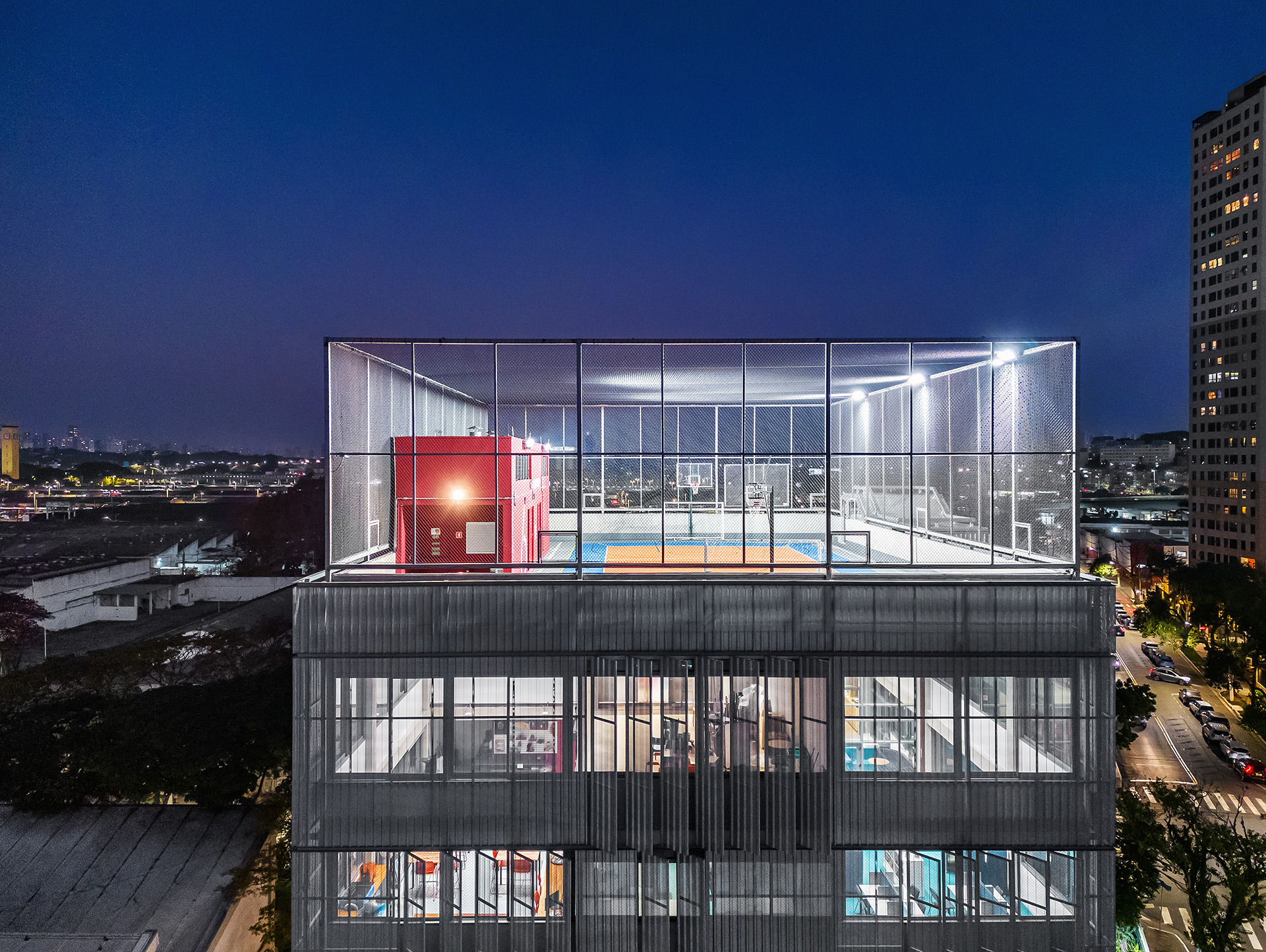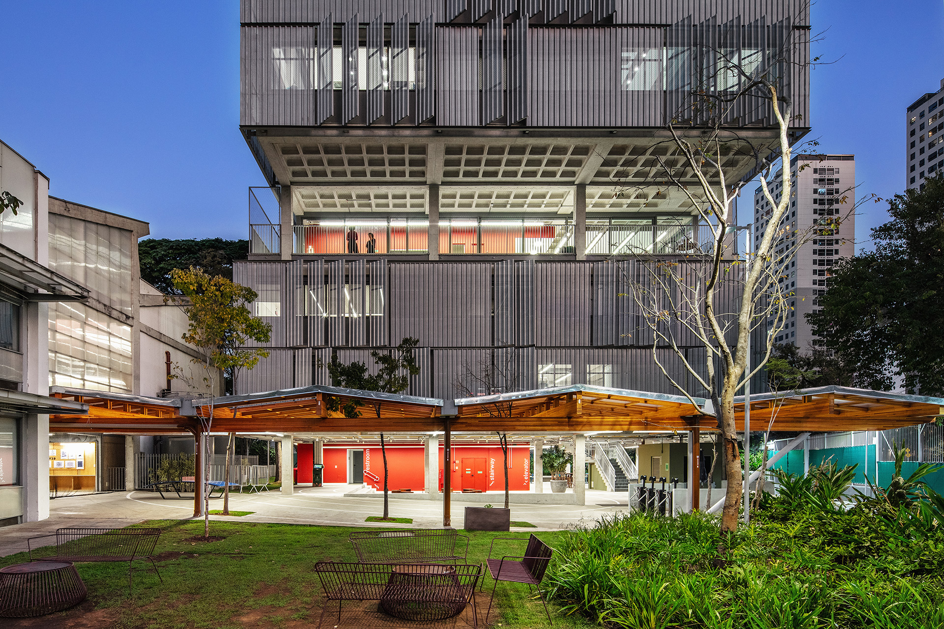 Ladeado por uma ampla área ajardinada, o hall acomoda atividades coletivas com espaços para jogos, estar, descanso e aulas em um pequeno auditório aberto. Do centro deste espaço parte a prumada de circulação vertical, definida por um volume prismático vermelho que cruza o edifício do térreo à cobertura.