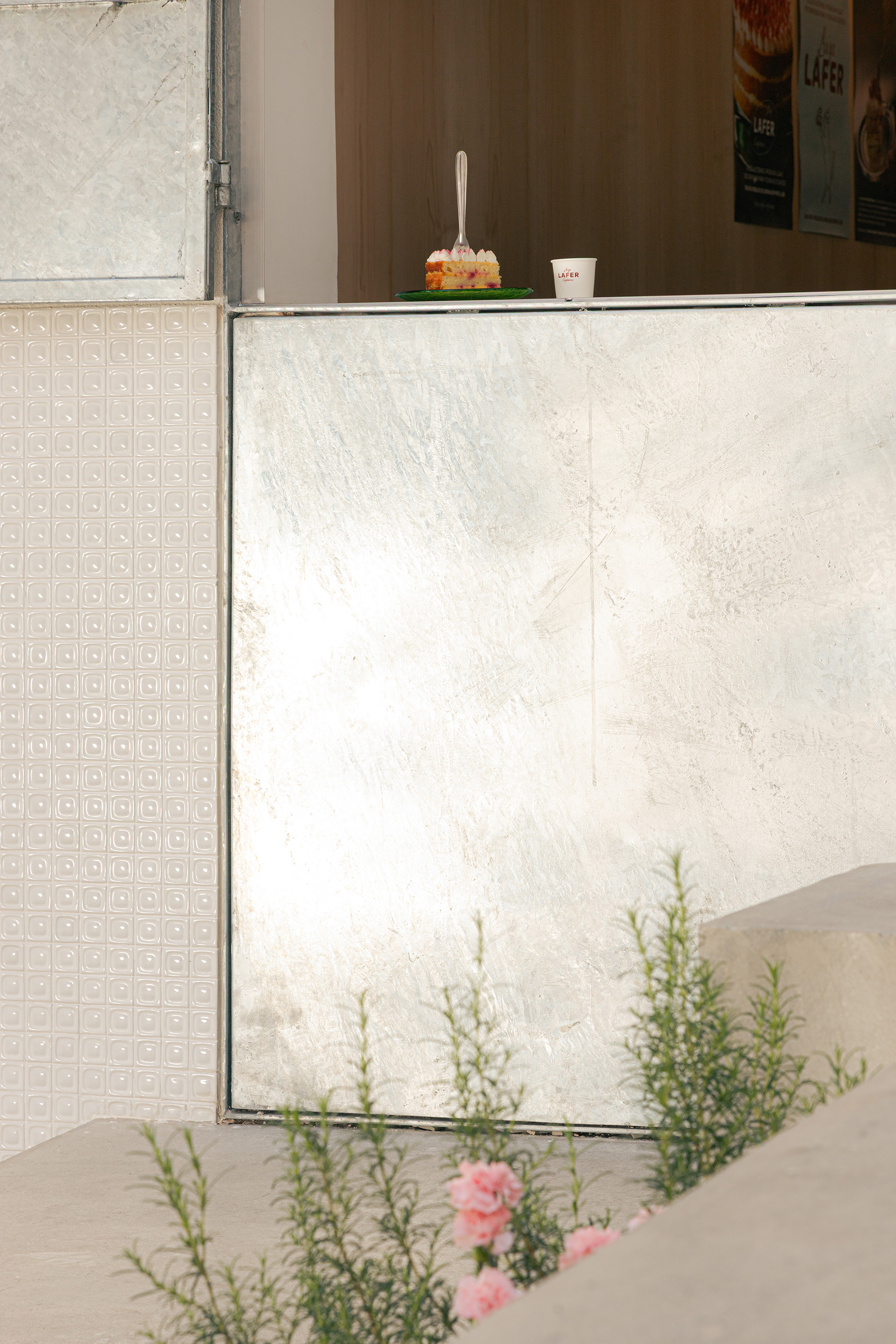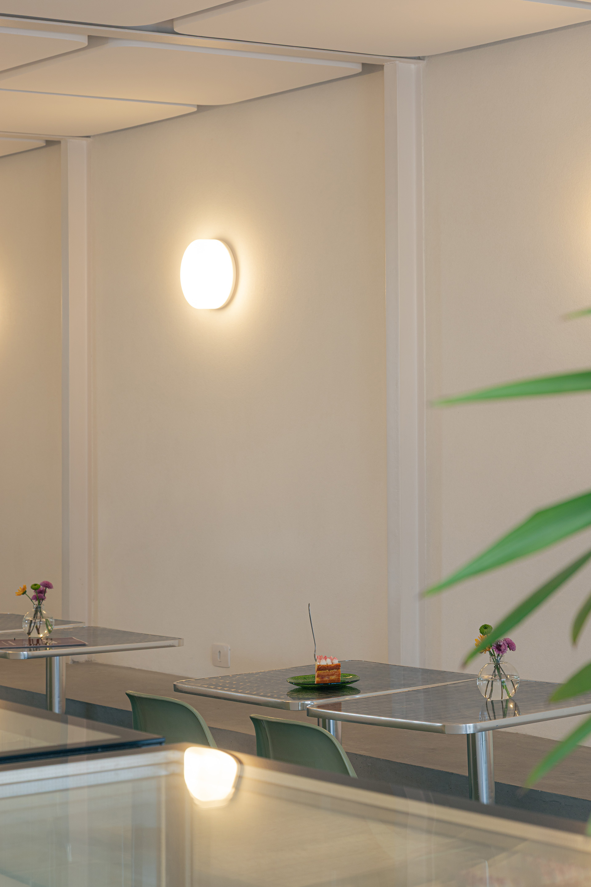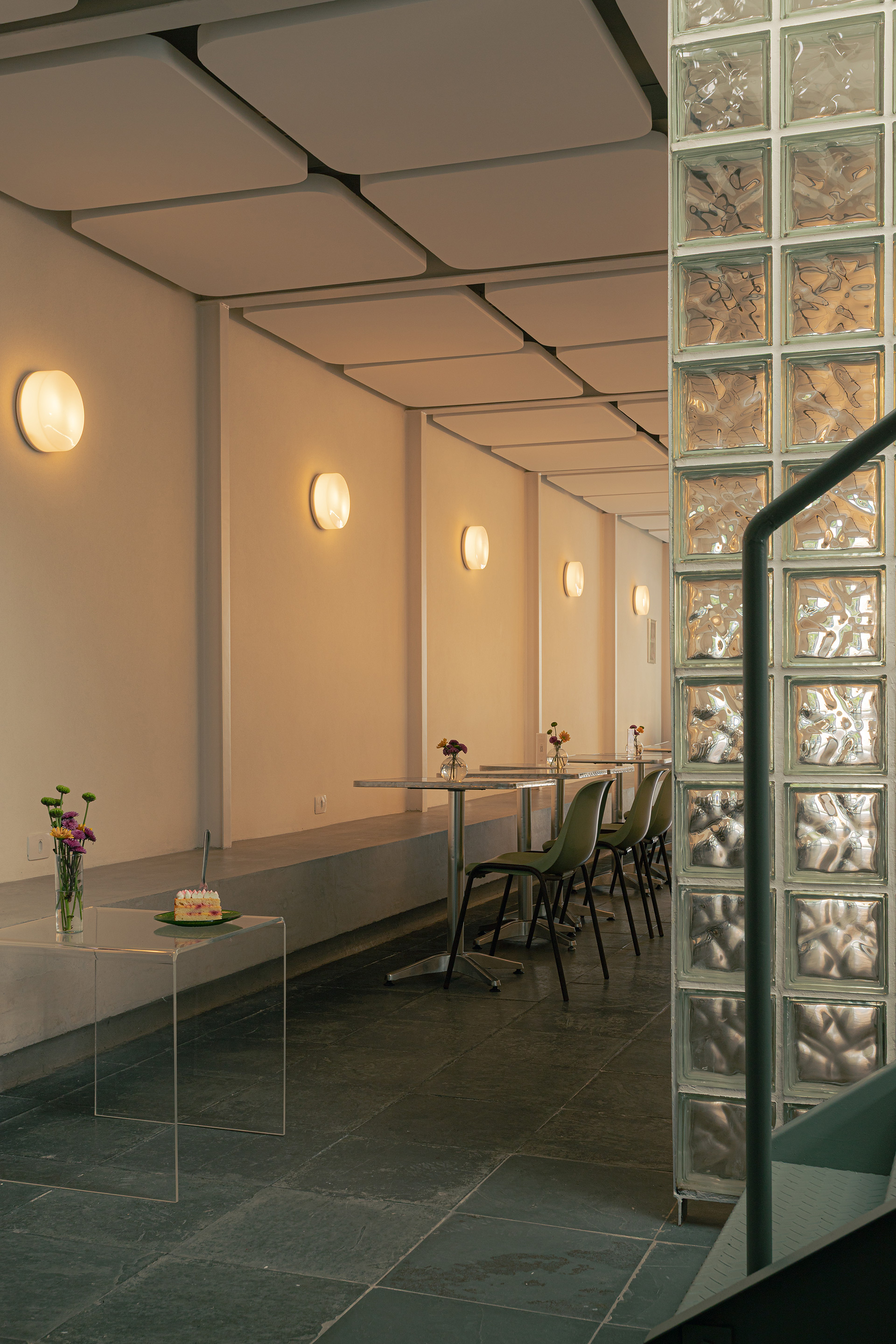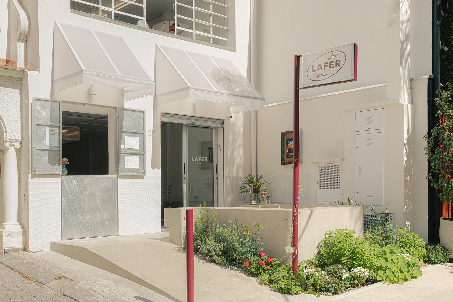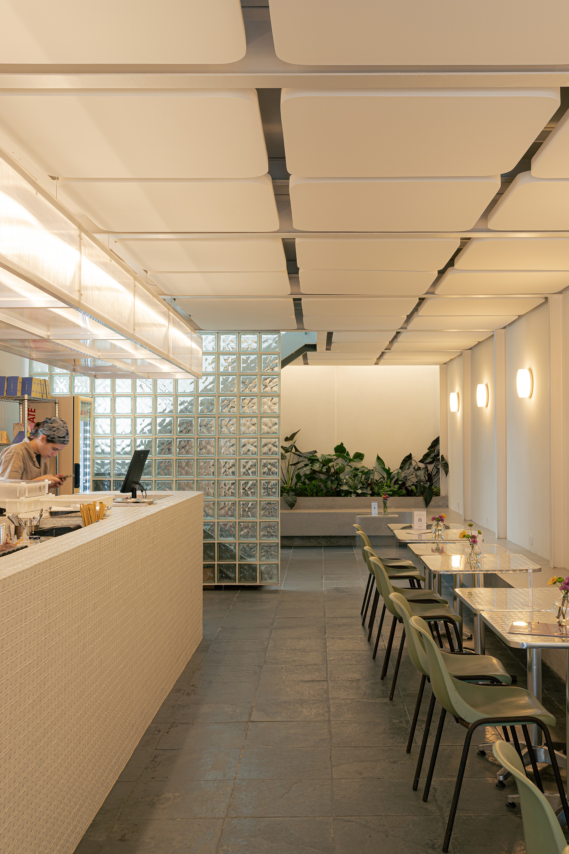 Os materiais utilizados na intervenção dialogam com aqueles empregados no início da década de 1990. O piso de ardósia existente foi preservado e combinado com pastilhas esmaltadas brancas com relevo, encontradas em um cemitério de azulejos. Tijolos de vidro e metais com brilho natural, como alumínio e aço galvanizado, contribuem para a construção da atmosfera pretendida. O conjunto é arrematado por um forro de gesso de bordas arredondadas, inspirado nos espaços comerciais do período que, ao ser pintado de branco, faz alusão aos merengues servidos na mesa. Por fim, buscando introduzir cor e vitalidade ao ambiente, os novos canteiros receberam espécies de intensa floração, muitas delas comestíveis ou utilizadas como temperos, reforçando o vínculo entre a arquitetura e o universo da culinária.