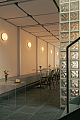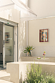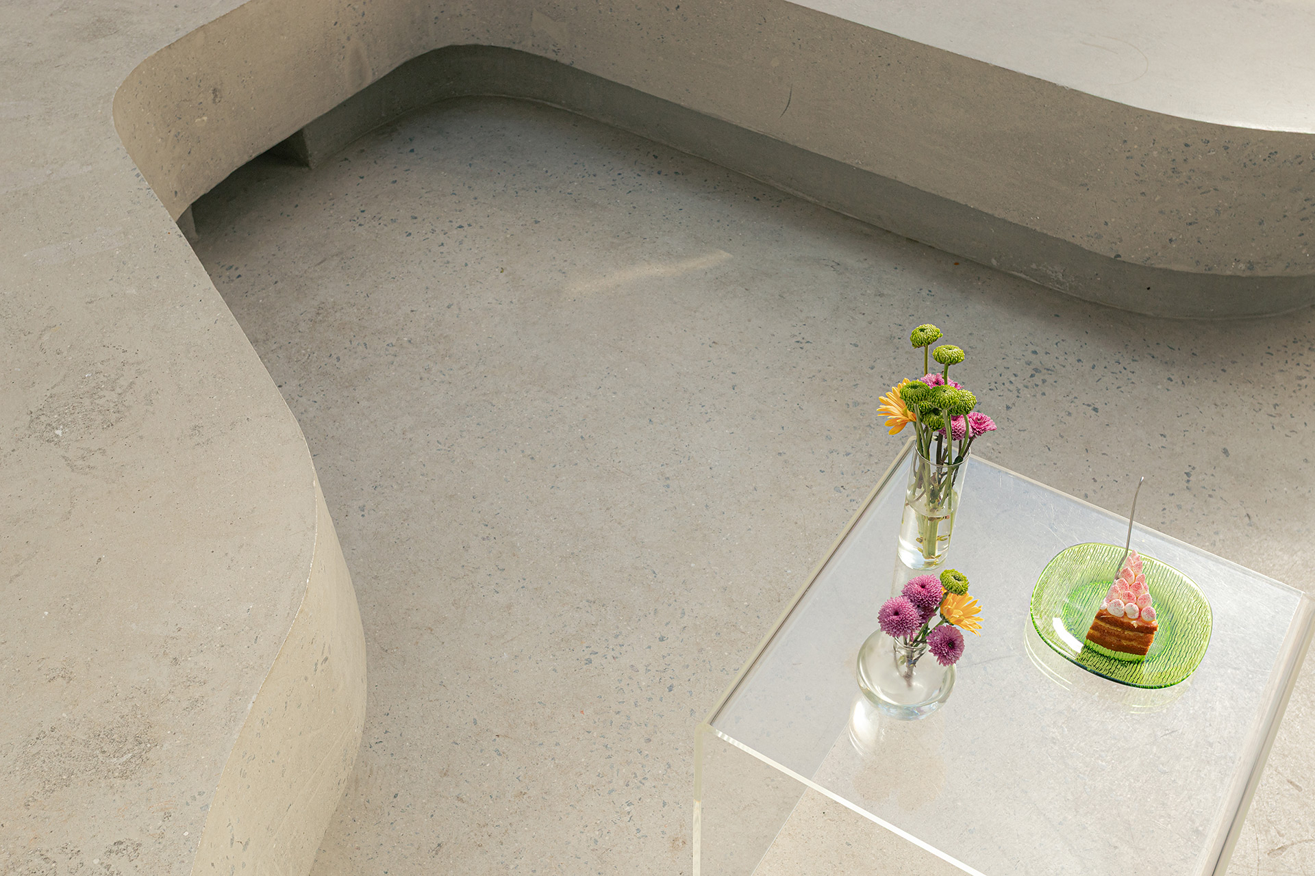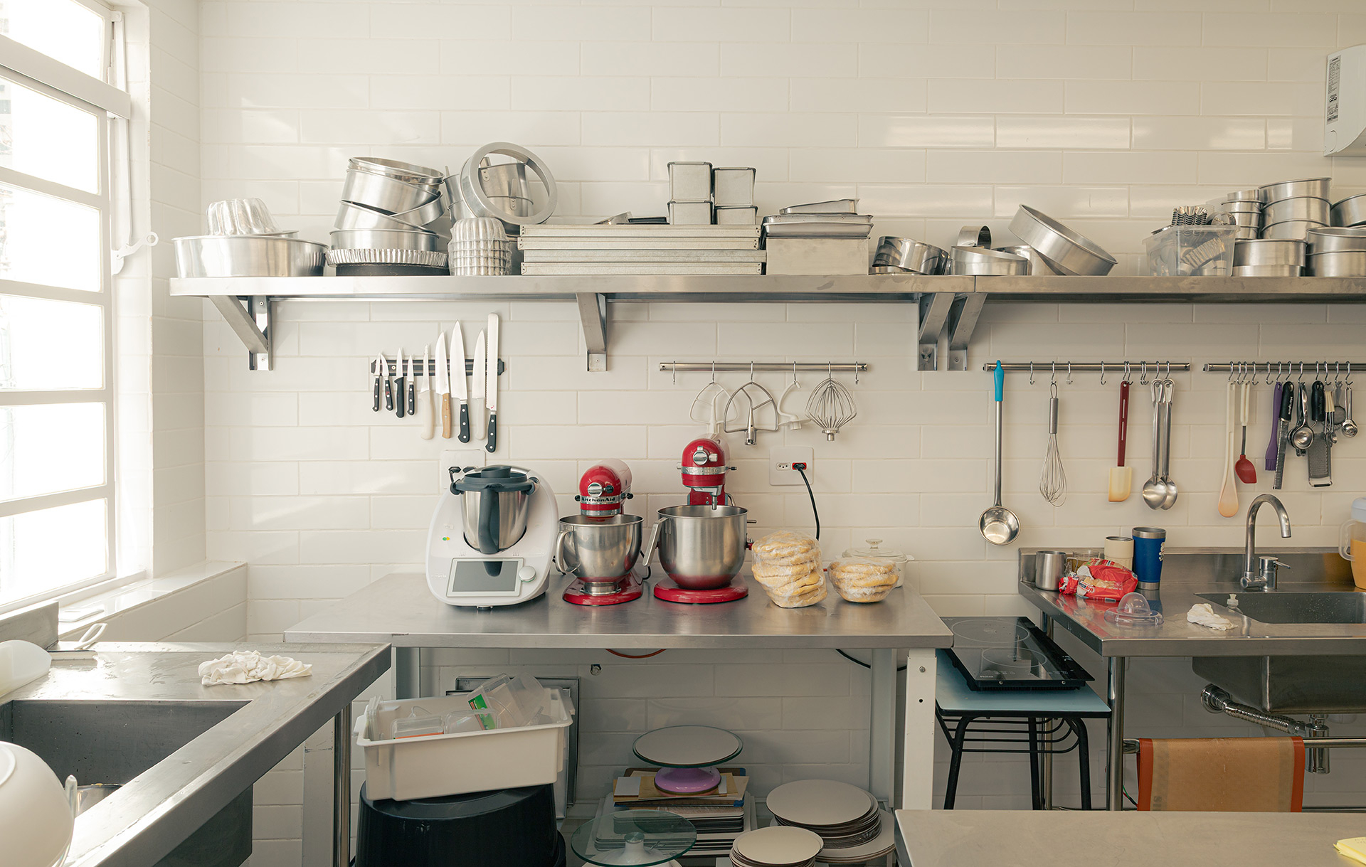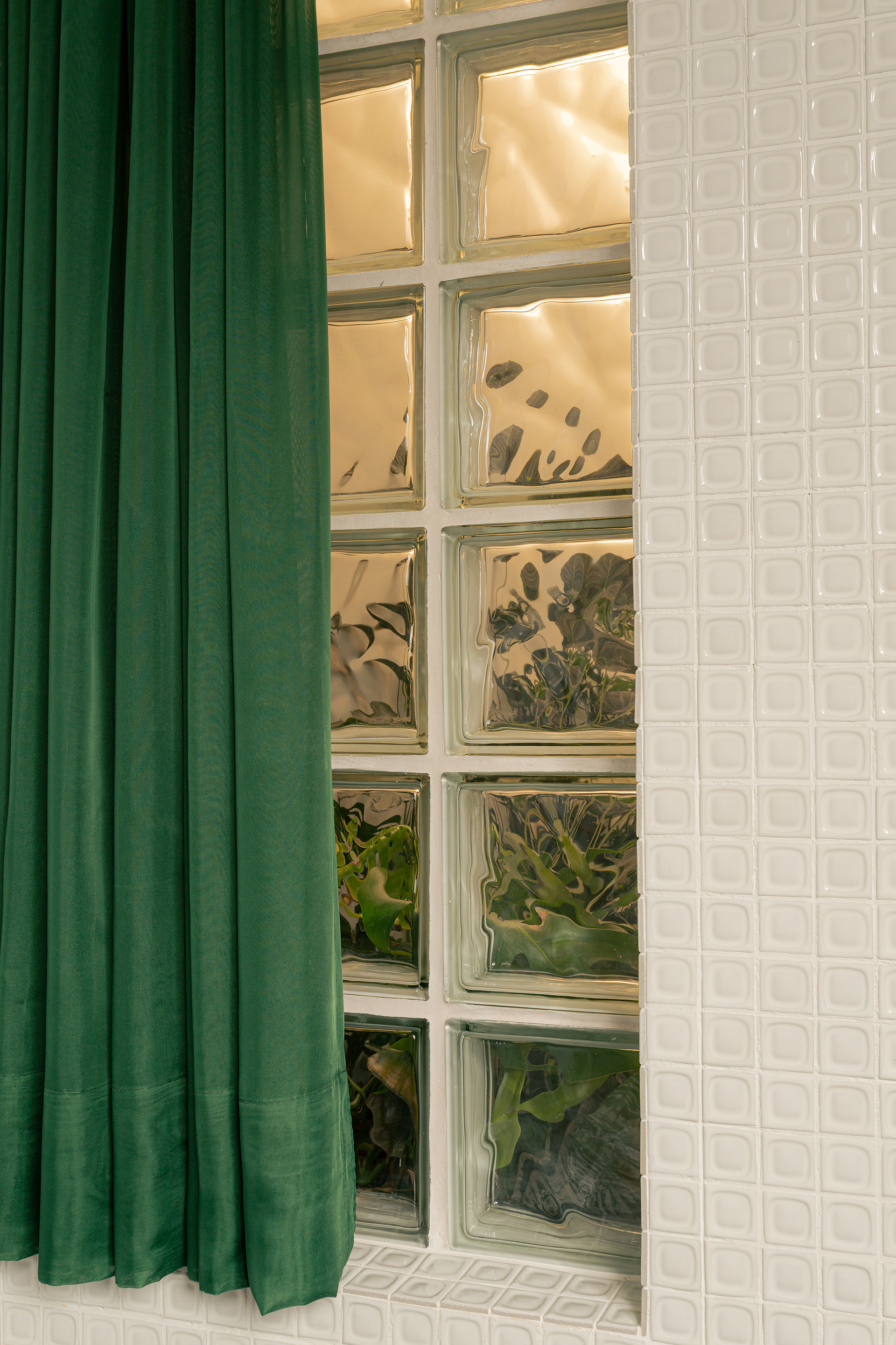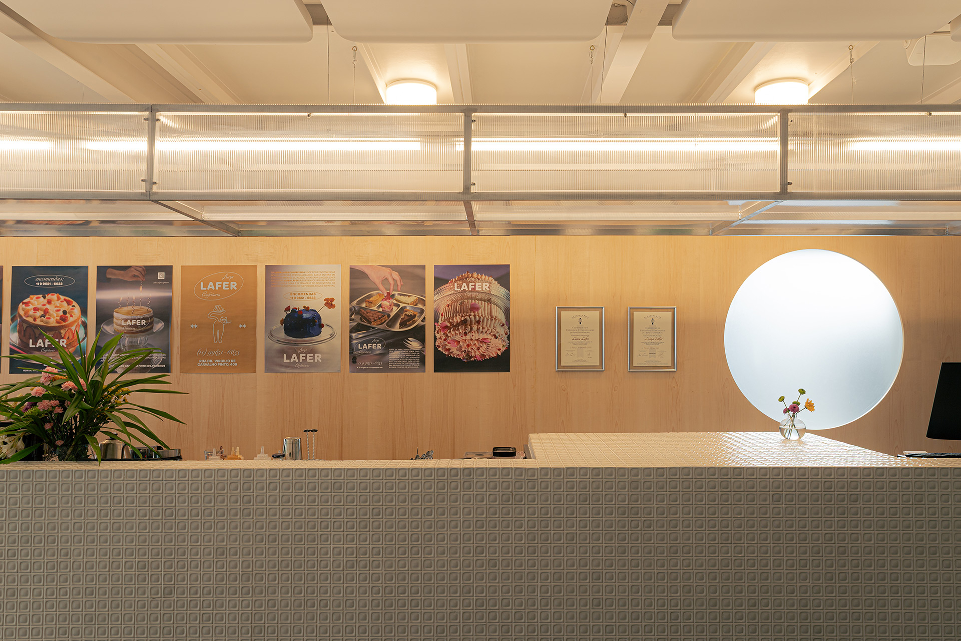 Os materiais utilizados na intervenção dialogam com aqueles empregados no início da década de 1990. O piso de ardósia existente foi preservado e combinado com pastilhas esmaltadas brancas com relevo, encontradas em um cemitério de azulejos. Tijolos de vidro e metais com brilho natural, como alumínio e aço galvanizado, contribuem para a construção da atmosfera pretendida. O conjunto é arrematado por um forro de gesso de bordas arredondadas, inspirado nos espaços comerciais do período que, ao ser pintado de branco, faz alusão aos merengues servidos na mesa. Por fim, buscando introduzir cor e vitalidade ao ambiente, os novos canteiros receberam espécies de intensa floração, muitas delas comestíveis ou utilizadas como temperos, reforçando o vínculo entre a arquitetura e o universo da culinária.