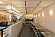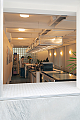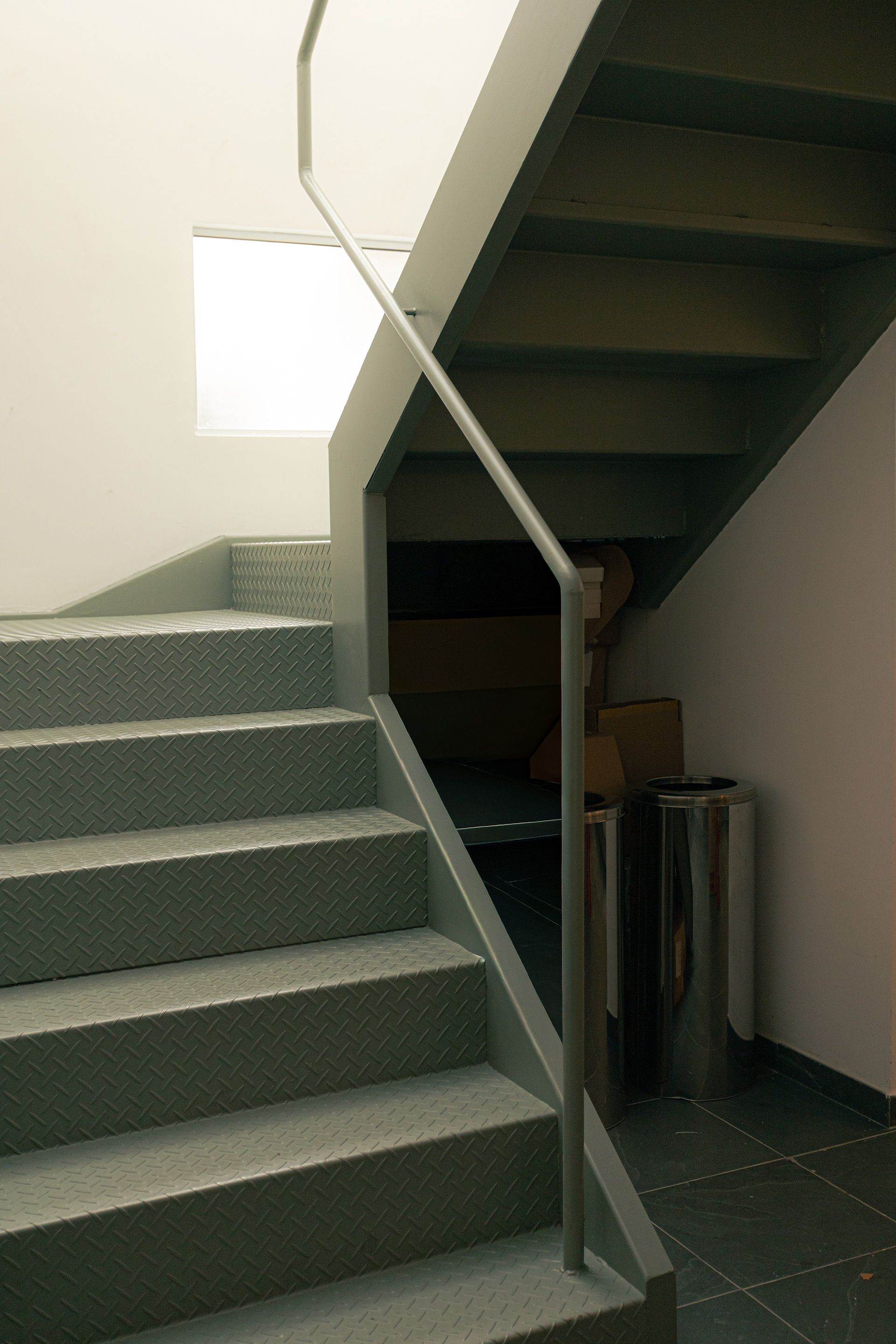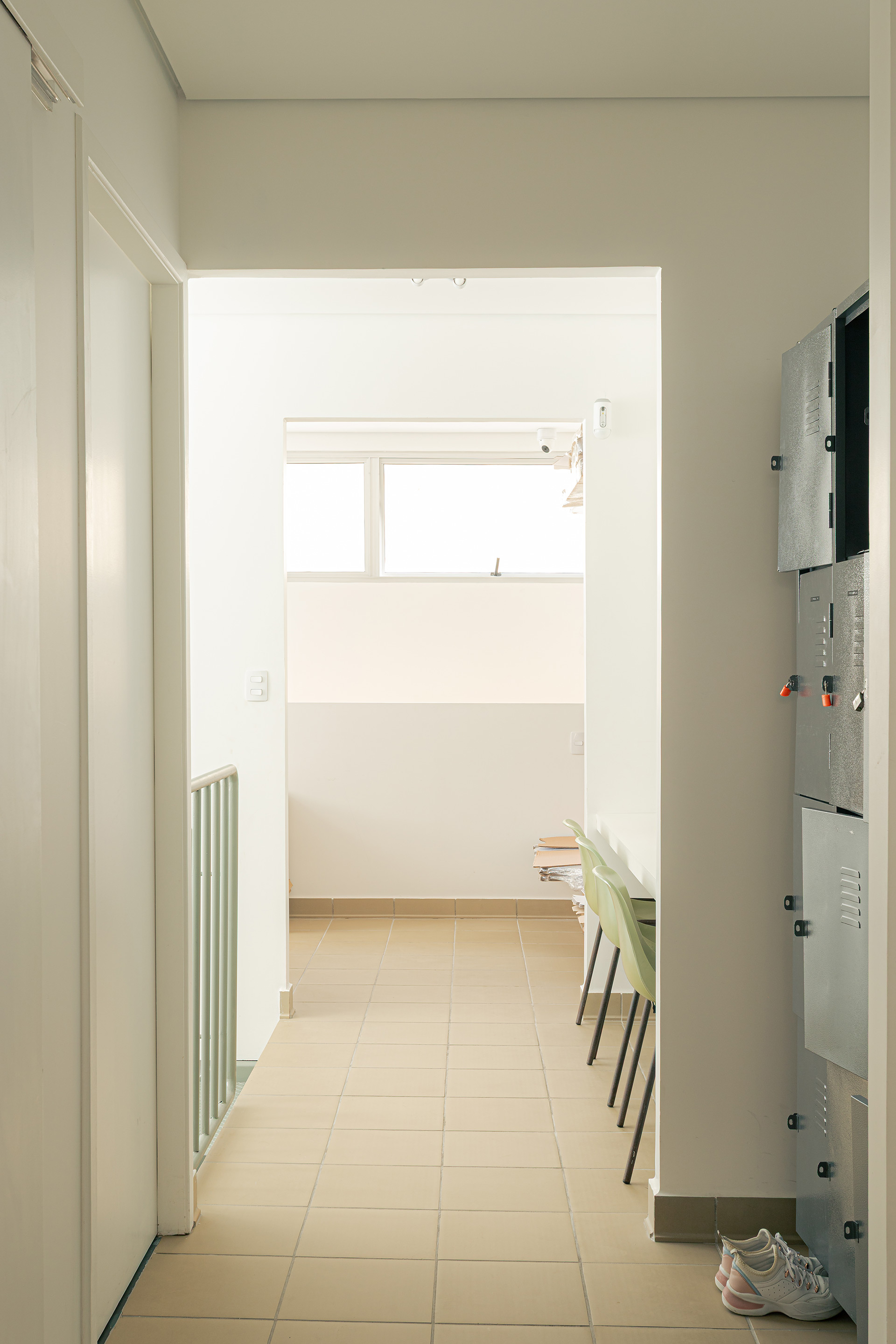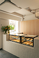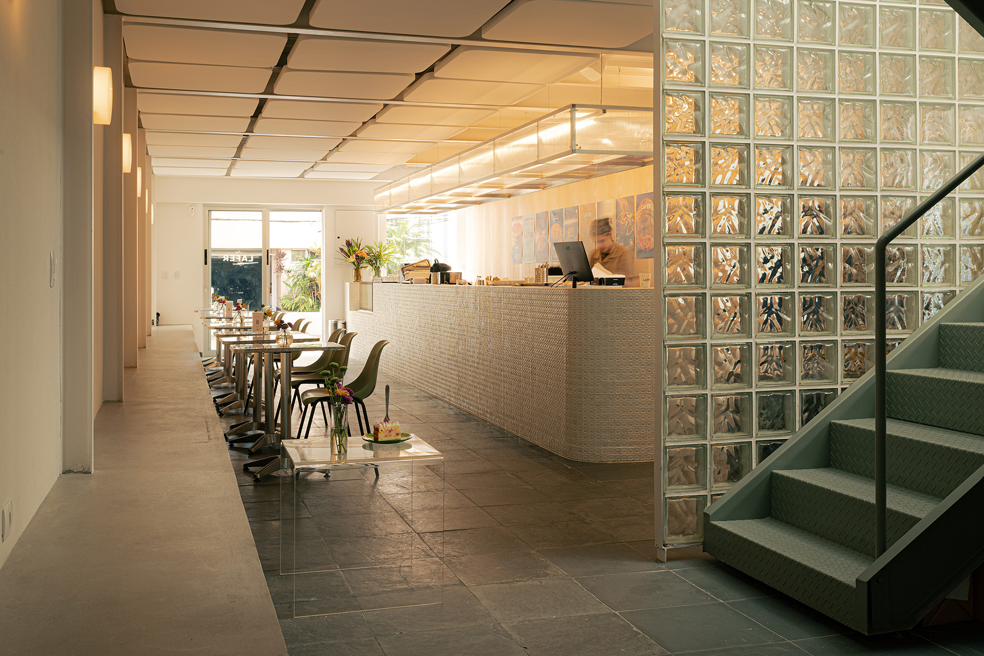 Ao entrar, o salão se organiza em um único ambiente. De um lado está o amplo balcão de atendimento, e do outro, as mesas se distribuem ao longo de um banco contínuo, que se estende desde o exterior até os fundos do imóvel, criando uma sensação de continuidade espacial. As janelas voltadas para o pátio compartilhado foram mantidas, garantindo iluminação e ventilação naturais ao interior do conjunto. Por outro lado a circulação vertical foi inteiramente redesenhada, permitindo melhor distribuição dos usos no pavimento superior.