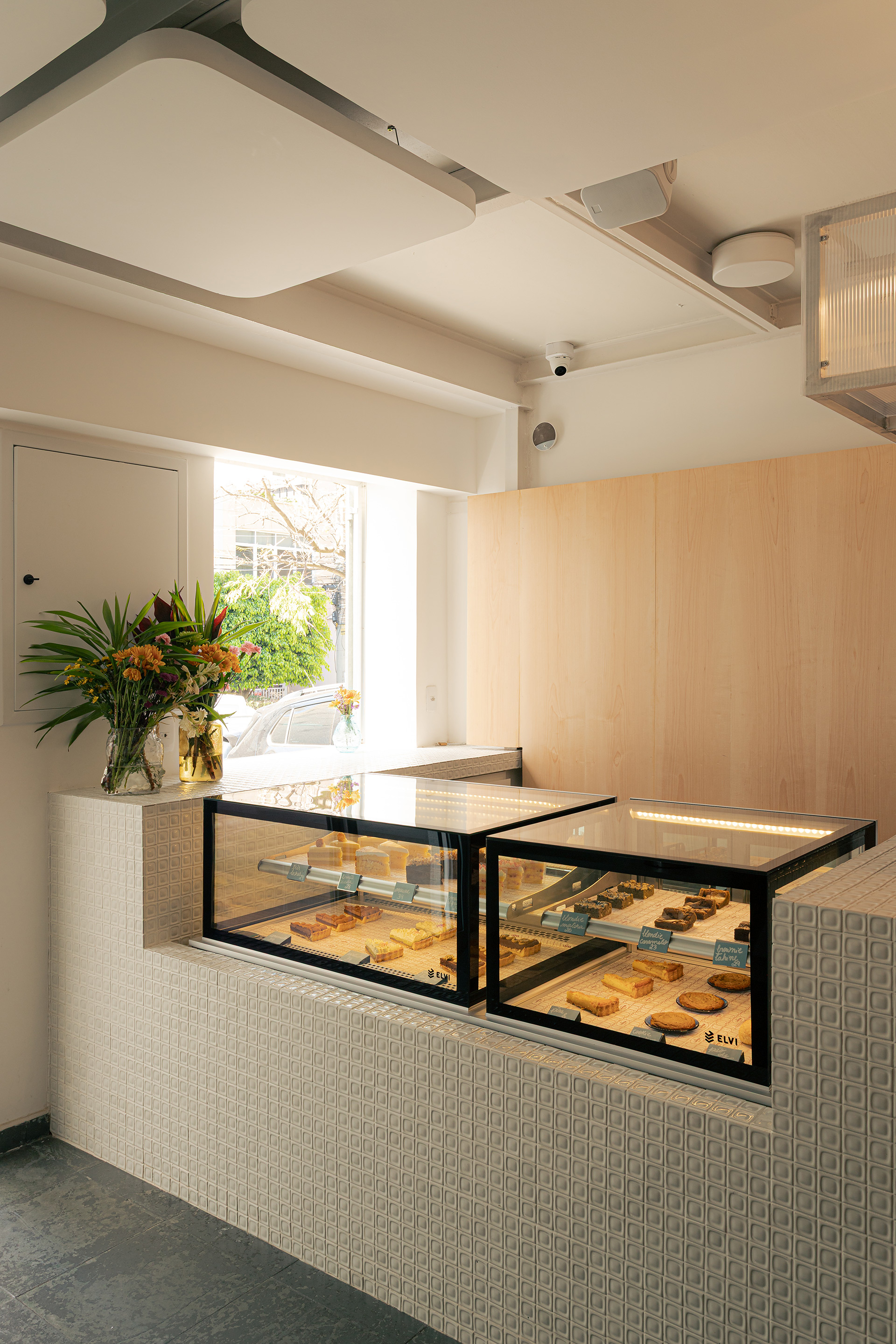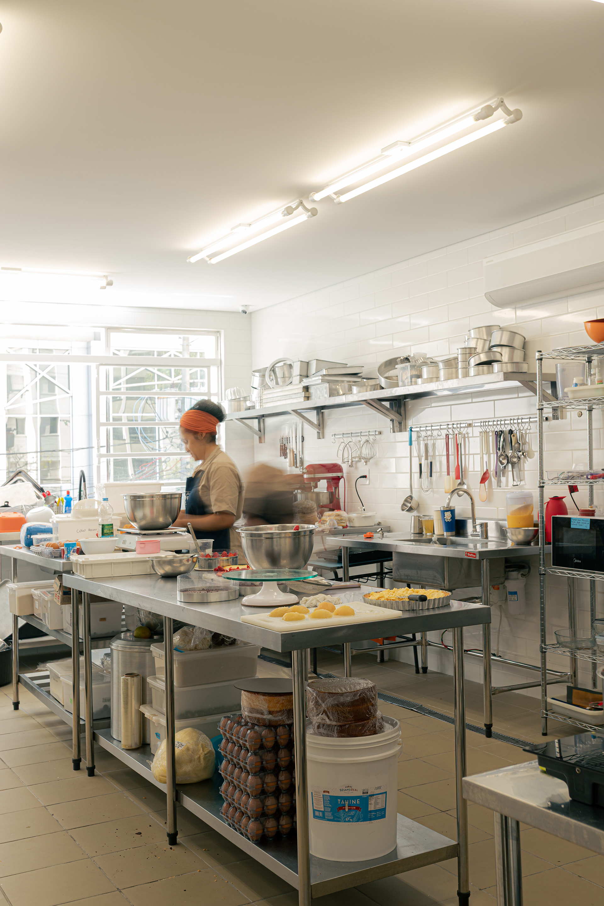 O desafio central do projeto foi acomodar uma generosa cozinha industrial no pavimento superior, junto às áreas de apoio, e criar no térreo um salão acolhedor e permeável ao olhar da rua, capaz de convidar o público para o interior do espaço. Para isso, o recuo frontal foi completamente reformulado: construiu-se uma rampa de acesso que garante a acessibilidade ao conjunto, uma janela de atendimento externo que permite a retirada ágil de encomendas, e um espaço voltado para o serviço junto à rua, reforçando a integração entre interior e exterior.