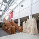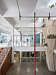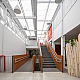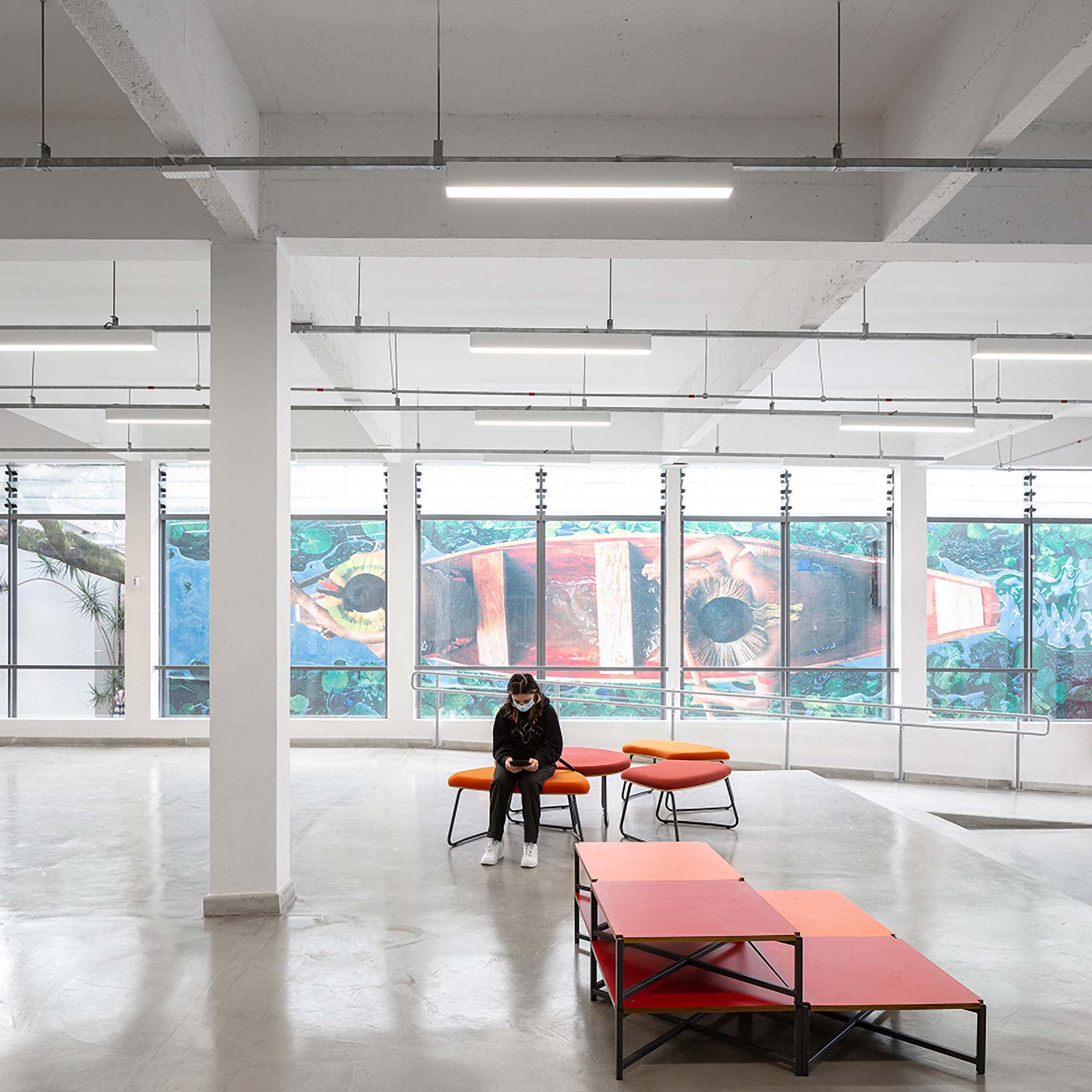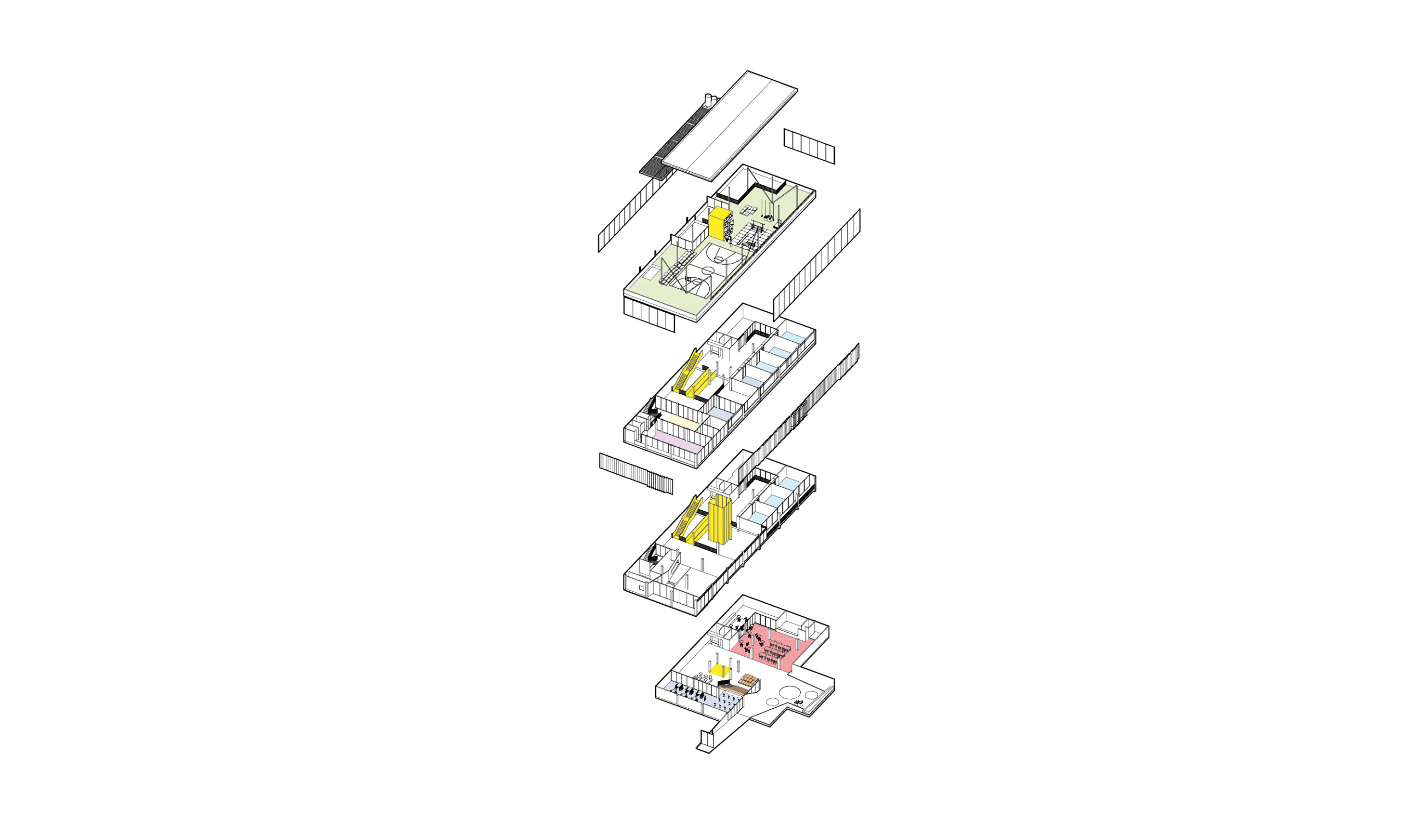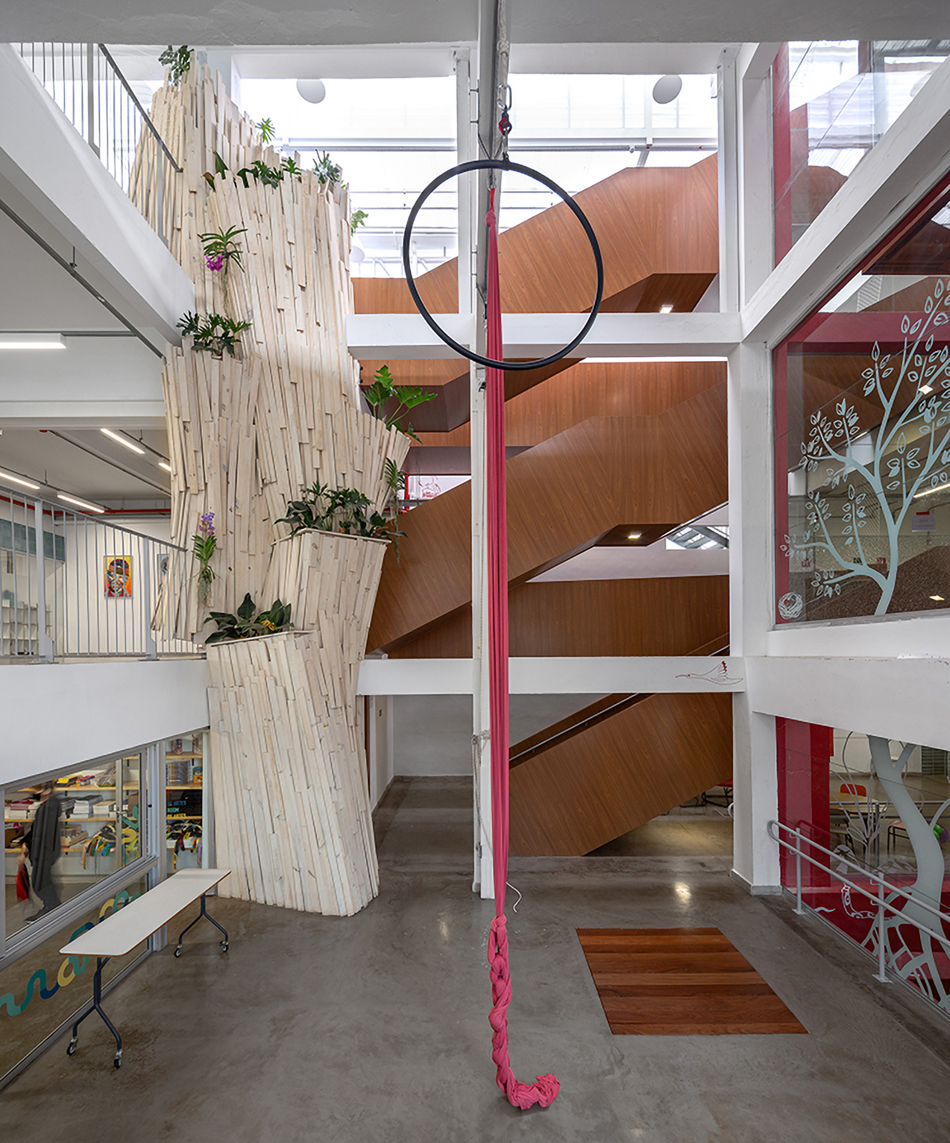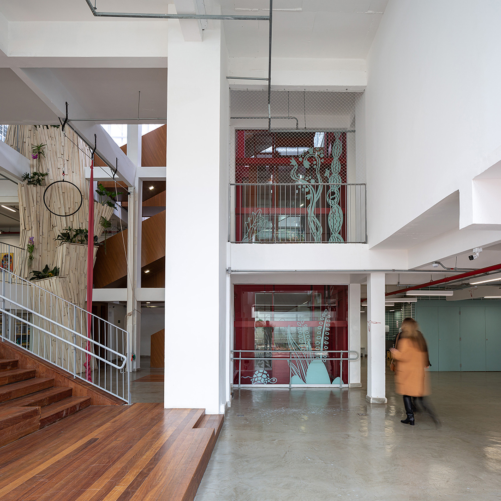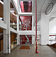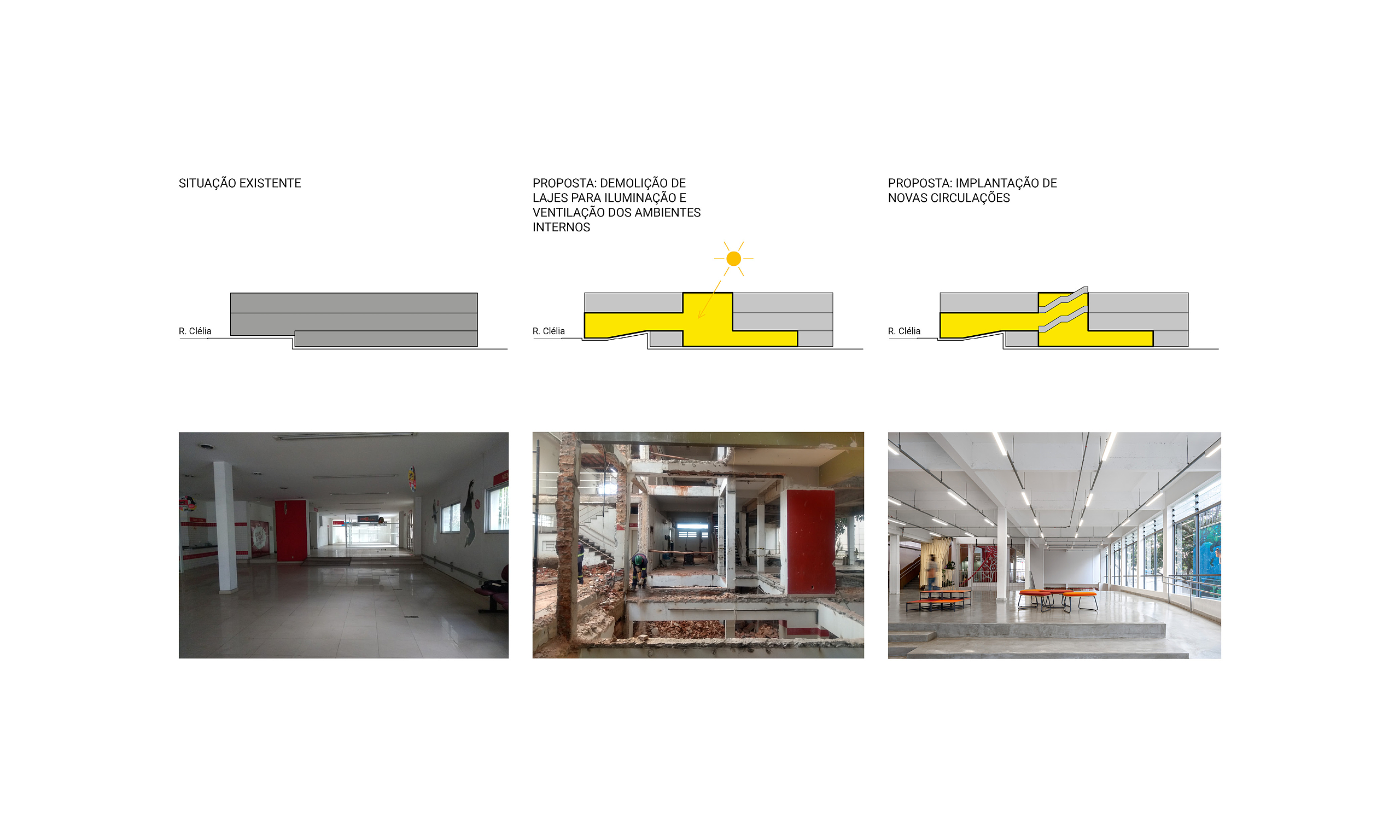 O primeiro movimento da nossa proposta buscou criar uma praça central que por um lado integrasse os diferentes níveis e por outro captasse luz natural para iluminar e ventilar as partes mais escuras da edificação. Neste espaço, construído por uma série de grandes demolições de laje, foram implantados, além do vazio central, um novo sistema de circulações verticais adequadas a crianças de múltiplas idades. O elevador de carros existente foi completamente reformado, aproveitando o vazio para instalar um elevador panorâmico que permite uma visão cinematográfica do percurso transversal ao longo de todos os níveis do edifício.