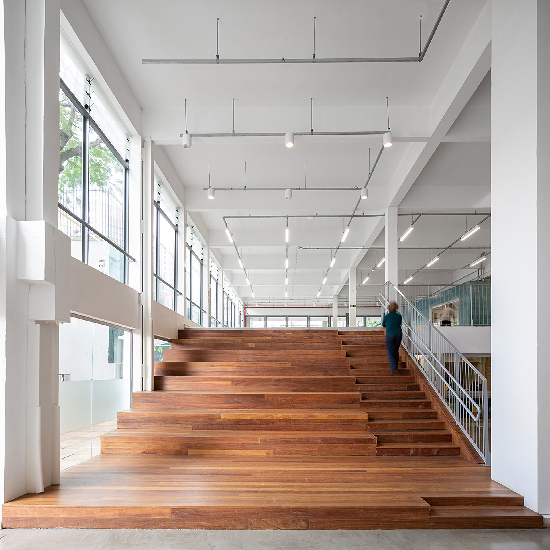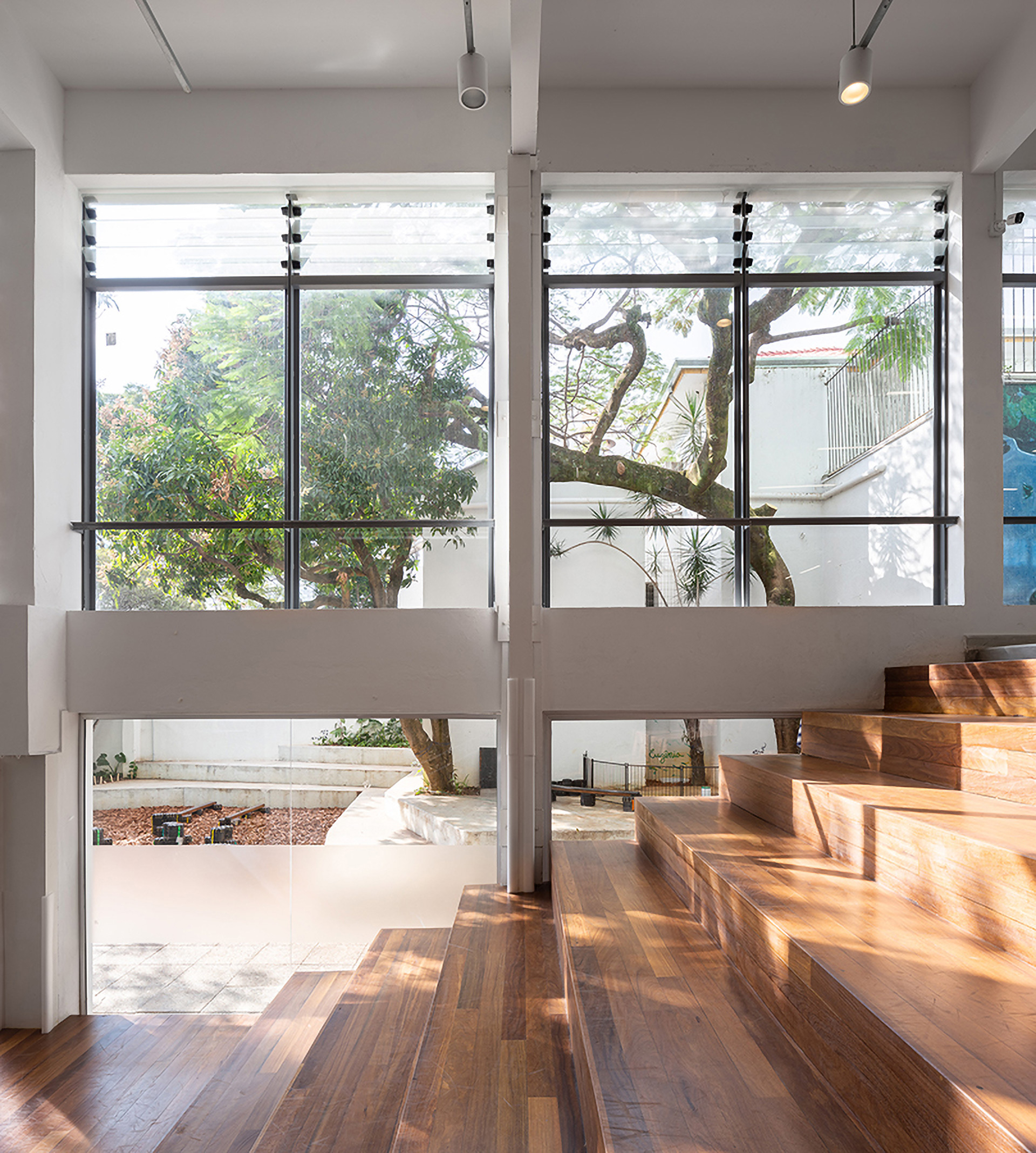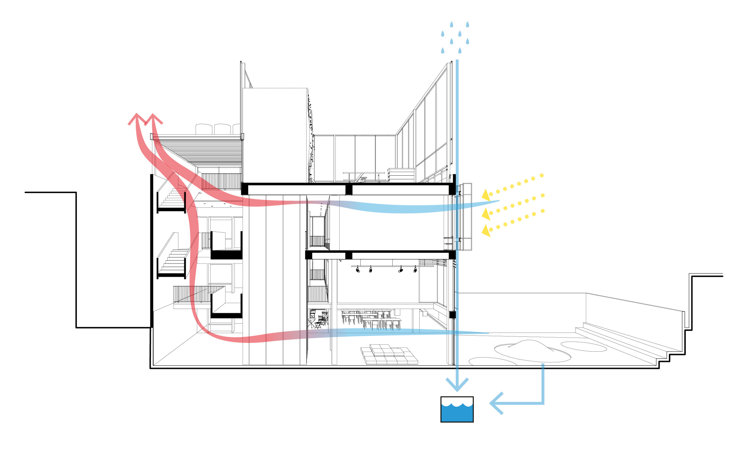 As principais estratégias projetuais desta reforma buscaram justamente tirar partido tectônico e espacial das demandas relacionadas à climatização e iluminação natural dos ambientes. As Grandes demolições de lajes permitem tanto a iluminação natural dos ambientes mais escuros da edificação ao longo de todos os pavimentos, quanto a circulação de ar natural, que entra mais fresco próximo do solo no pavimento inferior e sai mais quente pela nova cobertura ventilada que protege a circulação vertical. Na fachada Leste, onde estão posicionadas as salas de aula, implantamos um sistema de brises móveis em chapa perfurada que permite regular a incidência direta do sol sem prejudicar a entrada de luz difusa do ambiente externo,contribuindo para o baixo consumo de energia elétrica, tanto para a iluminação, quanto para a climatização dos ambientes. Finalmente, foram pensados sistemas de captação de energia solar na cobertura do edifício e de captação de águas pluviais para diminuir o uso de recursos no uso da edificação.