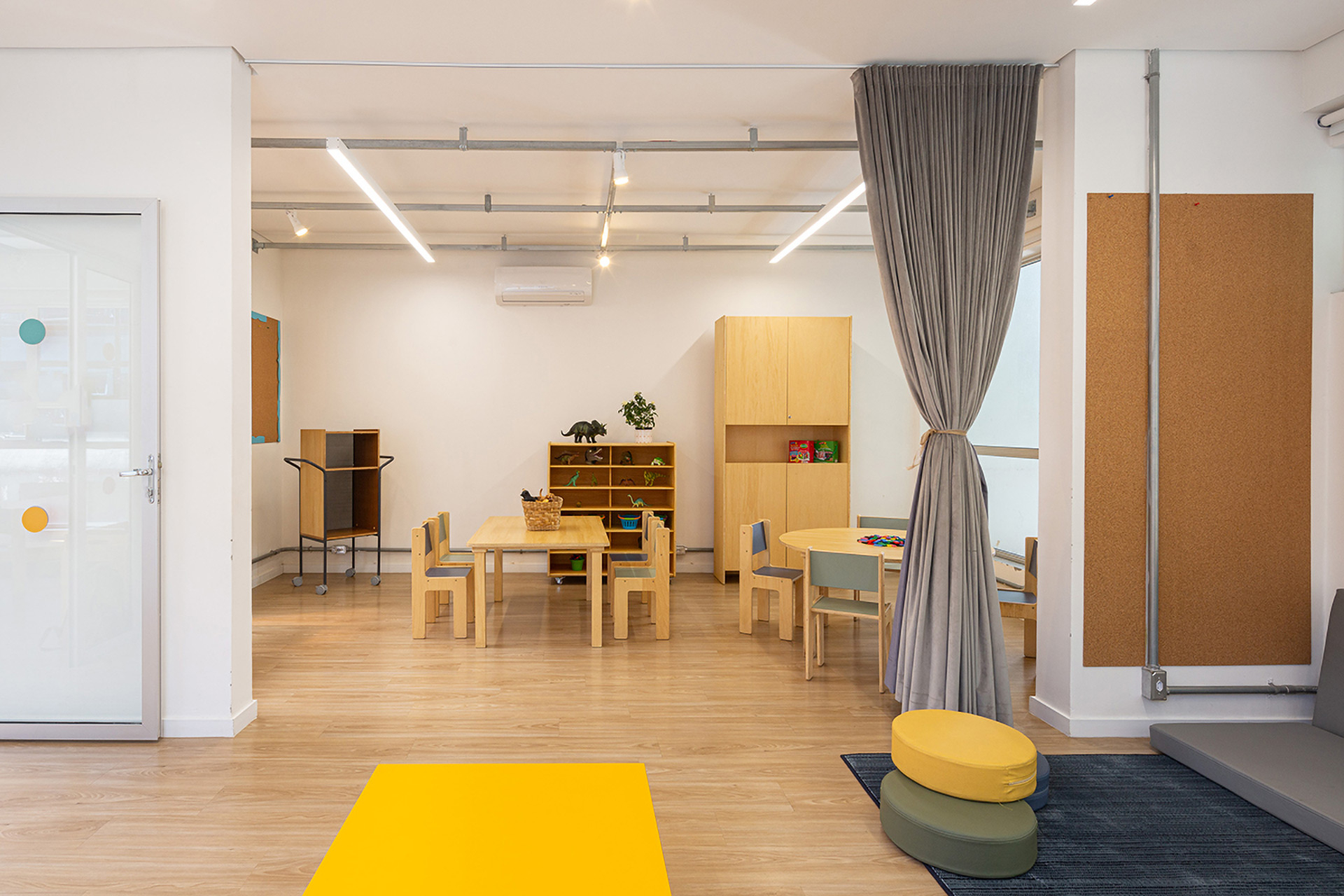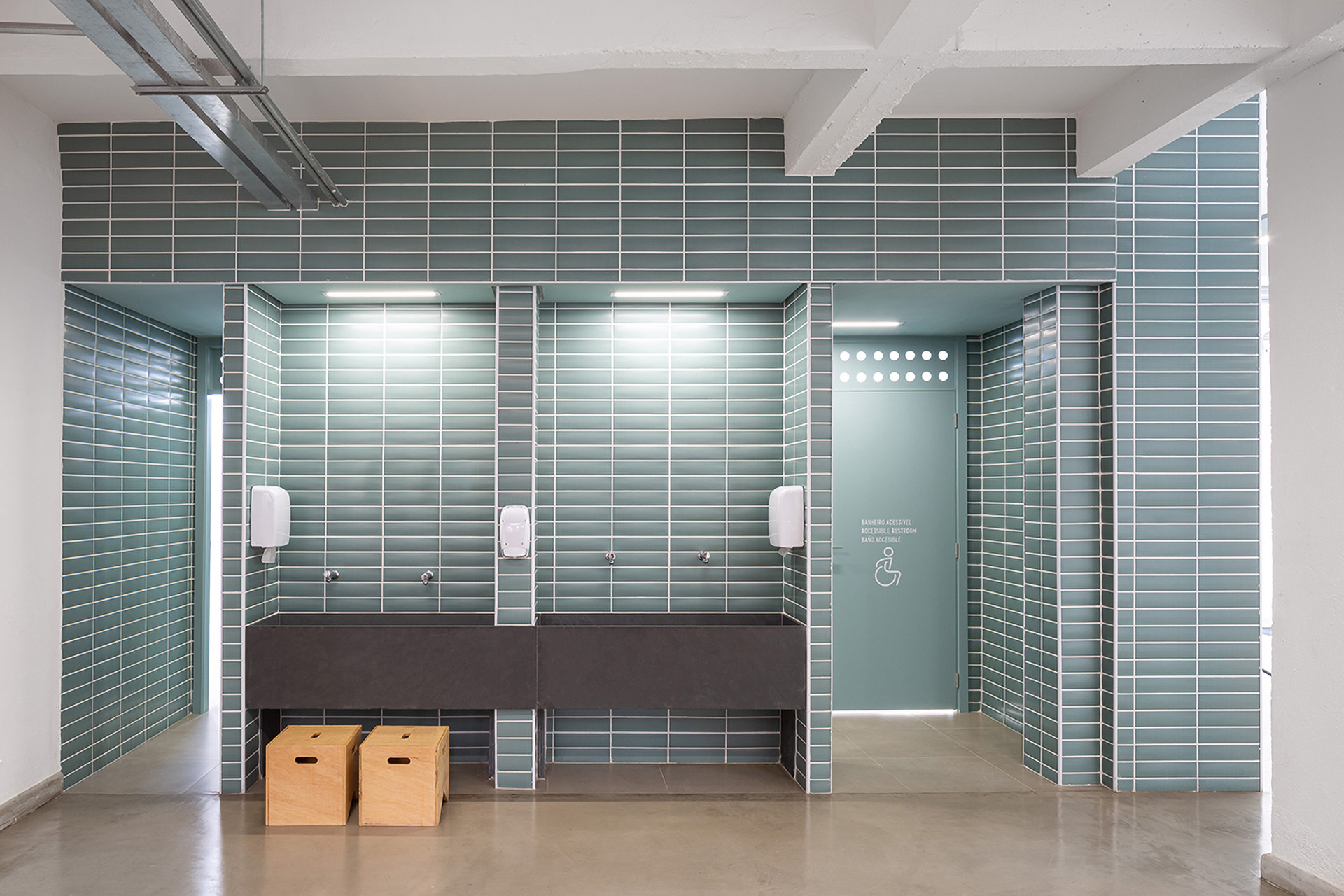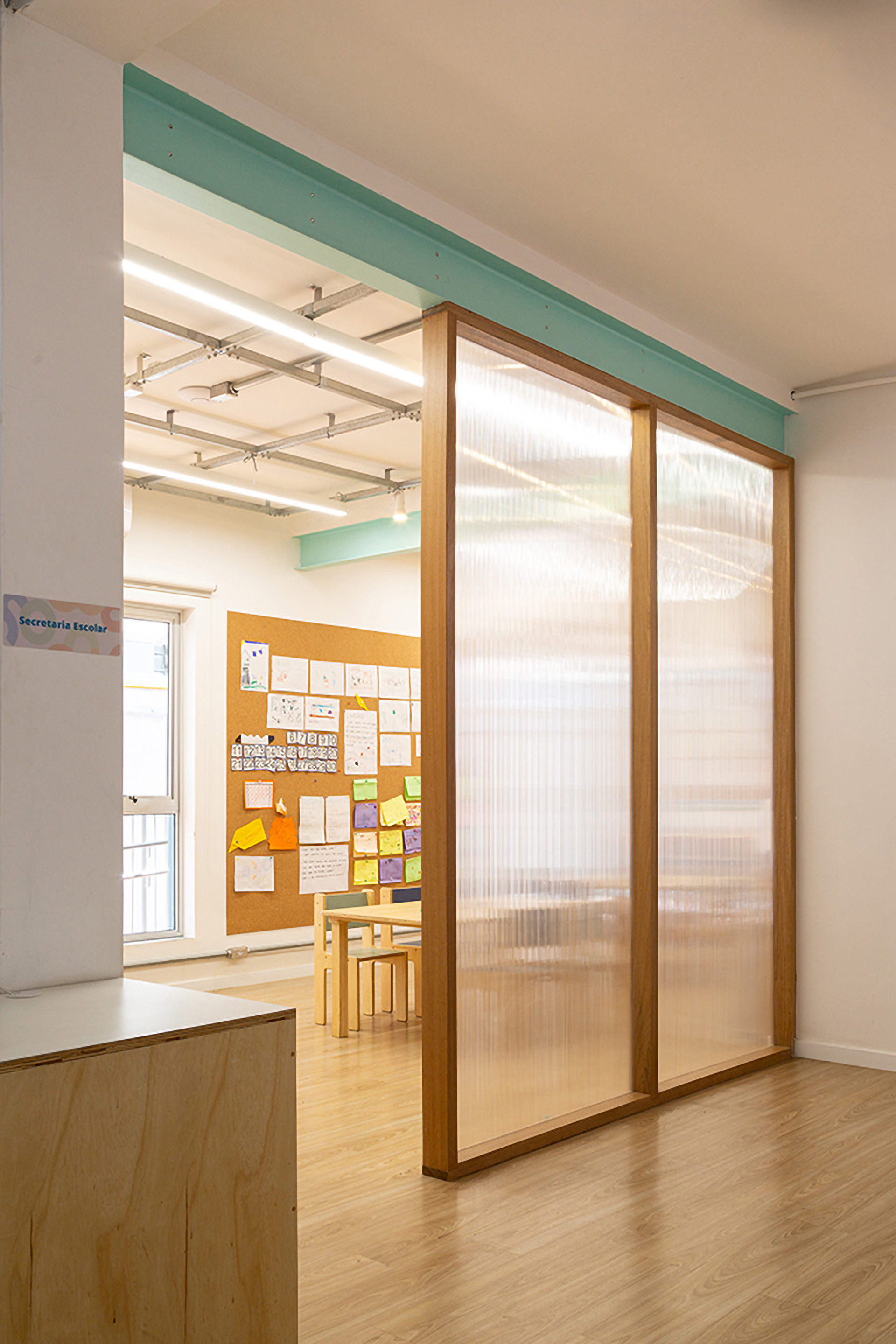 A materialidade da escola aproveita, por um lado, a estrutura de concreto existente que recebe pintura branca para clarear os ambientes internos e, por outro, se vale de alguns revestimentos coloridos que mapeiam de forma didática componentes importantes de apoio à atividade principal (banheiros, cozinha e área administrativa). As salas de aula foram subdivididas com divisórias de drywall, que permitem uma construção leve sem exigir muito da estrutura existente, além de certa flexibilidade para rearranjar estes espaços. As circulações verticais e a arquibancada são revestidas em madeira buscando dar destaque a este conjunto importante que marcam a nossa intervenção.