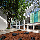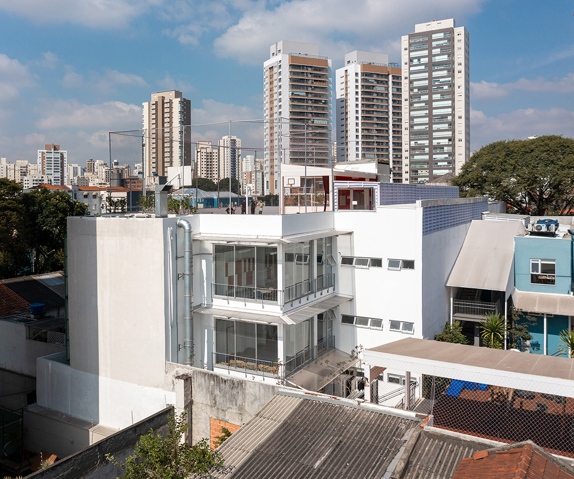 Um segundo grande movimento propõe uma nova fachada lateral que possibilita a aproximação entre o ambiente interno da escola com o ambiente externo, permitindo, além do contato com as árvores existentes, o aproveitamento de luz e ventilação naturais. Esta fachada voltada para o Leste recebeu um sistema de brises móveis em chapa perfurada que permite filtrar a luz direta do sol da manhã quando desejado, melhorando a performance climática das salas de aula aqui posicionadas.