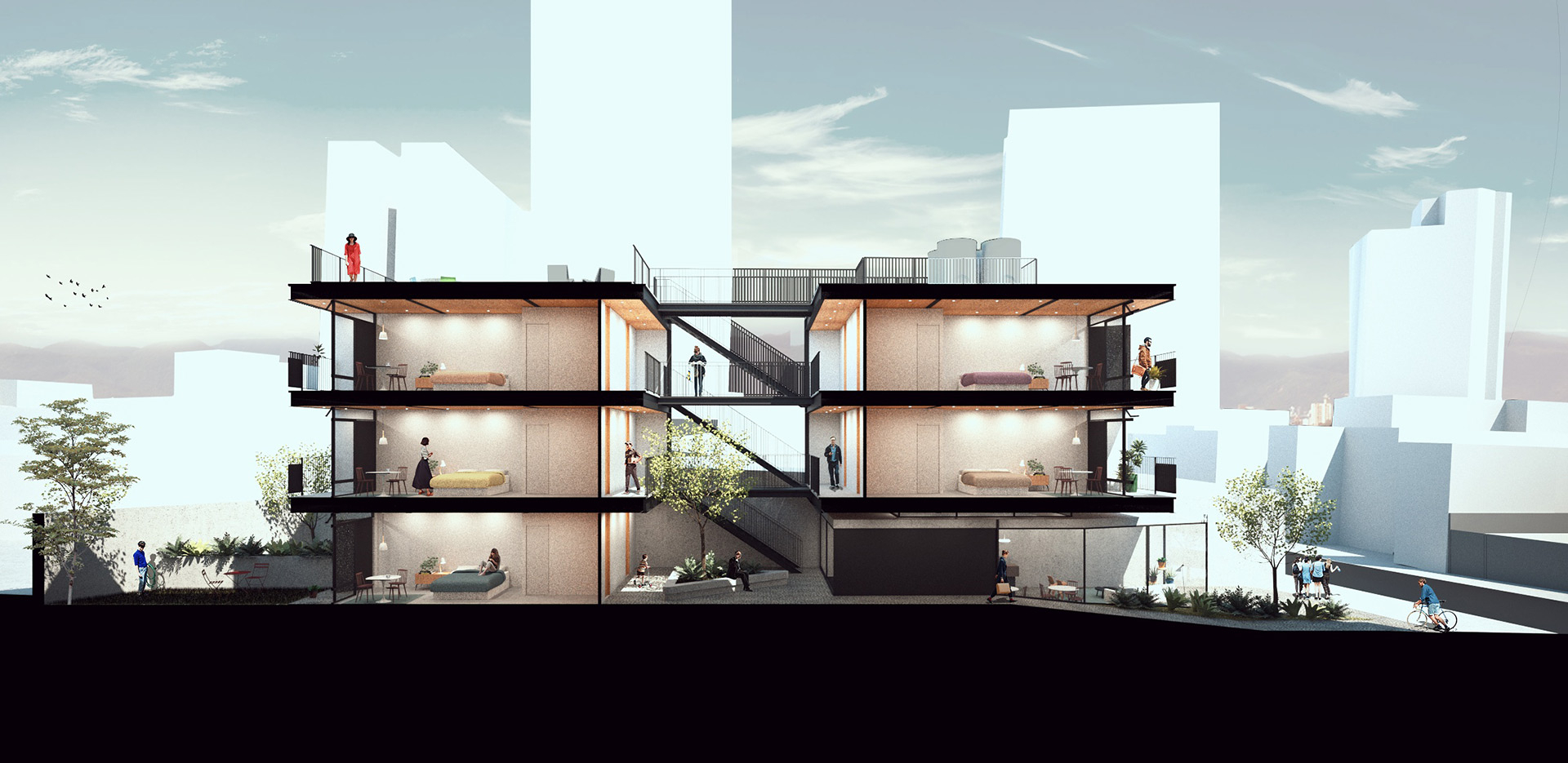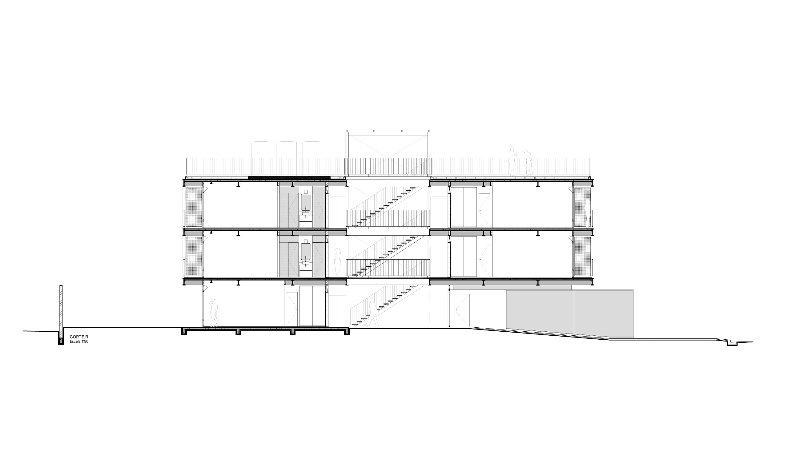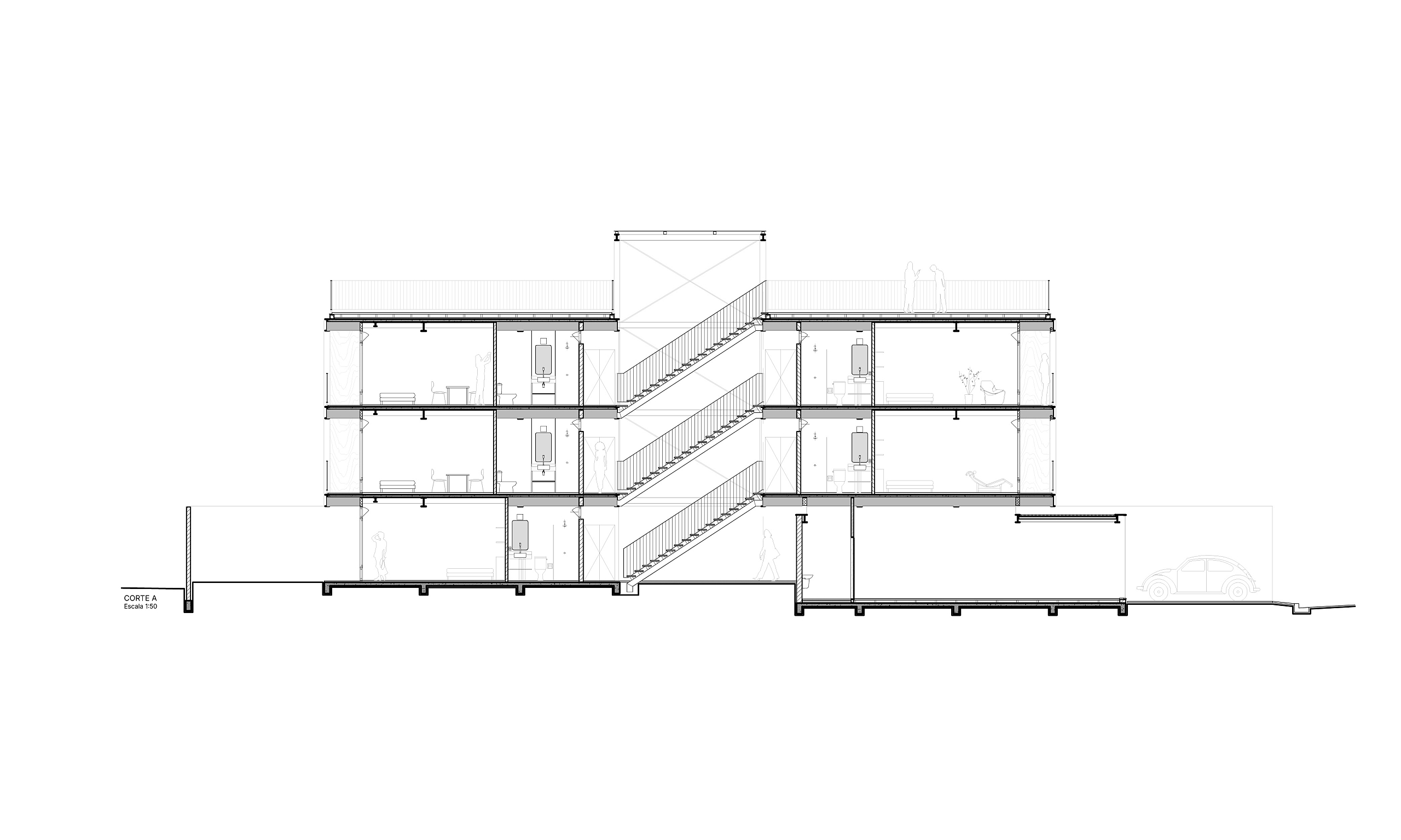 Com doze estúdios compactos, sendo 6 de 29,70m² e 6 menores, de 20,30m², o projeto possui um pátio central que ilumina, garante a ventilação cruzada das unidades e organiza a circulação vertical para os dois blocos de estúdios. A estrutura metálica segue uma modulação racional e é construída com apenas um tipo de pilar e um tipo de viga. Tal pragmatismo no viés construtivo deste projeto visa uma construção econômica, limpa e rápida.