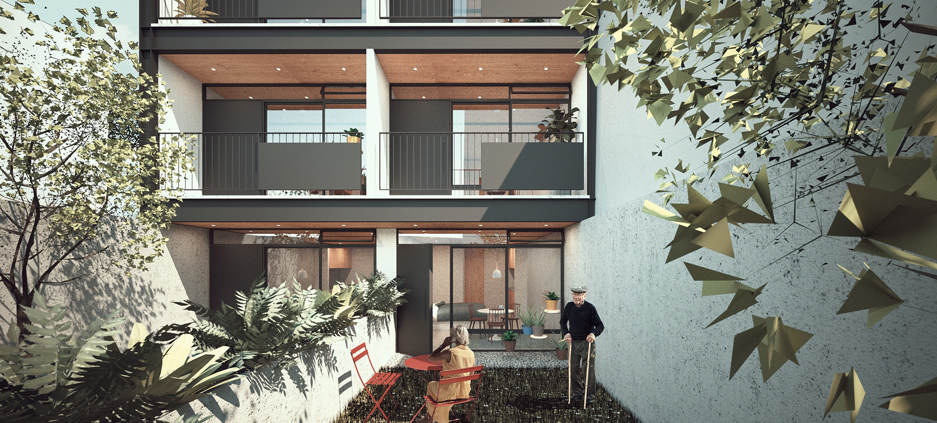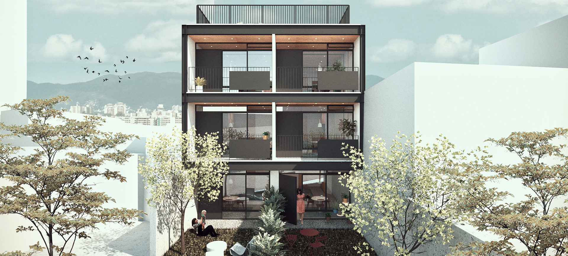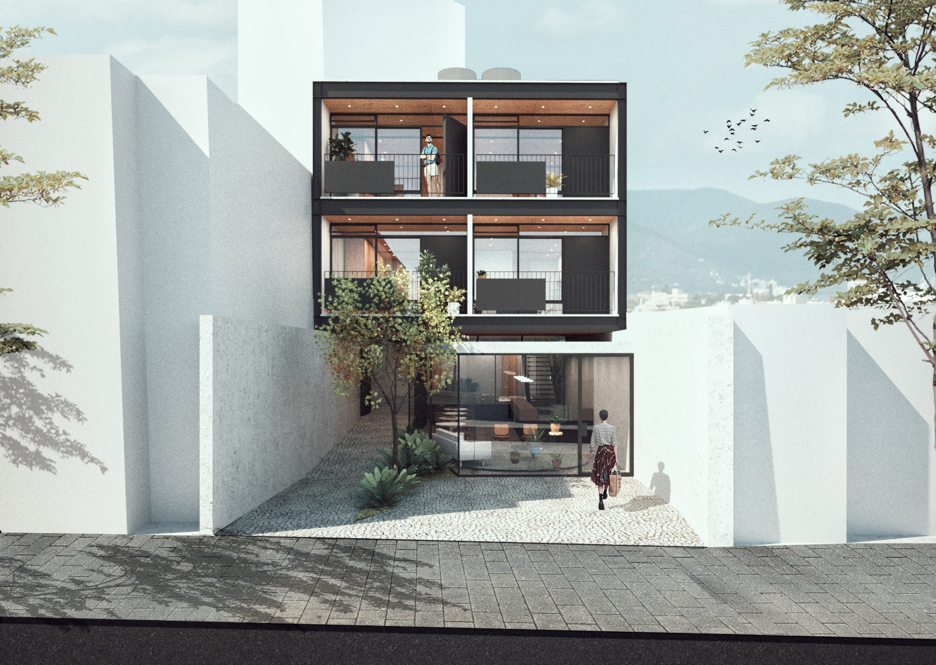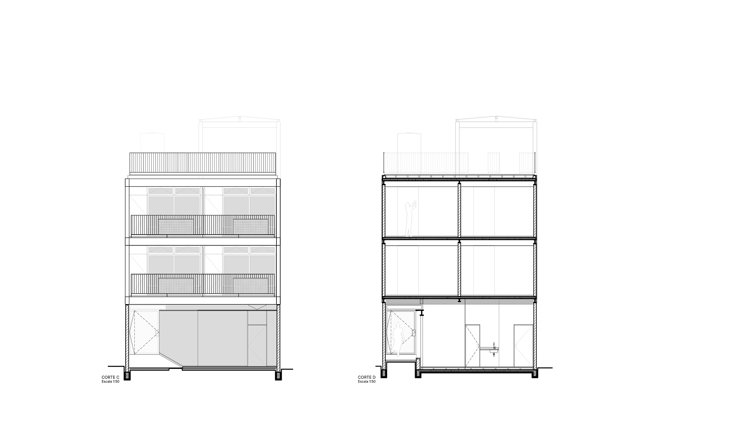 O edifício Maria Dulce é um projeto de uso misto, com um espaço para uso comercial no térreo de acesso independente e dois blocos habitacionais de dois pavimentos.