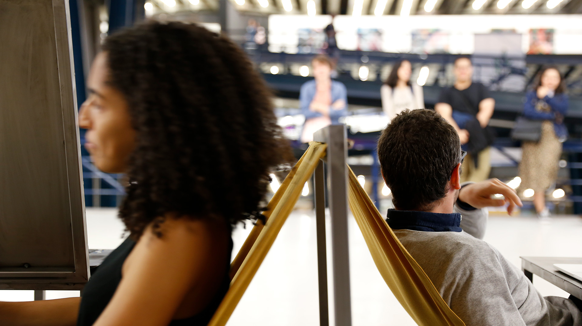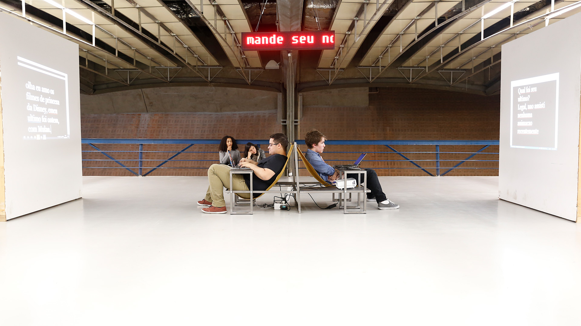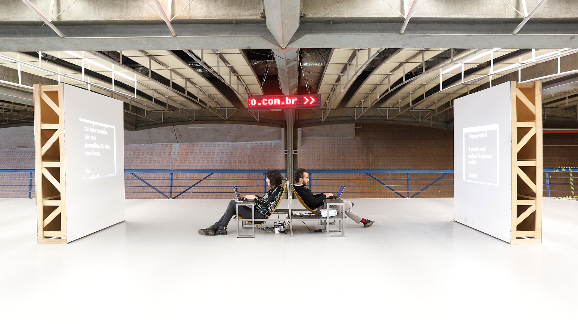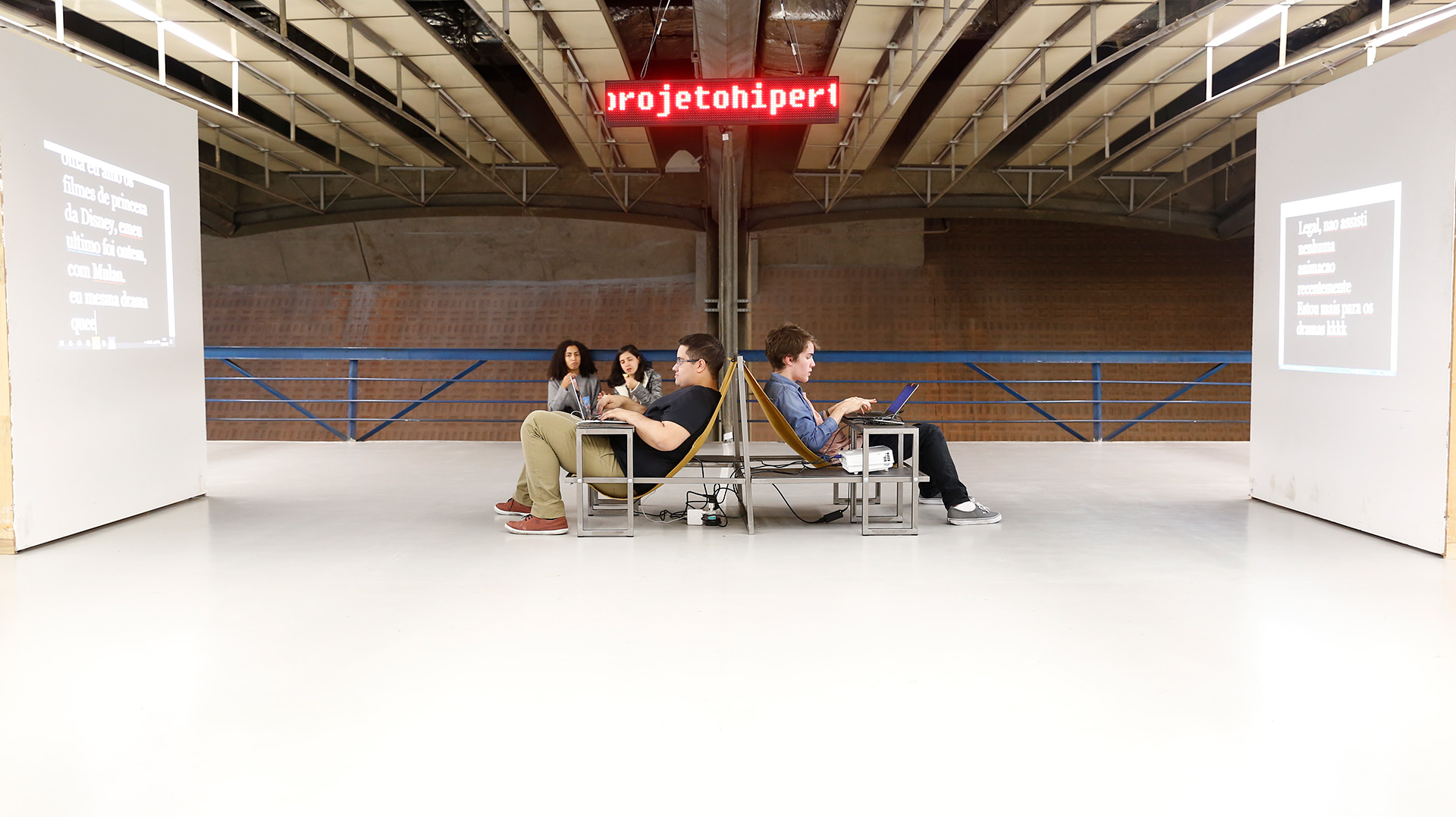Objeto cênico realizado para ação pública idealizada por Gustavo Colombini e João Dias Turchi. A máquina_hipertexto é um dos desdobramentos públicos do projeto hipertexto, livro-site de autoria da dupla de dramaturgos. A dupla idealizou uma máquina em que duas pessoas sentadas uma de costas para outra, conversam através de mensagens projetadas em telas brancas, um diálogo ao mesmo tempo presente e à distância.