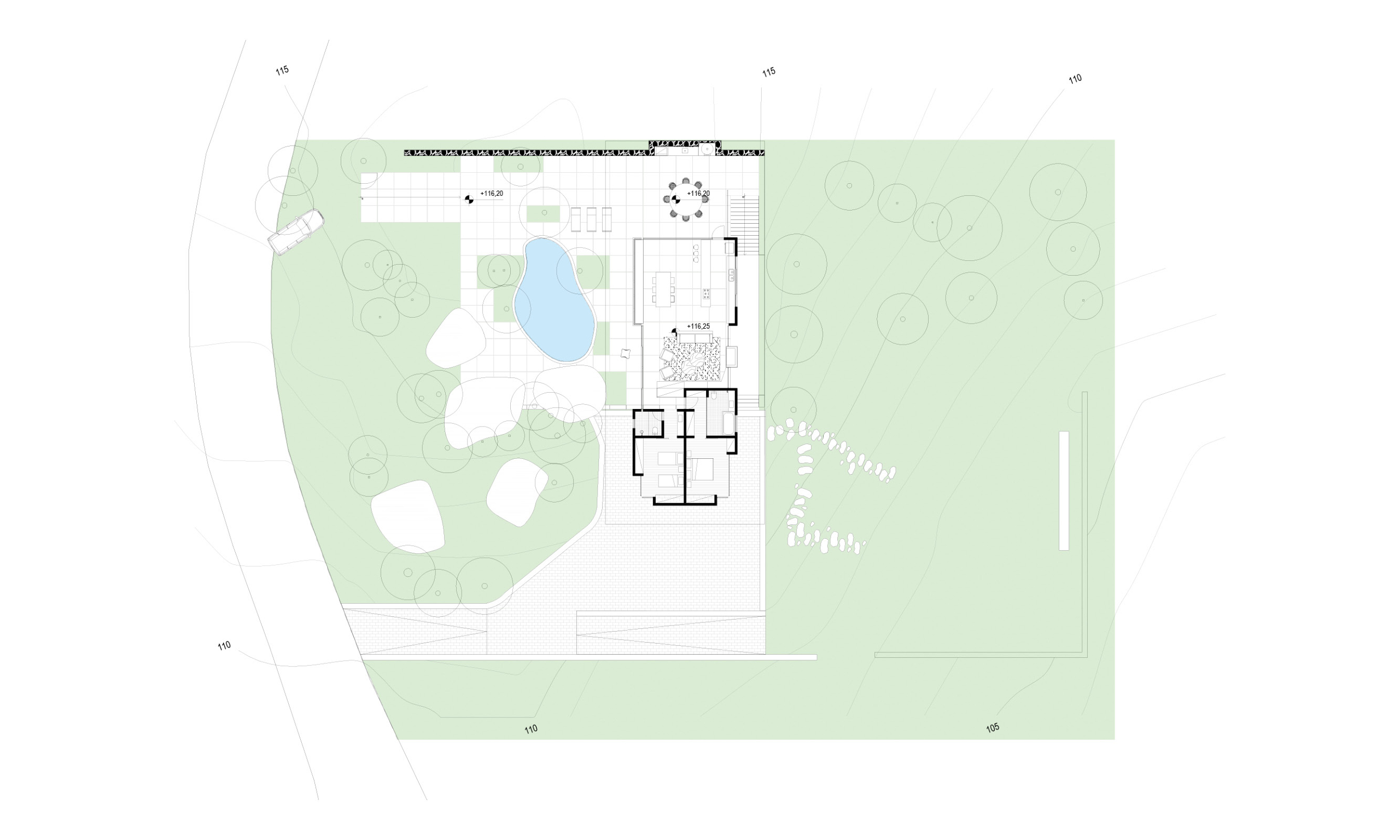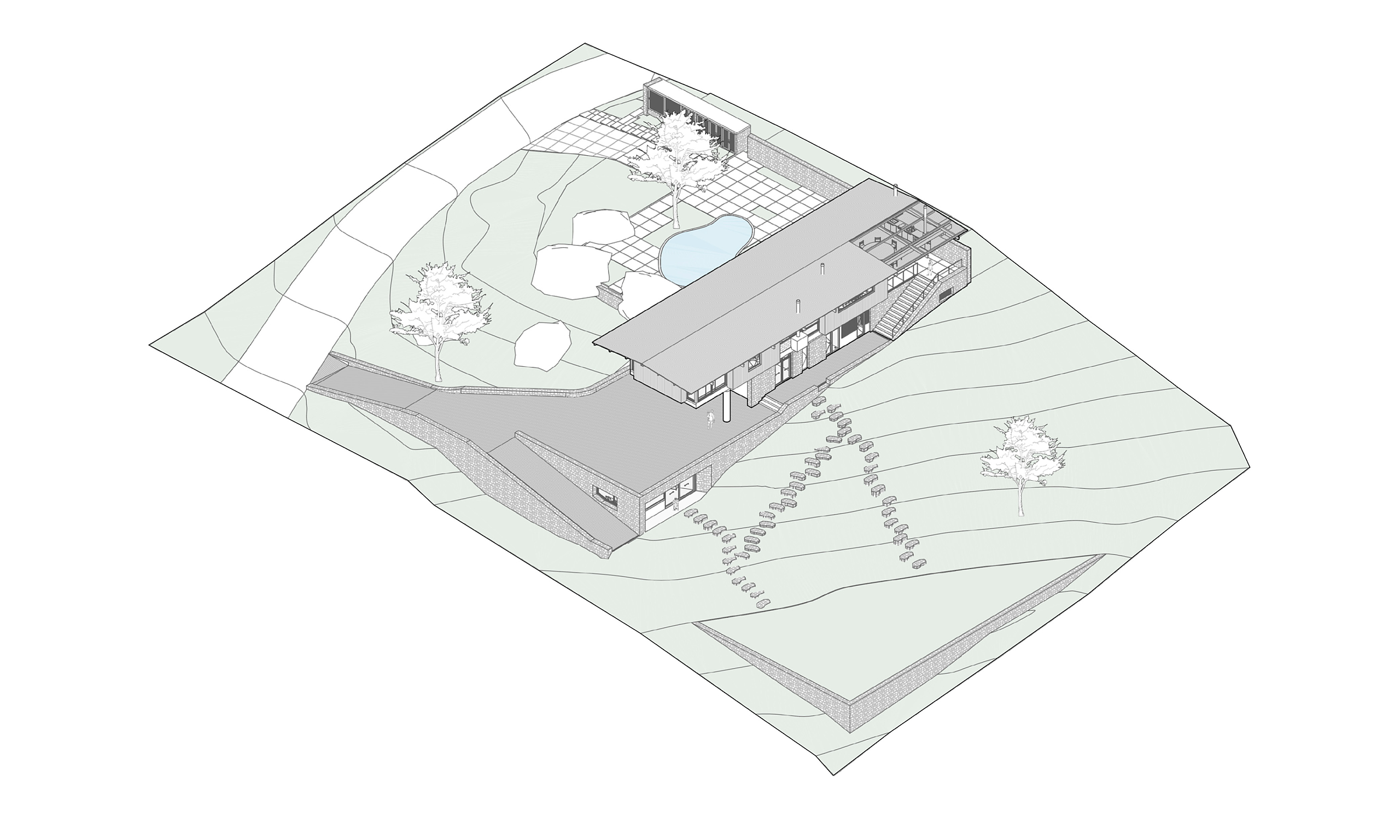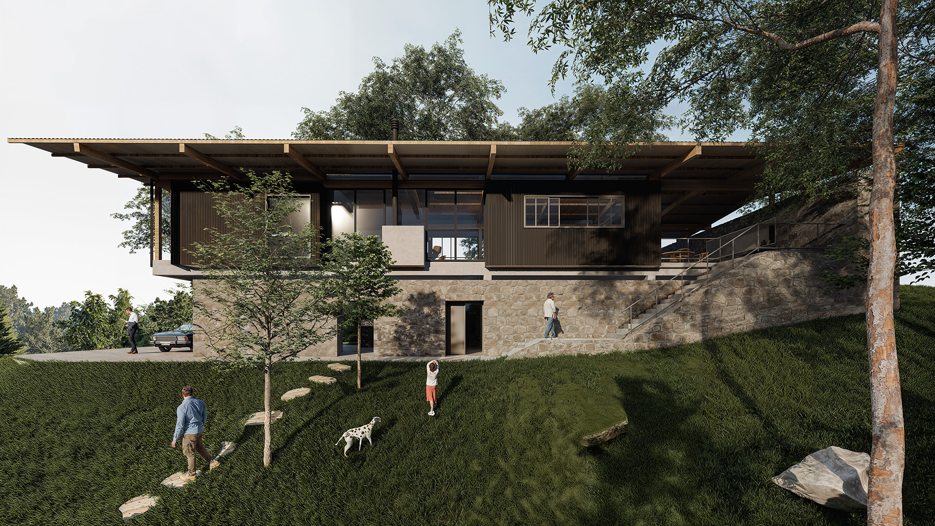 O projeto desta casa foi feito para um jovem casal que decidiu se mudar da cidade de São Paulo e fazer a vida em um lugar mais tranquilo e em contato com a natureza. Assim, buscamos tirar o máximo de proveito da condição geográfica do terreno e implantar a casa de maneira delicada, em meio à vegetação existente. O terreno em declive já conformava um platô em sua cota mais alta. Margeado por grandes pedras, essa área plana do terreno é também a com menos árvore e a que recebe a maior incidência de luz solar direta. Imediatamente esse espaço se tornou o centro da casa, o espaço de encontro e para onde os espaços sócias da casa devem se abrir.