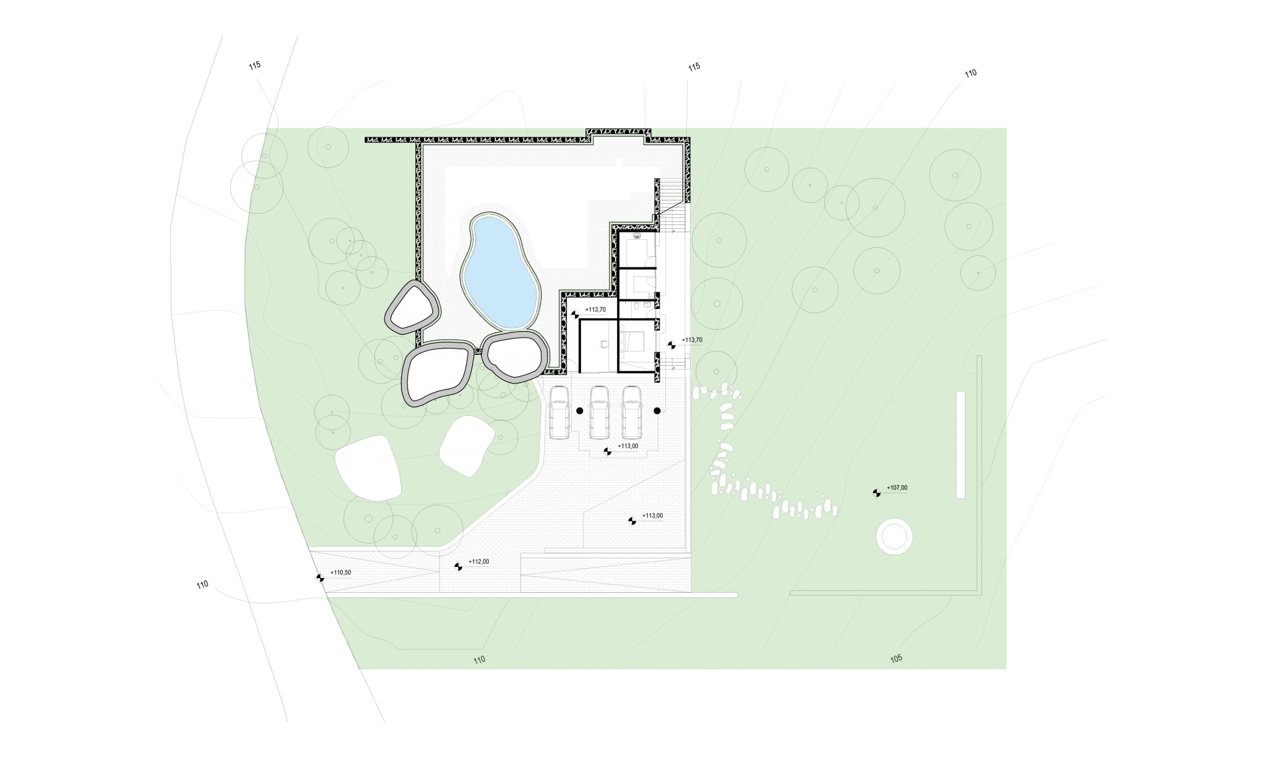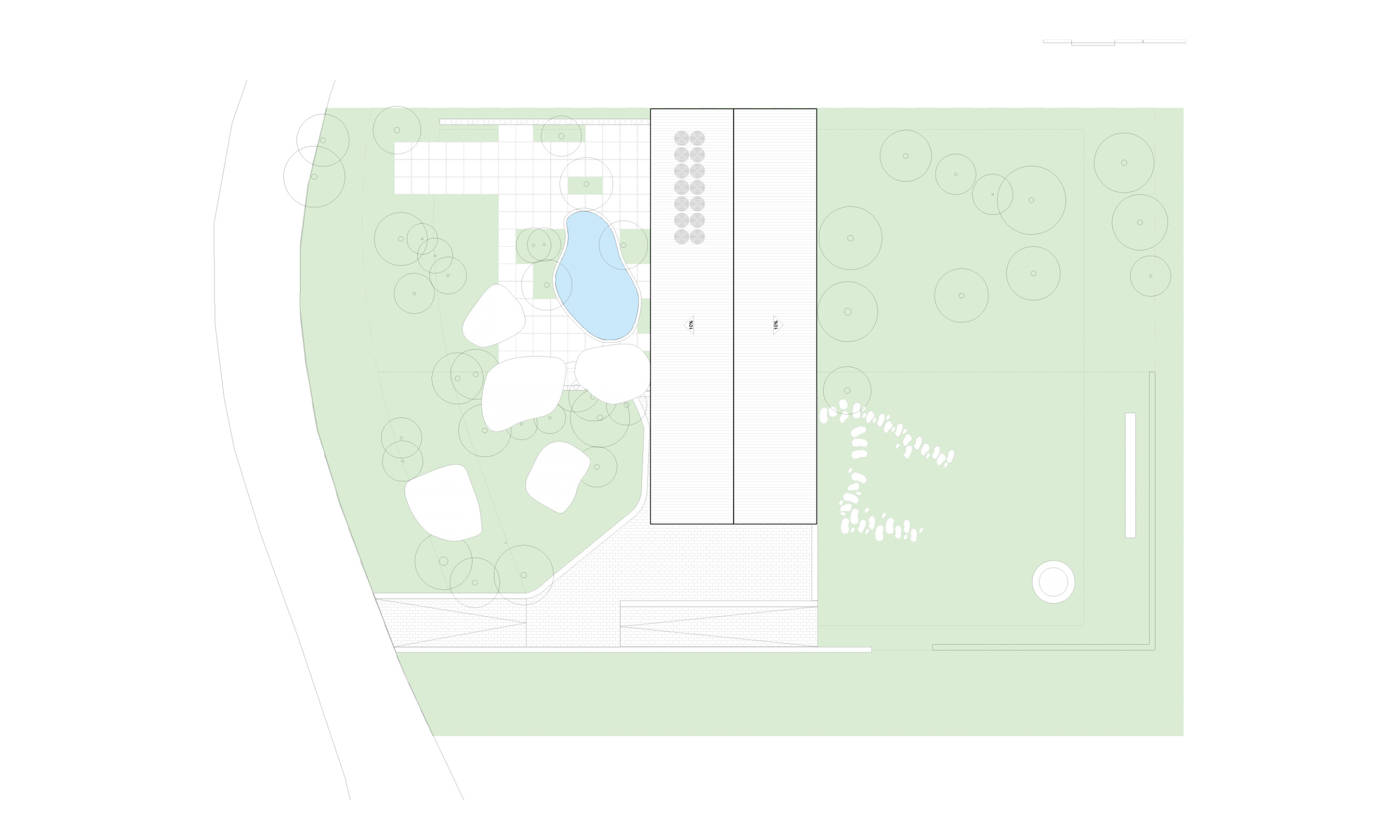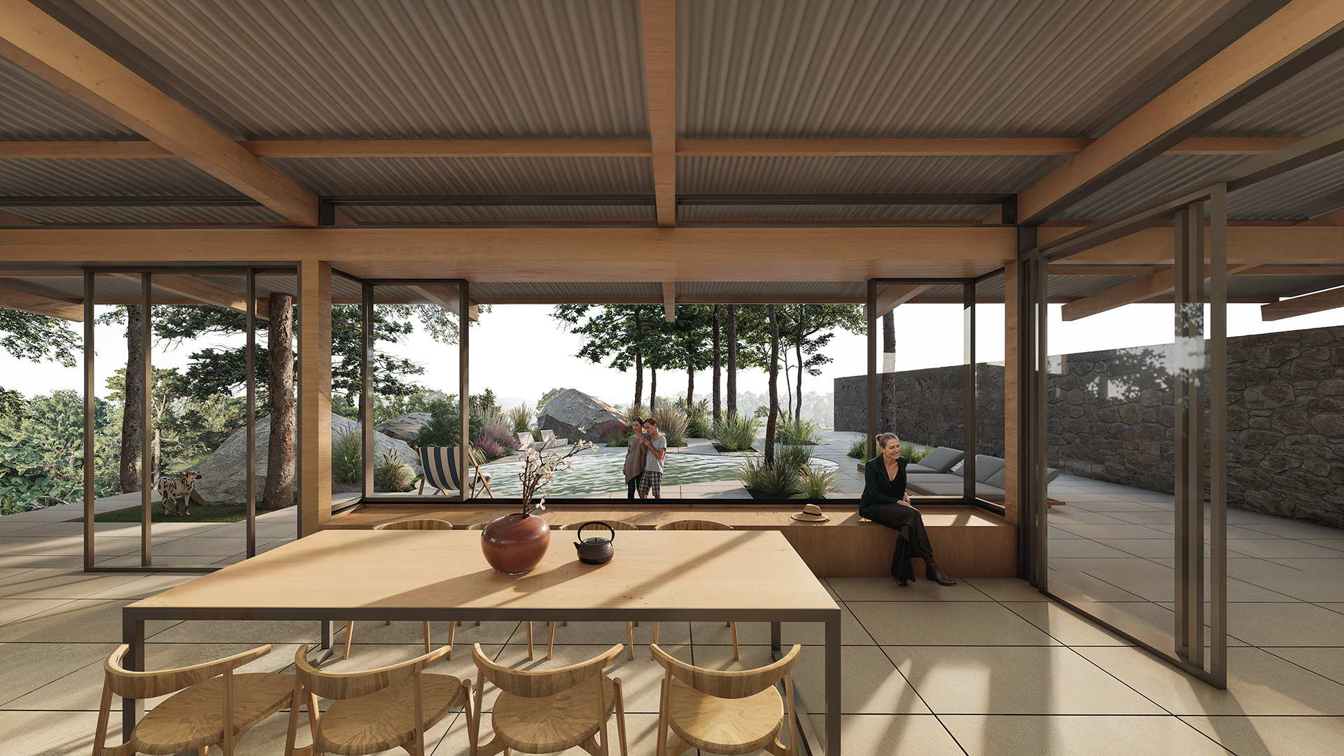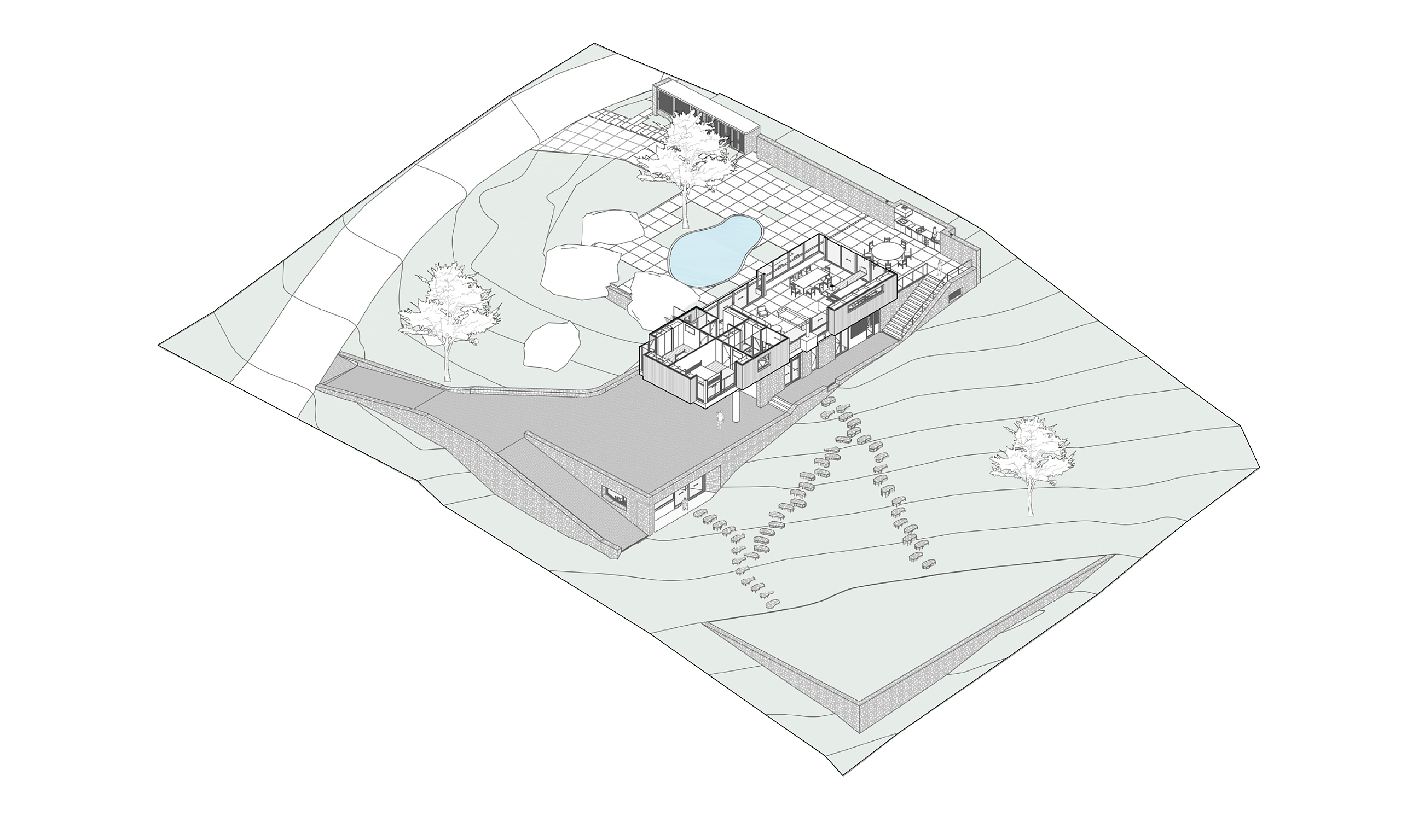 O projeto desta casa foi feito para um jovem casal que decidiu se mudar da cidade de São Paulo e fazer a vida em um lugar mais tranquilo e em contato com a natureza. Assim, buscamos tirar o máximo de proveito da condição geográfica do terreno e implantar a casa de maneira delicada, em meio à vegetação existente. O terreno em declive já conformava um platô em sua cota mais alta. Margeado por grandes pedras, essa área plana do terreno é também a com menos árvore e a que recebe a maior incidência de luz solar direta. Imediatamente esse espaço se tornou o centro da casa, o espaço de encontro e para onde os espaços sócias da casa devem se abrir.