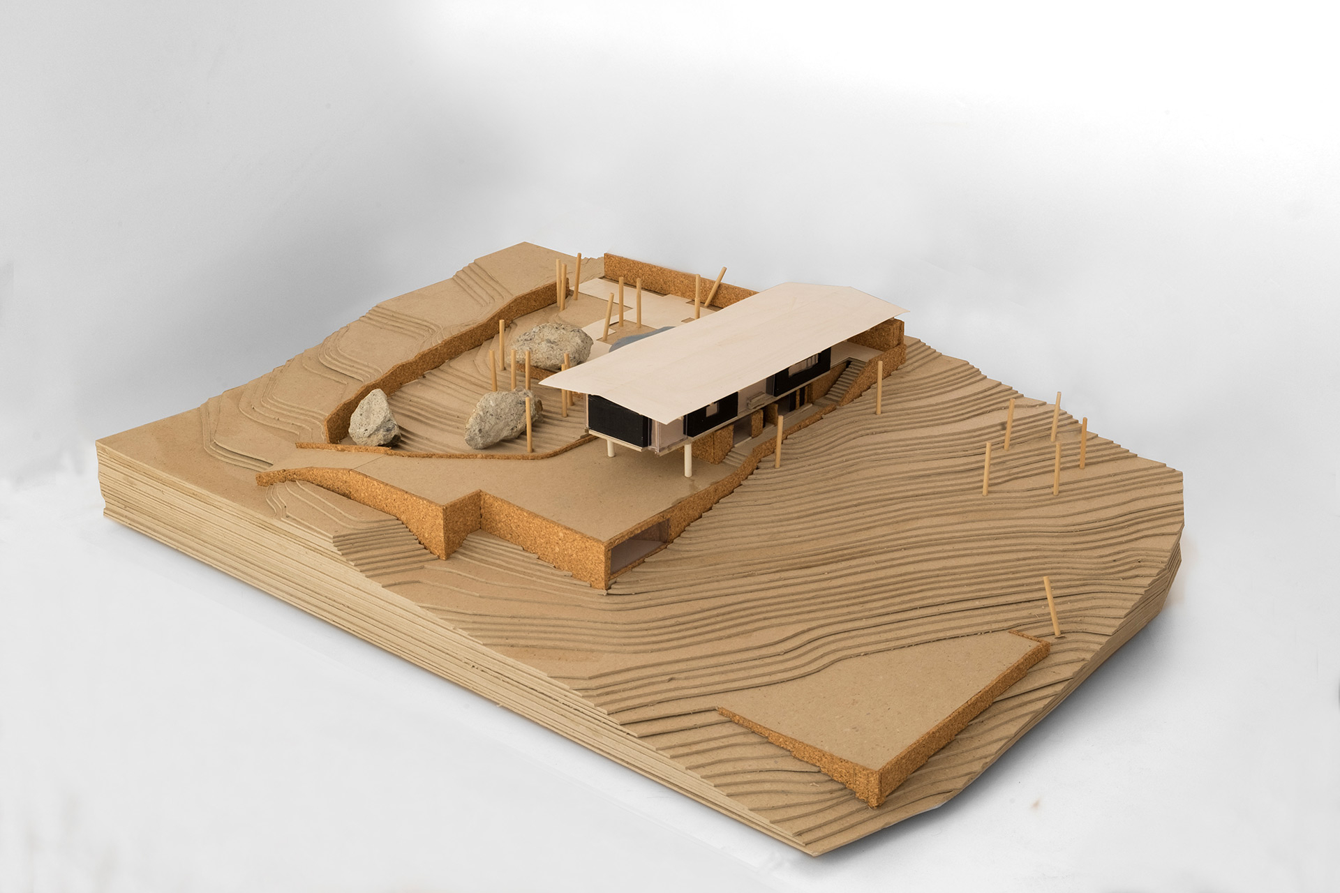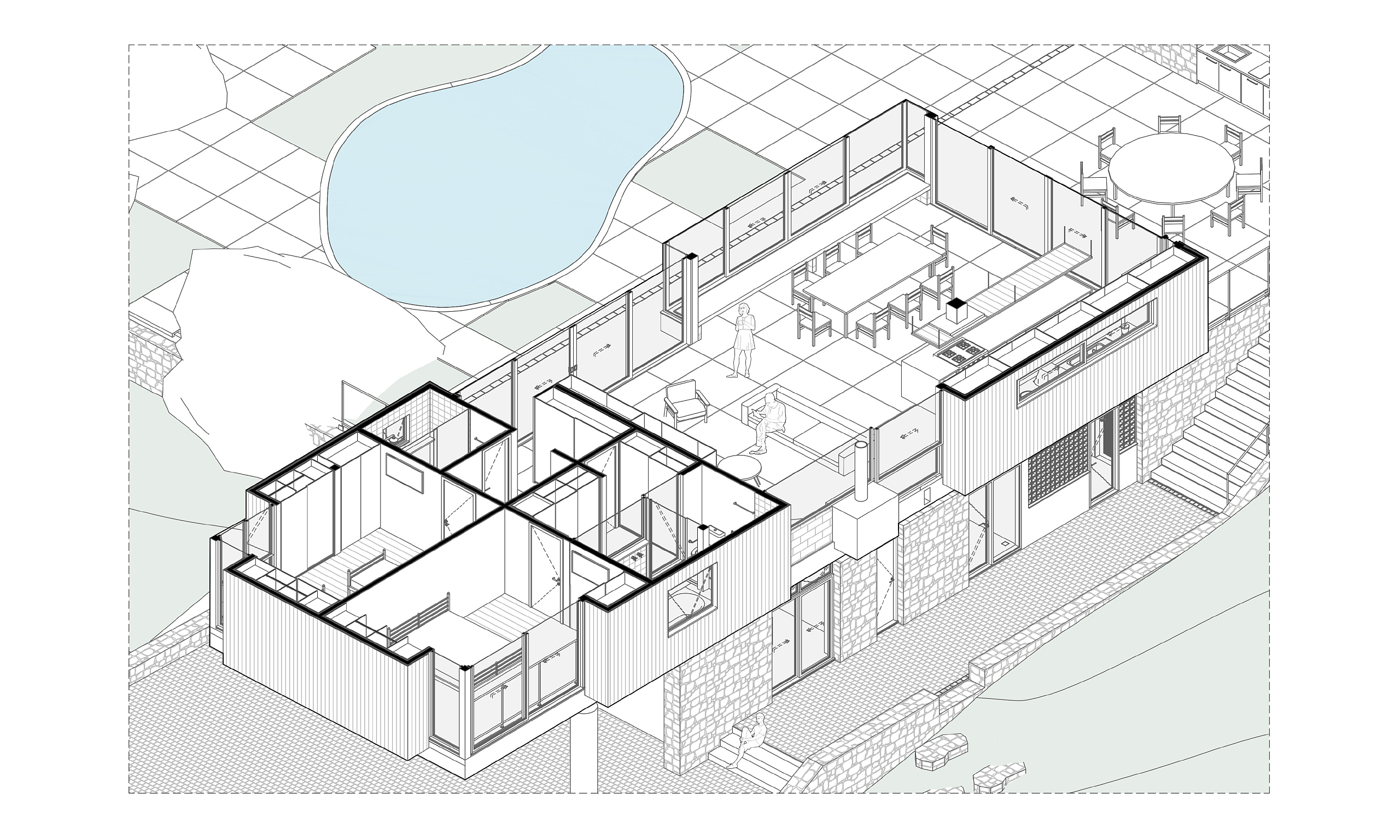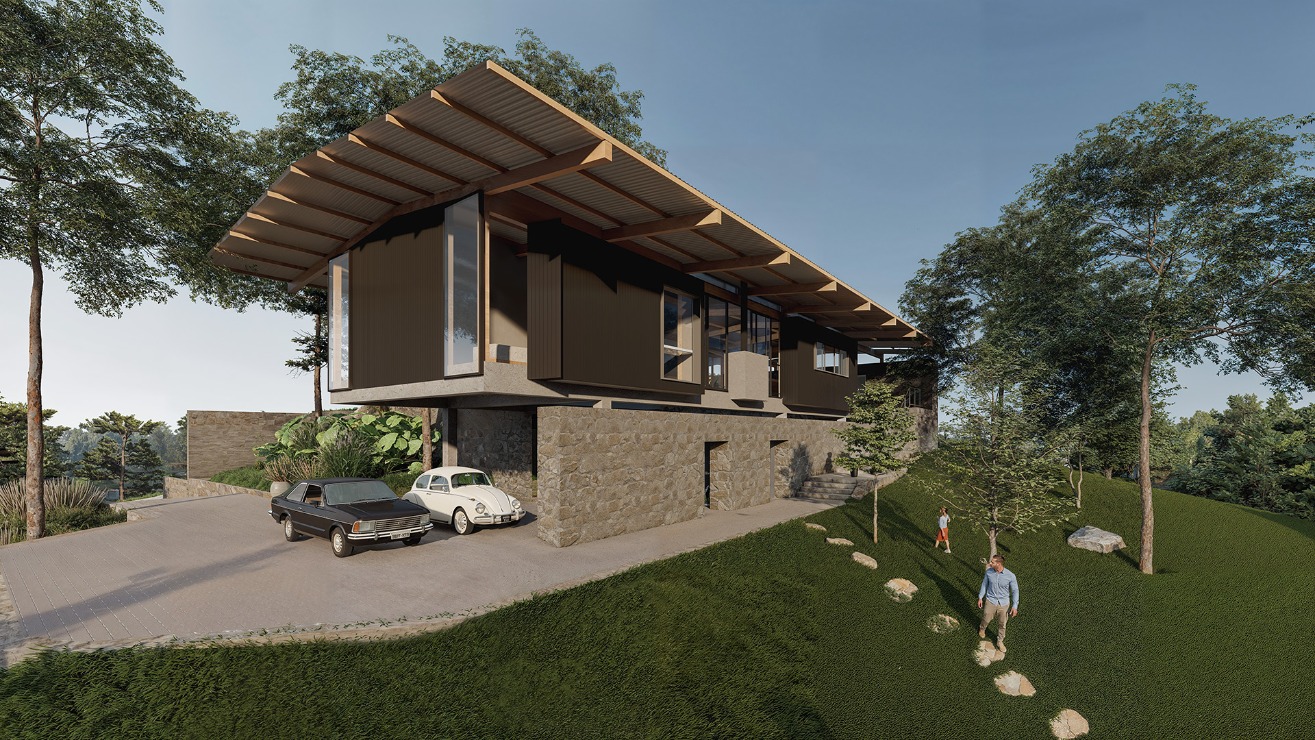 A partir desta premissa, a casa é projetada em dois níveis: o nível superior, aberto para o platô, com piscina, área social com churrasqueira, cozinha e sala de estar e janta, e os dois quartos do casal. Este pavimento superior é construído com uma estrutura de madeira que conforma um telhado de duas águas e amplos beirais. No pavimento inferior foram posicionados a garagem, quarto de hóspedes e áreas técnicas. Sua estrutura é mista, com paredes de arrimo de pedras, reaproveitadas do próprio terreno e com uma laje nervurada de concreto armado. O contraste entre estas diferentes partes faz com que a casa busque ao mesmo tempo se enraizar no solo natural e flutuar em busca da vista e do sol.
