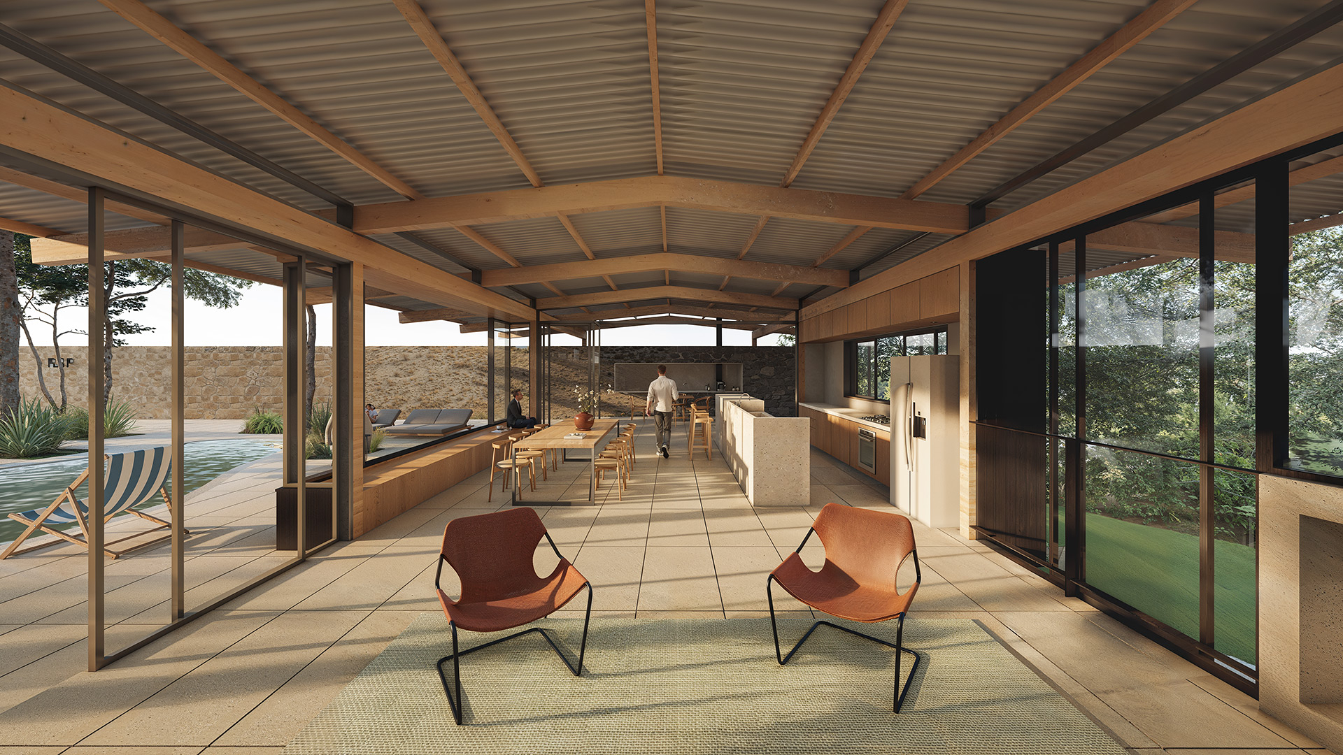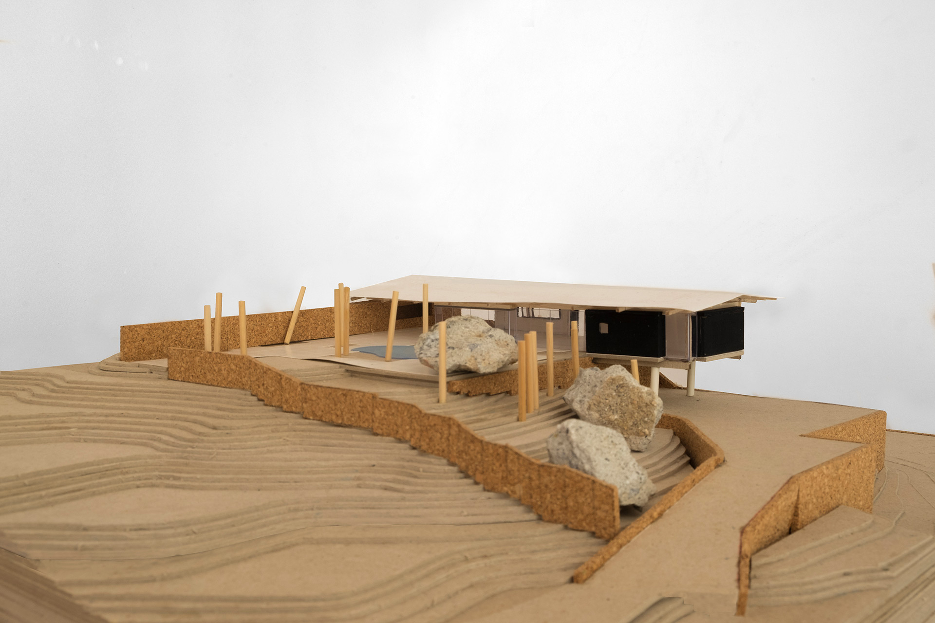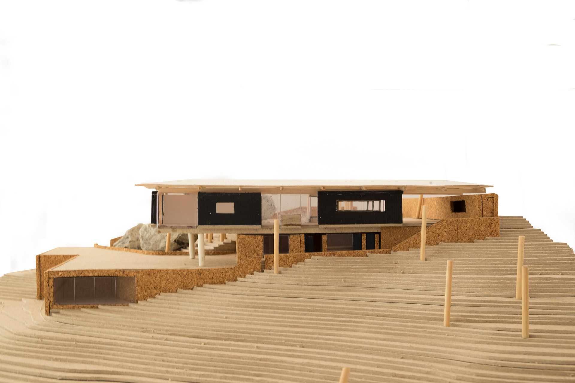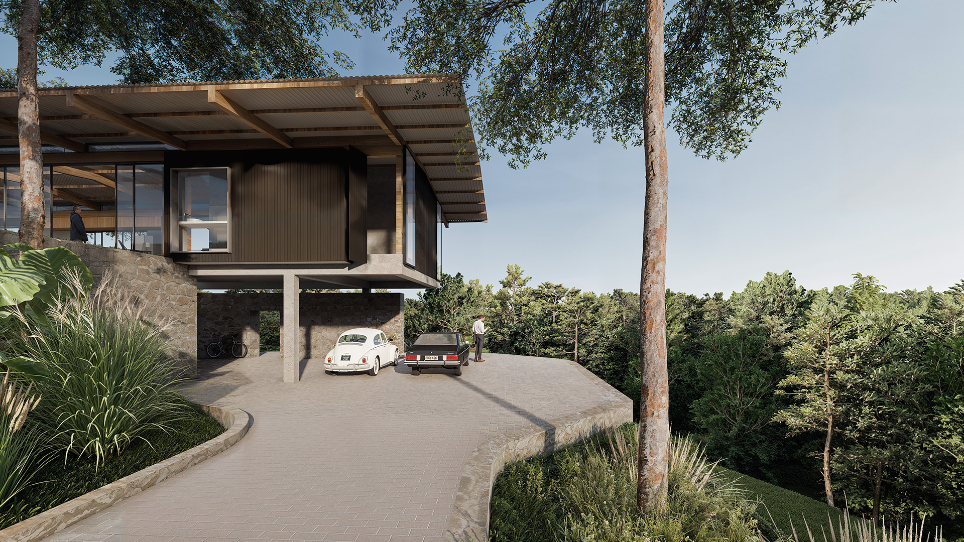 A partir desta premissa, a casa é projetada em dois níveis: o nível superior, aberto para o platô, com piscina, área social com churrasqueira, cozinha e sala de estar e janta, e os dois quartos do casal. Este pavimento superior é construído com uma estrutura de madeira que conforma um telhado de duas águas e amplos beirais. No pavimento inferior foram posicionados a garagem, quarto de hóspedes e áreas técnicas. Sua estrutura é mista, com paredes de arrimo de pedras, reaproveitadas do próprio terreno e com uma laje nervurada de concreto armado. O contraste entre estas diferentes partes faz com que a casa busque ao mesmo tempo se enraizar no solo natural e flutuar em busca da vista e do sol.