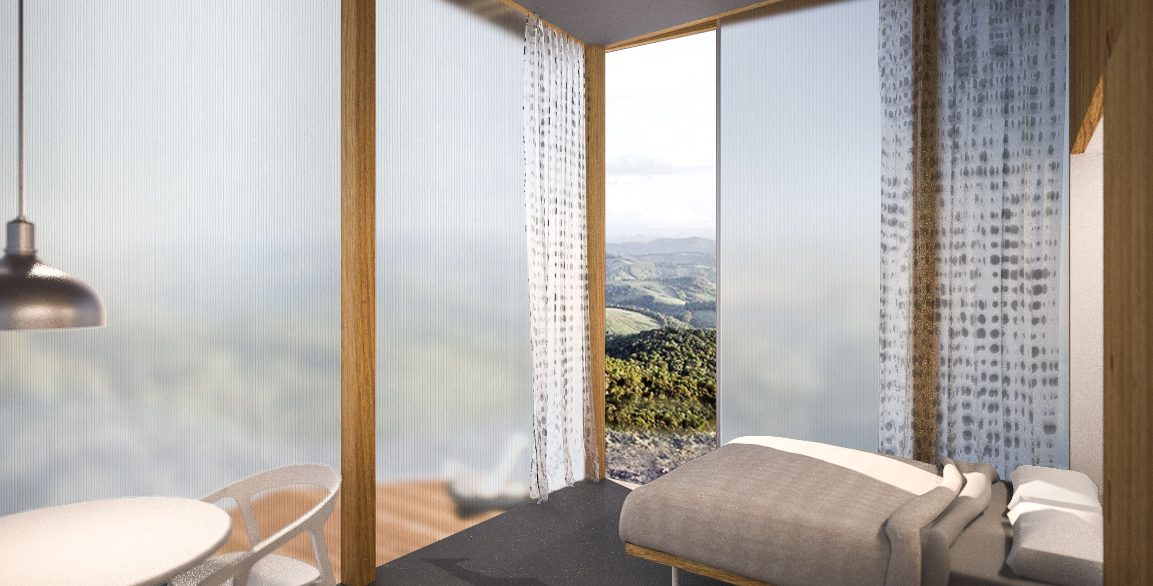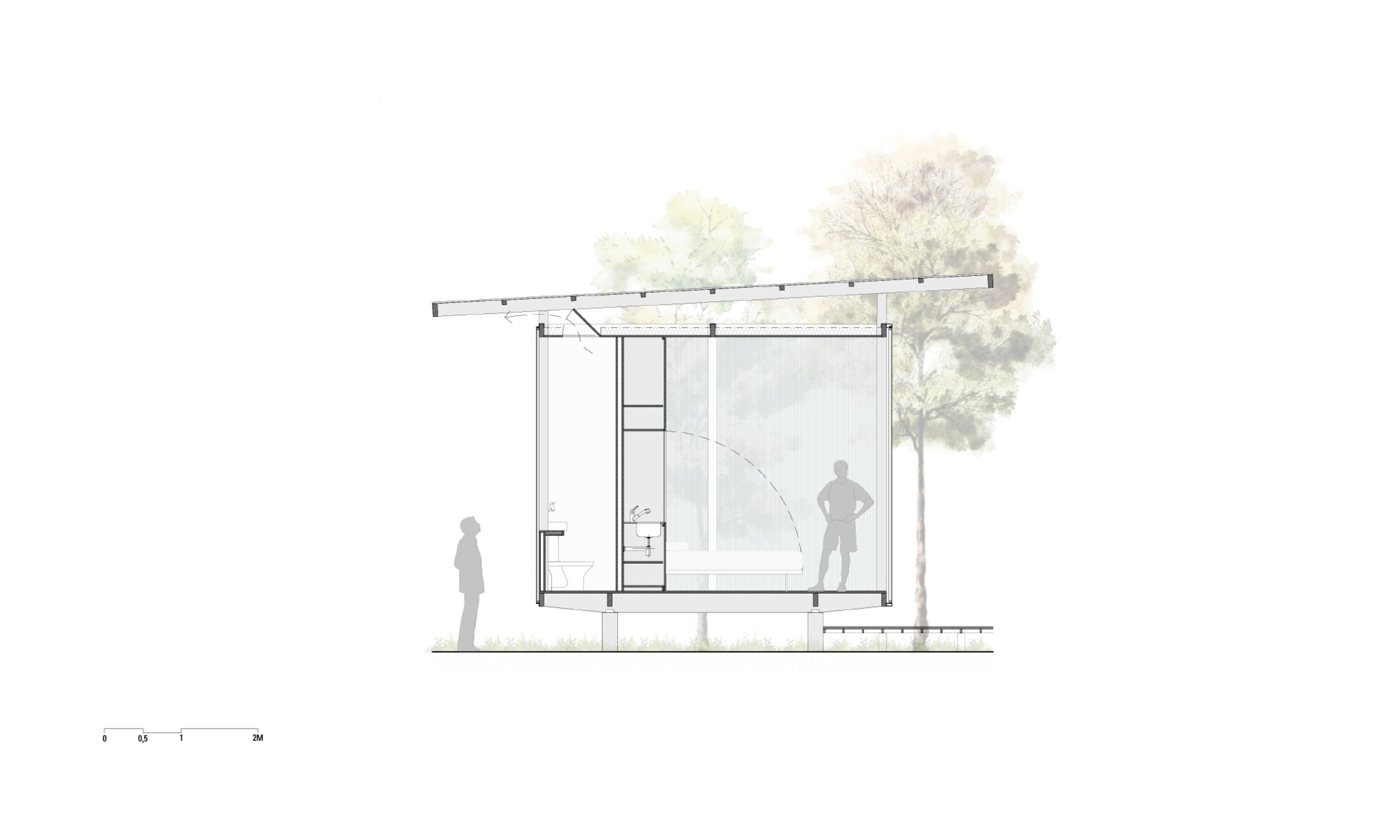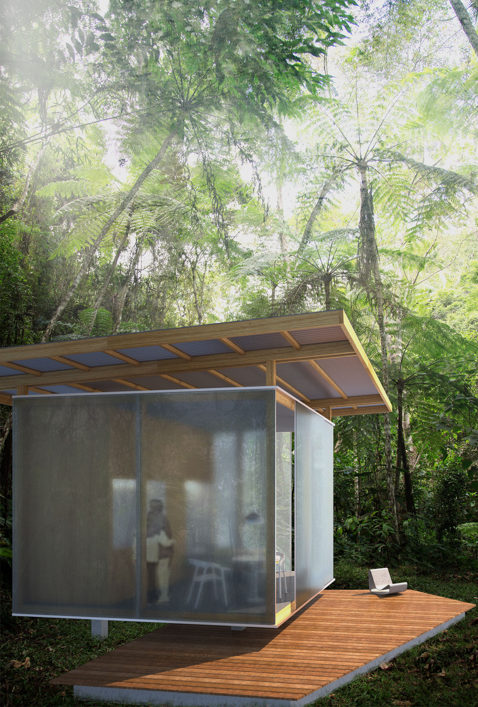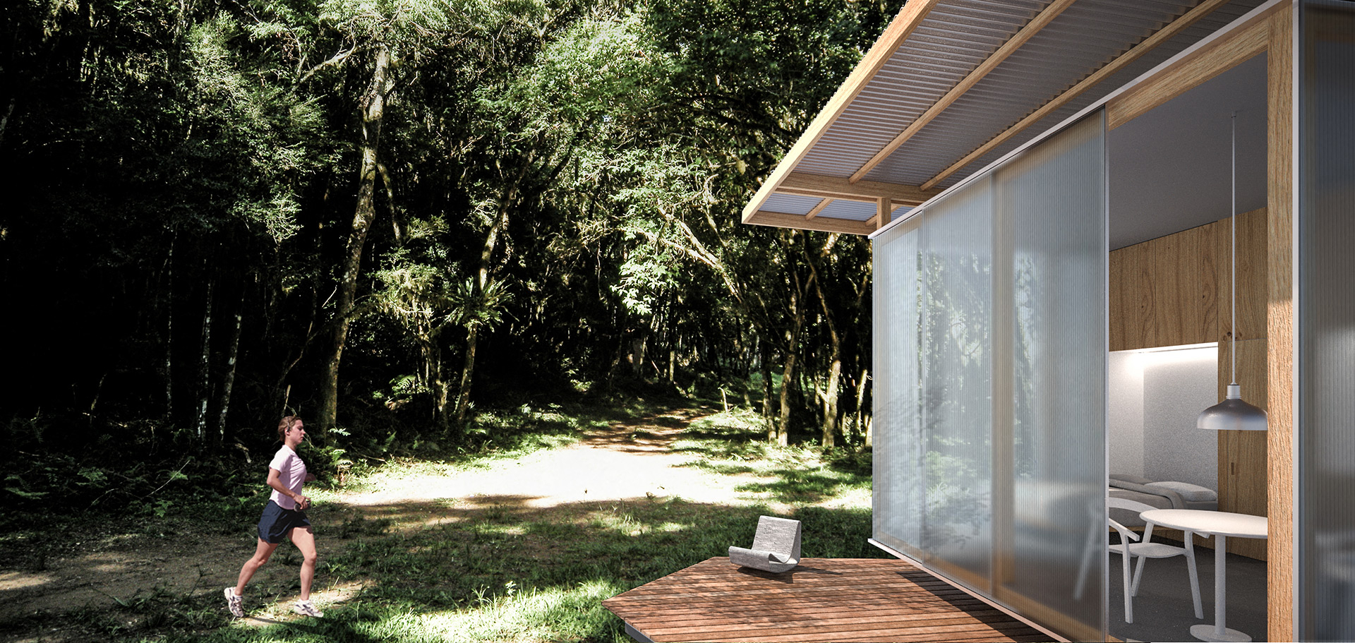 Estas cabanas em São Francisco Xavier foram idealizadas de forma a combinar duas experiências diferentes de contato com a natureza, por um lado o conforto dos refúgios de montanhas e por outro o contato direto das barracas de acampamento. A solução proposta para estas pequenas habitações combina o conforto de um banheiro, uma cozinha e uma cama casal bem equipados com uma fachada fina e leve em policarbonato, de modo a colocar em debate este tênue limite entre o externo e o interno, intimidade e exterioridade. A luz, as sombras, os ruídos externos adentram o ambiente da cabana pondo em diálogo a proteção do refúgio com a experiência sensorial da barraca. Do lado reverso, de noite, a luz emitida de dentro das cabanas e filtrada pela suas fachadas torna presente o conjunto delas que em ressonância com a névoa característica da mata atlântica criam uma atmosfera singular e iluminam o seu entorno , lembrando pequenos lampiões na grande mata de São Francisco Xavier.