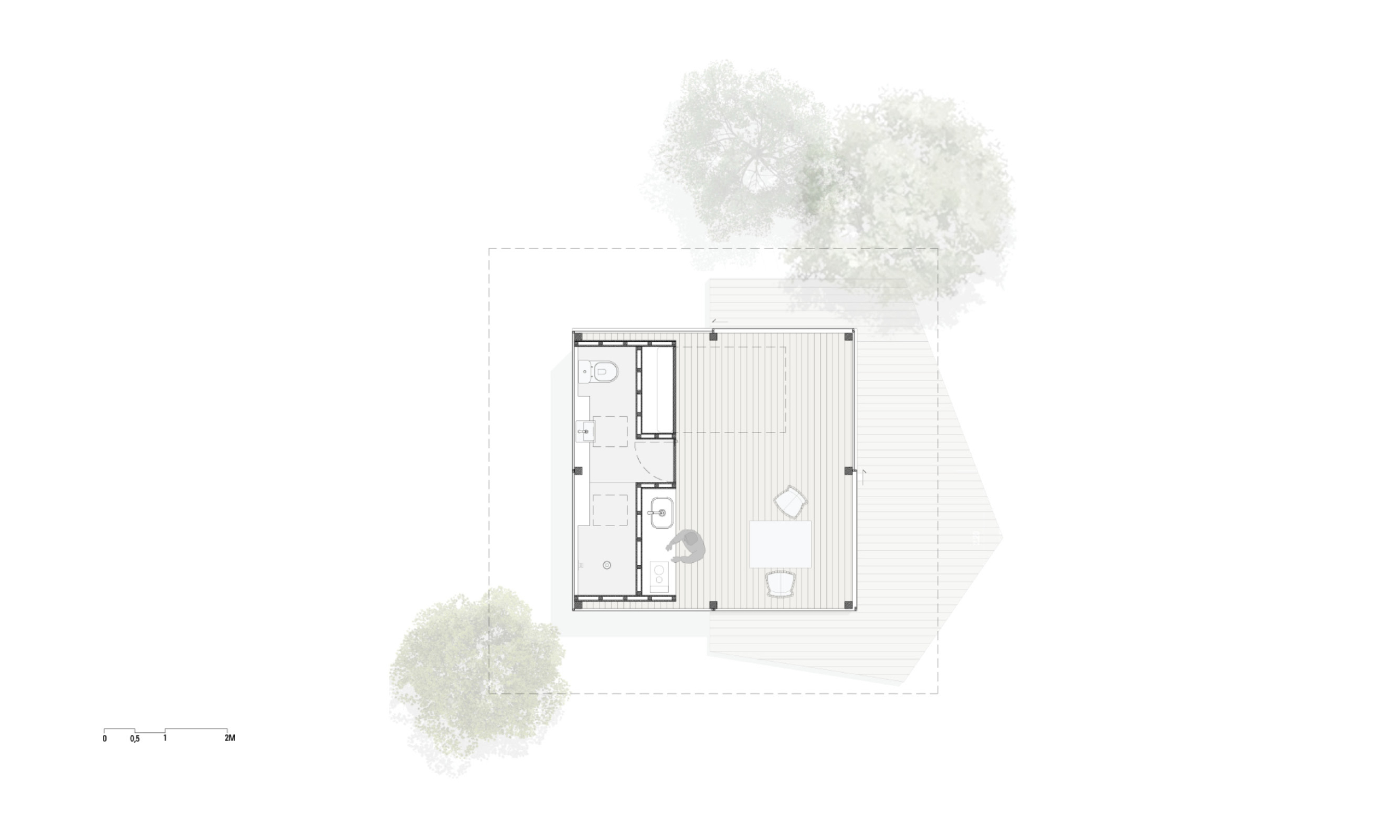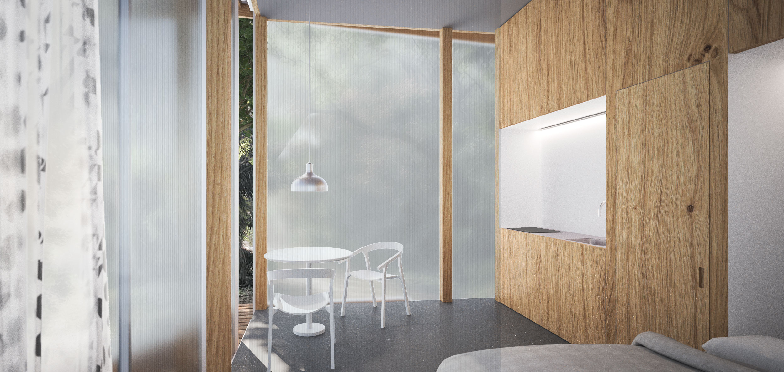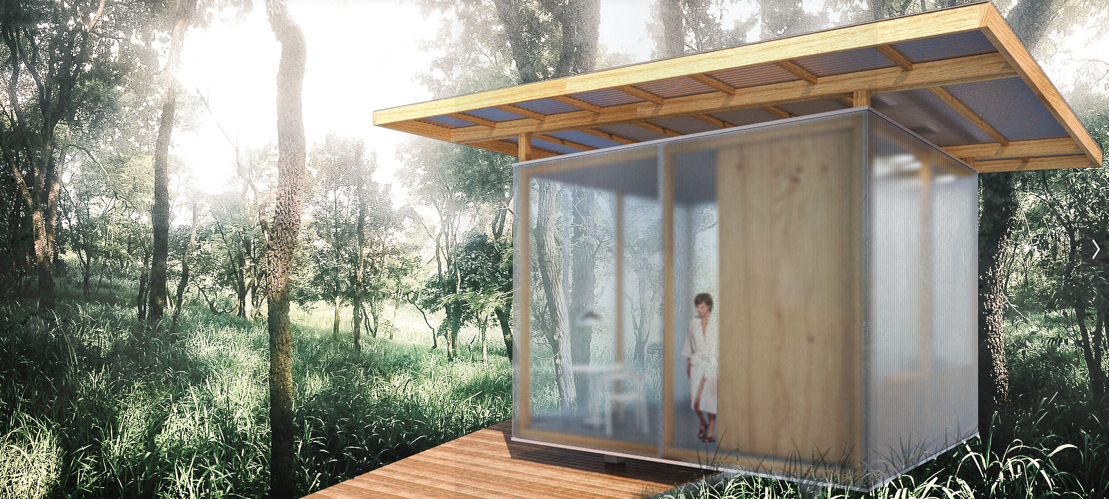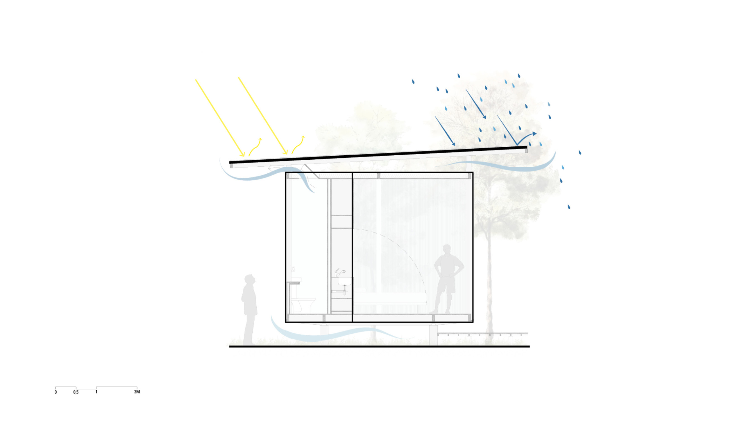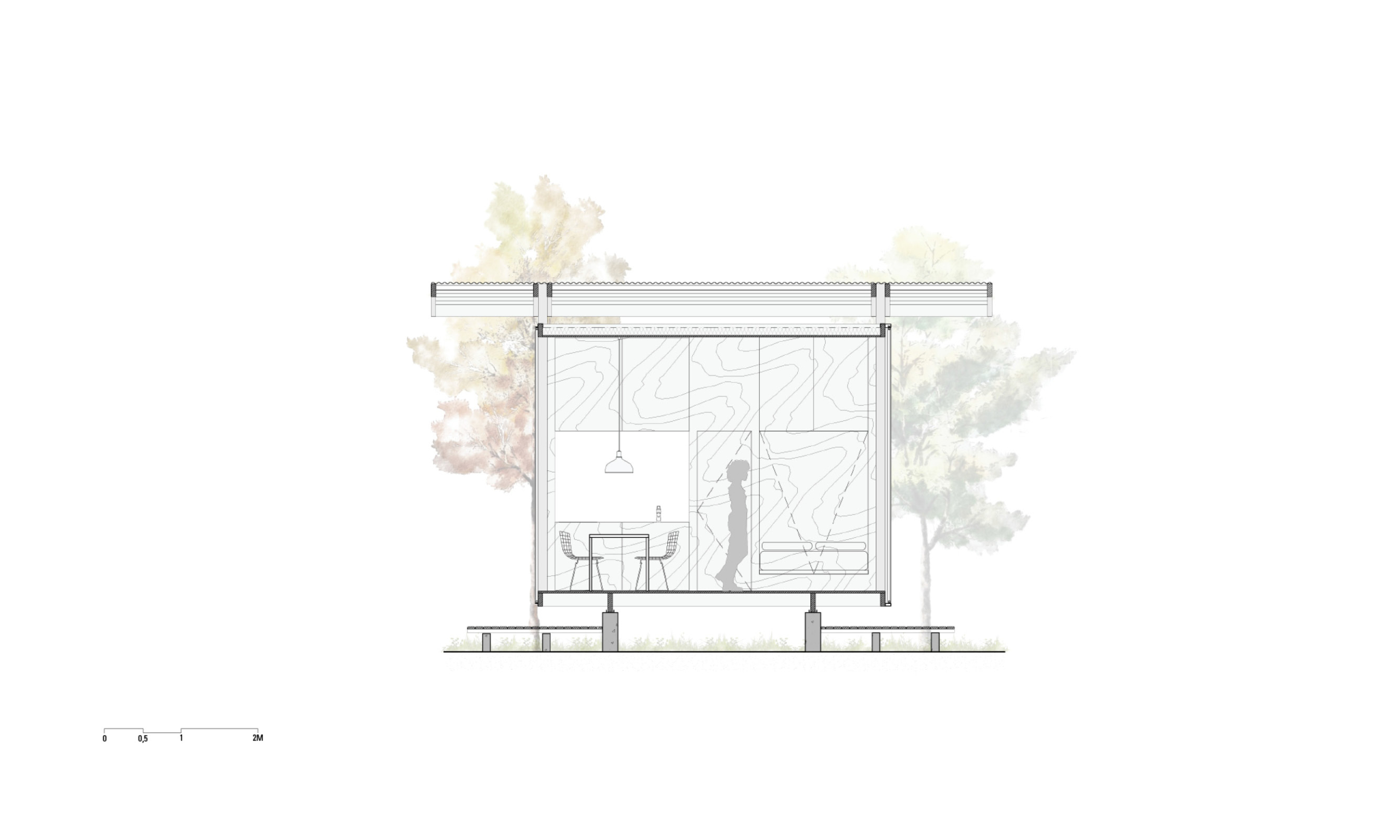 Estas cabanas em São Francisco Xavier foram idealizadas de forma a combinar duas experiências diferentes de contato com a natureza, por um lado o conforto dos refúgios de montanhas e por outro o contato direto das barracas de acampamento. A solução proposta para estas pequenas habitações combina o conforto de um banheiro, uma cozinha e uma cama casal bem equipados com uma fachada fina e leve em policarbonato, de modo a colocar em debate este tênue limite entre o externo e o interno, intimidade e exterioridade. A luz, as sombras, os ruídos externos adentram o ambiente da cabana pondo em diálogo a proteção do refúgio com a experiência sensorial da barraca. Do lado reverso, de noite, a luz emitida de dentro das cabanas e filtrada pela suas fachadas torna presente o conjunto delas que em ressonância com a névoa característica da mata atlântica criam uma atmosfera singular e iluminam o seu entorno , lembrando pequenos lampiões na grande mata de São Francisco Xavier.